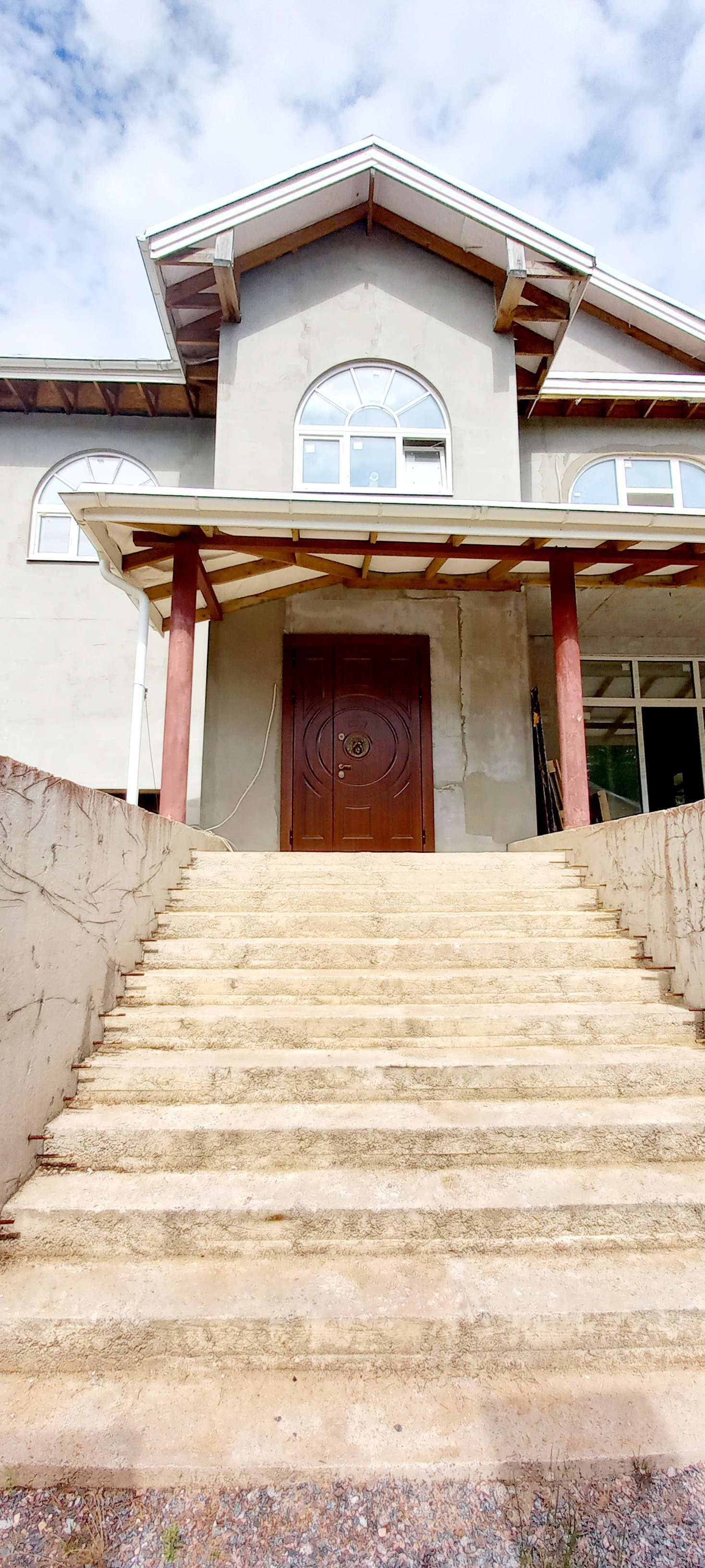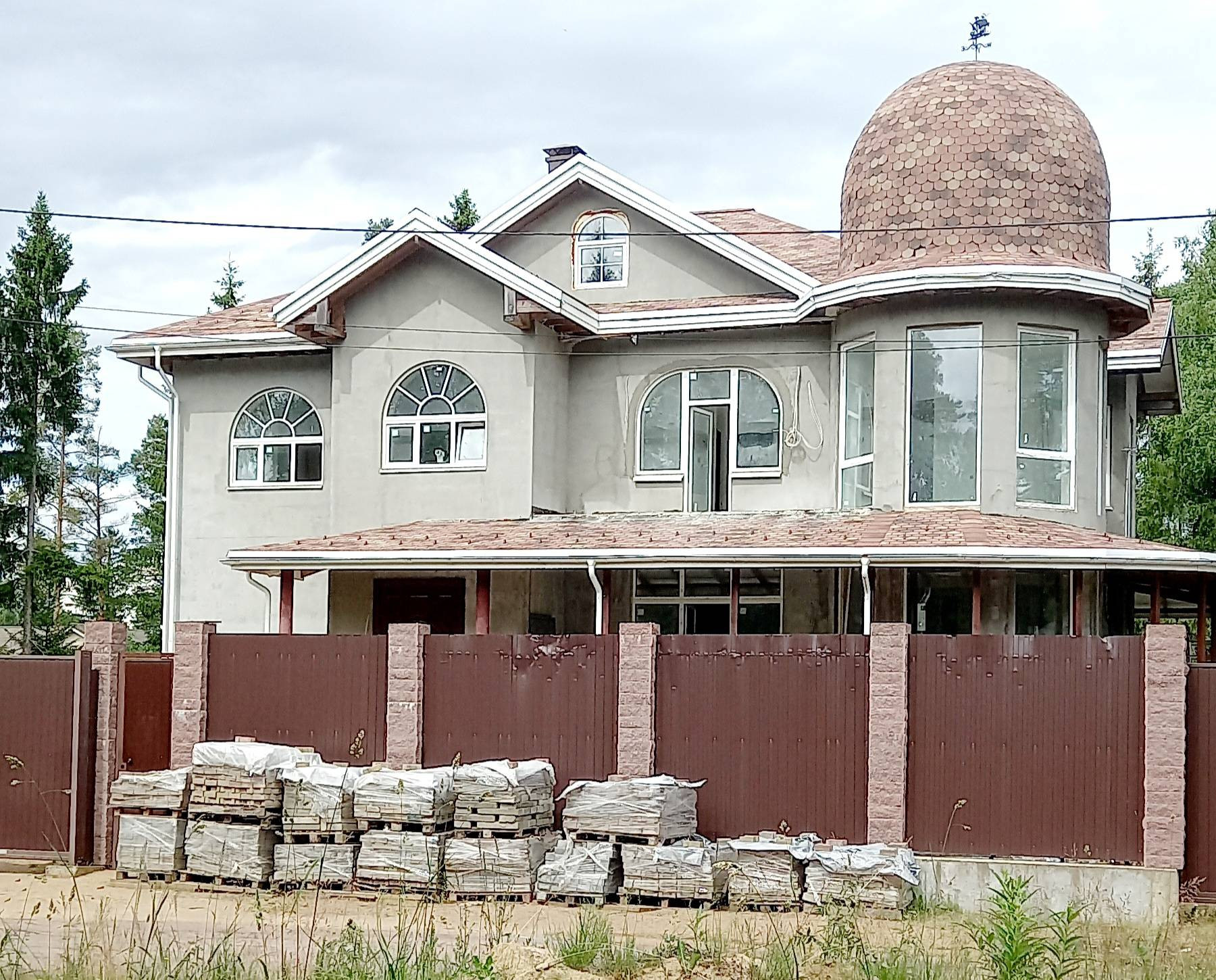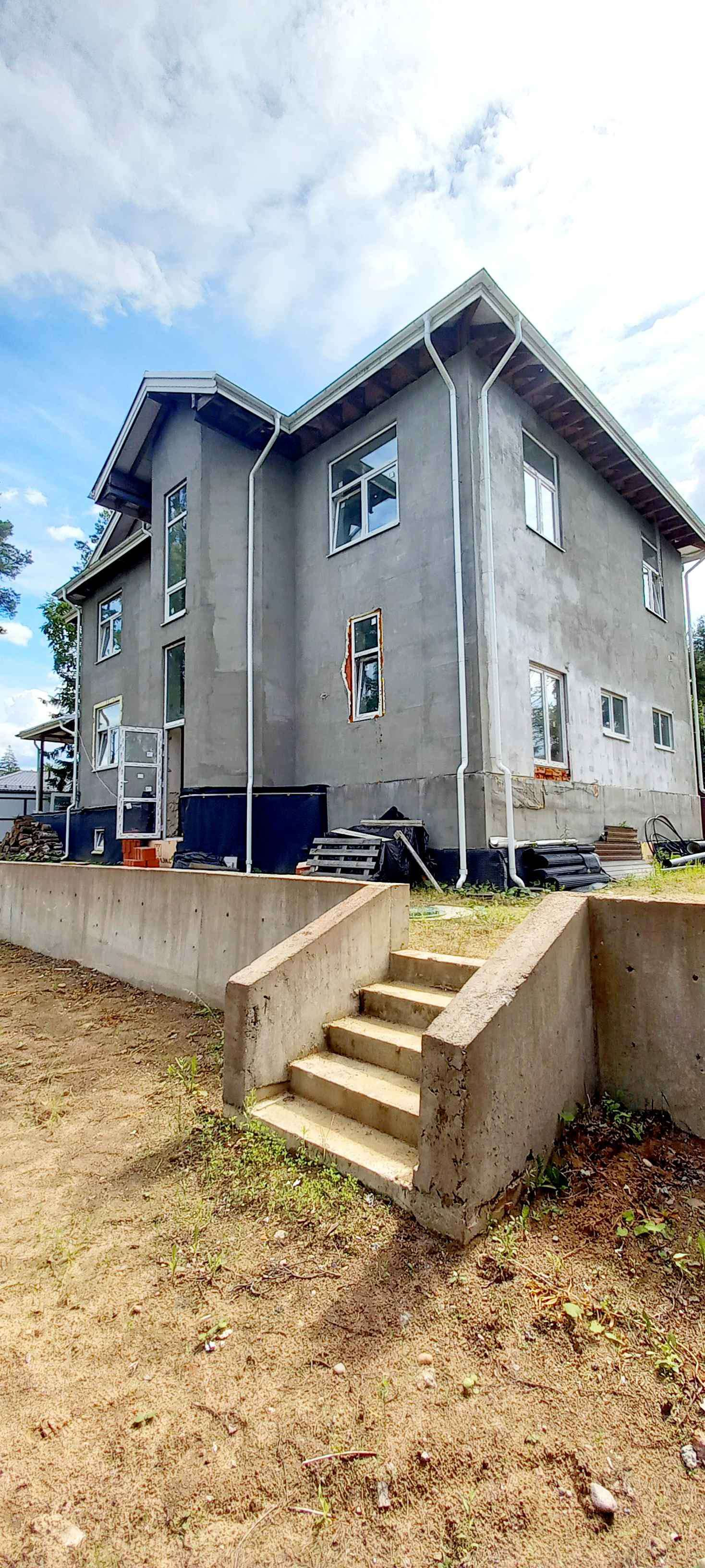 Фасад дома утеплен пеноплексом. В доме сделана вся разводка коммуникаций, частично выполнена чистовая отделка, закуплены материалы и сантехника, сделана лепнина, установлен действующий мраморный камин, лестница с облицовкой из натурального мрамора.