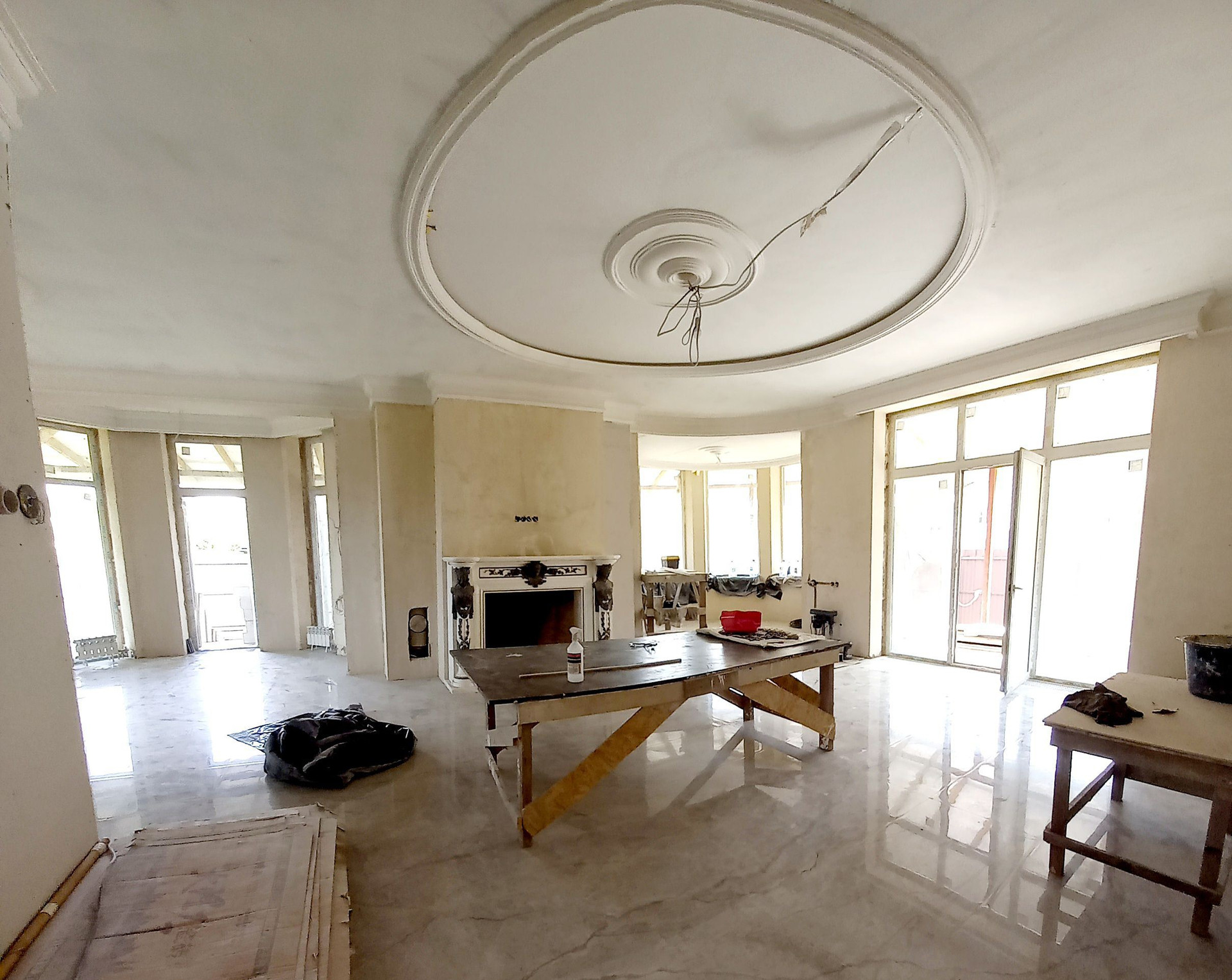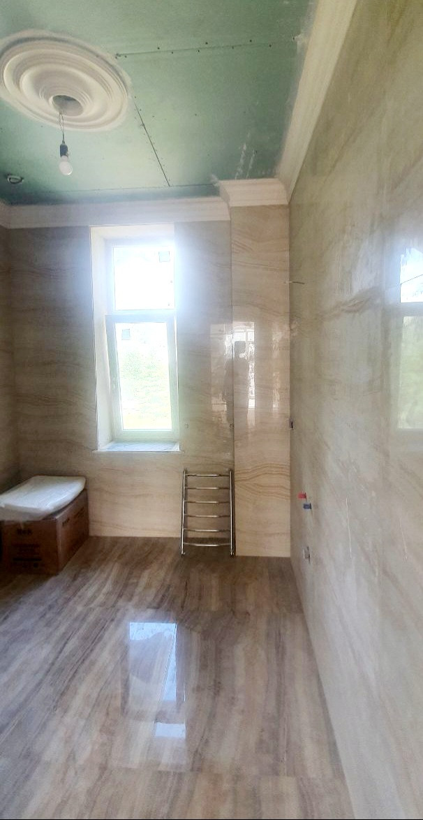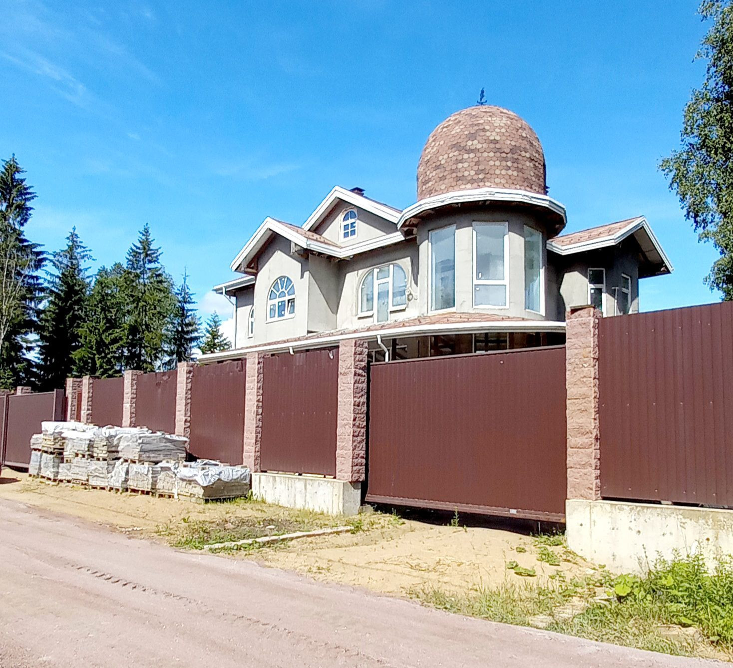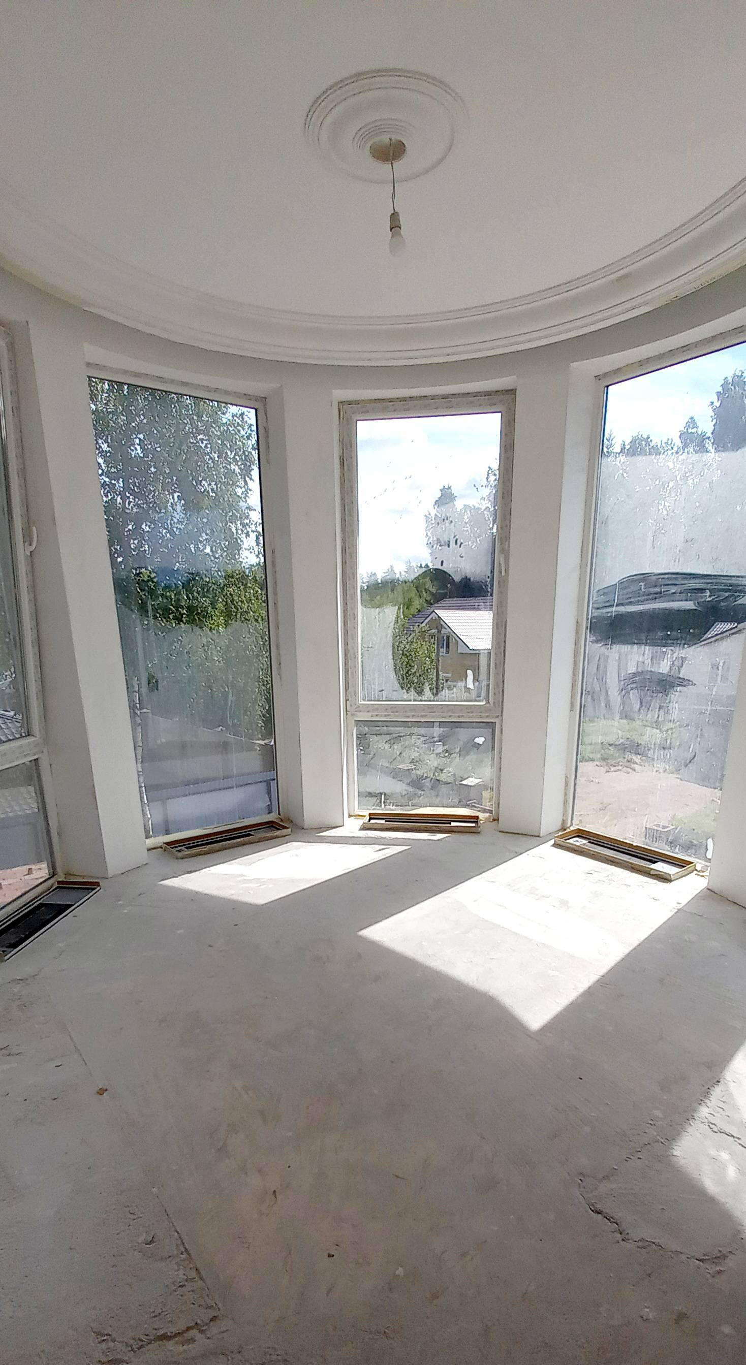 Фасад дома утеплен пеноплексом. В доме сделана вся разводка коммуникаций, частично выполнена чистовая отделка, закуплены материалы и сантехника, сделана лепнина, установлен действующий мраморный камин, лестница с облицовкой из натурального мрамора.