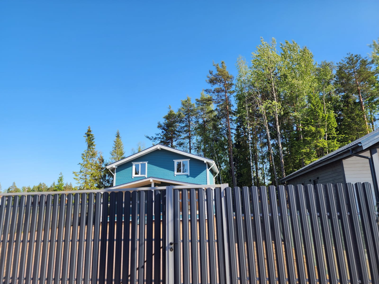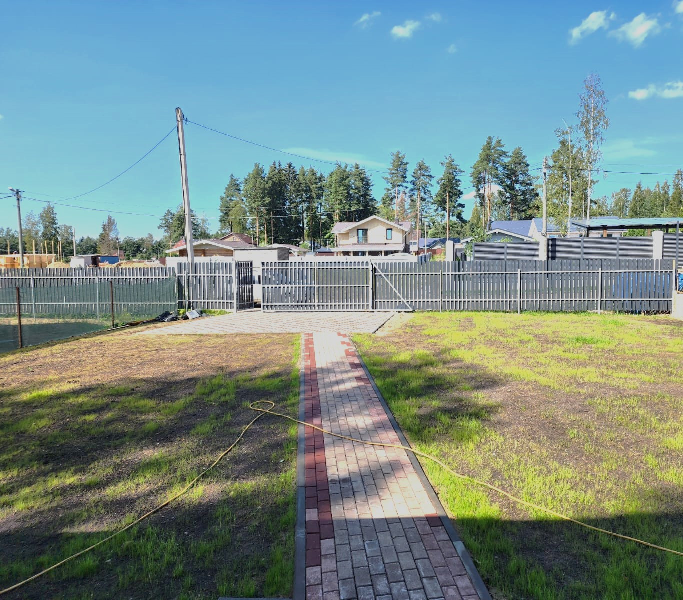Участок поднят, огорожен, на участке сделаны дорожки и засеяна газонная трава. На възде откатные ворота и ограждение из металлической евровагонки.
