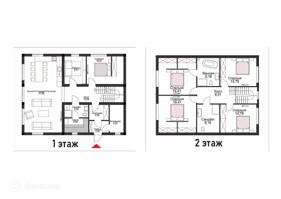 На втором этаже: Мастер спальня со своей гардеробной и ванной комнатой, спальня с гардеробной, две детские комнаты и отдельная ванная для детей.