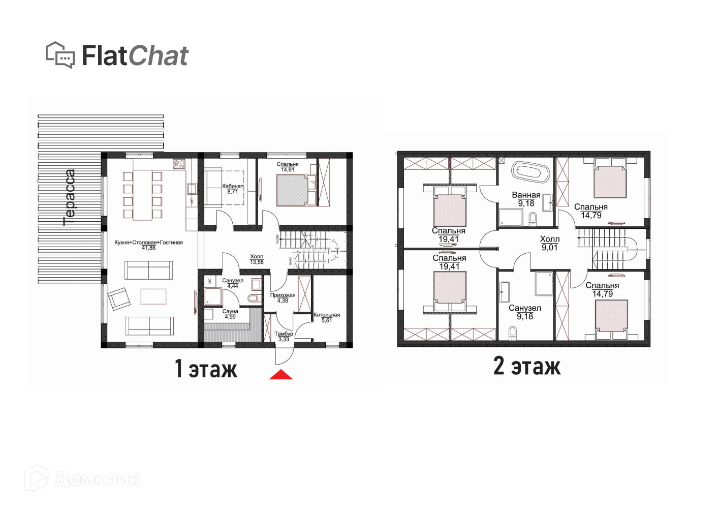 На втором этаже: Мастер спальня со своей гардеробной и ванной комнатой, спальня с гардеробной, две детские комнаты и отдельная ванная для детей.