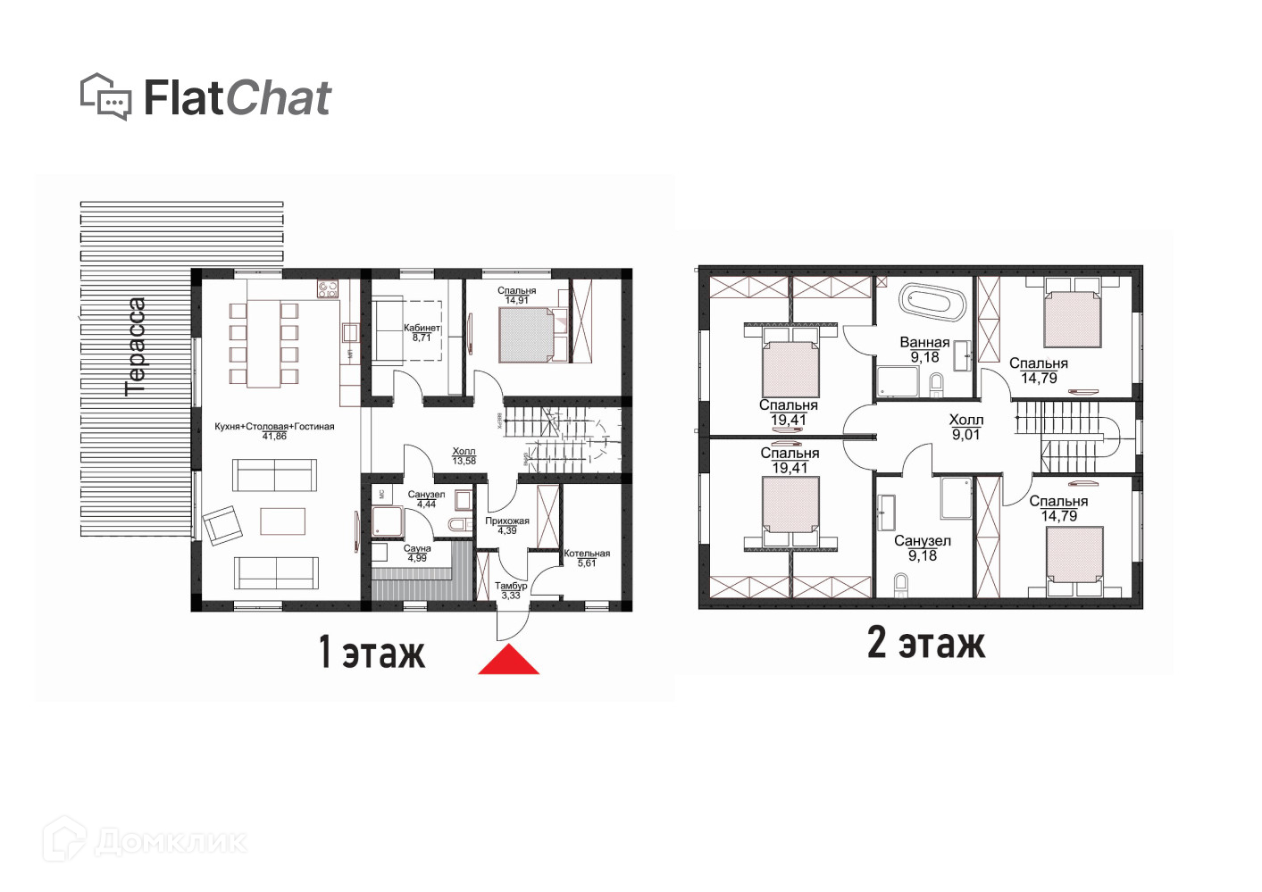 На втором этаже: Мастер спальня со своей гардеробной и ванной комнатой, спальня с гардеробной, две детские комнаты и отдельная ванная для детей.