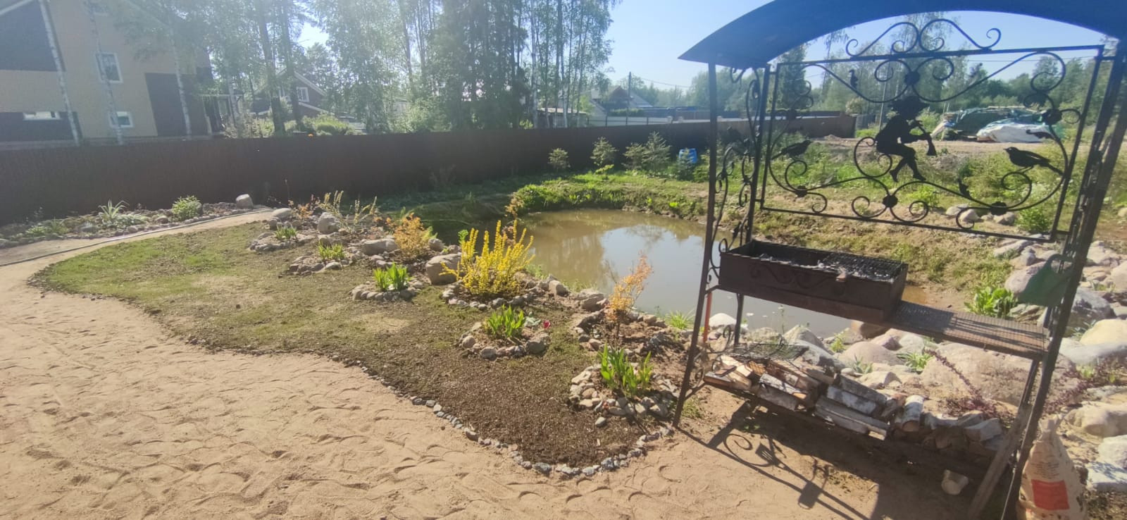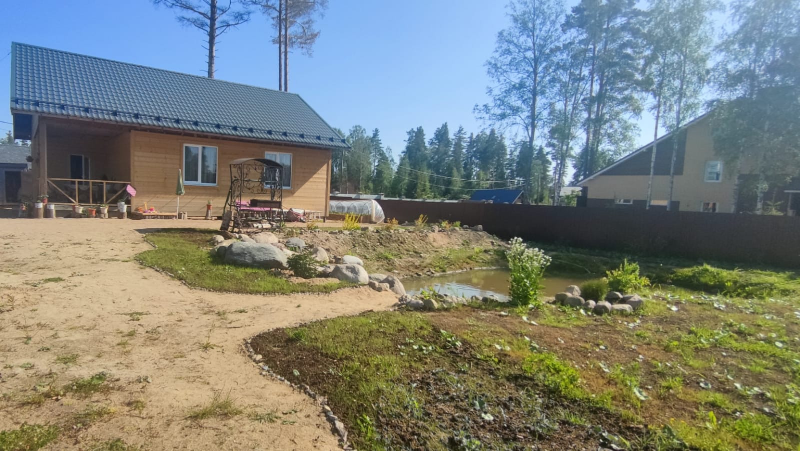-Участок разработанный, сухой(поднят), ровный. Есть небольшой водоемчик.