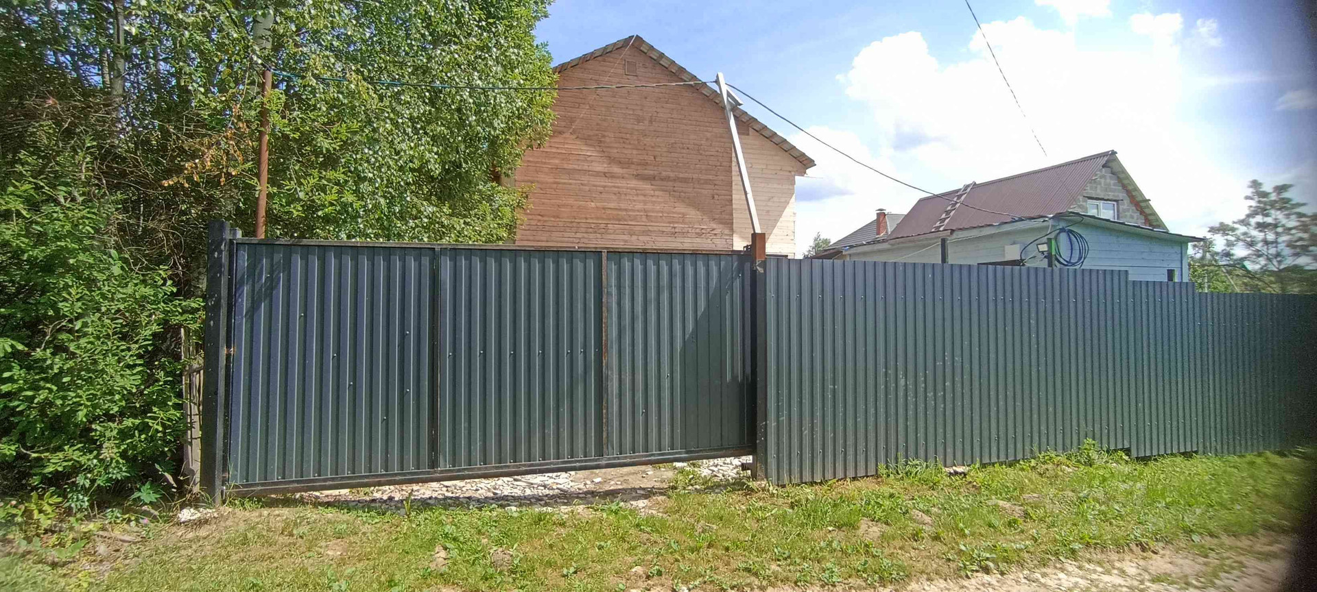 По лицевой стороне забор профлист + откатные ворота. Электричество заведено на участок 3 фазы. Колодец 9 колец. Также в конце участка есть небольшой сарай.