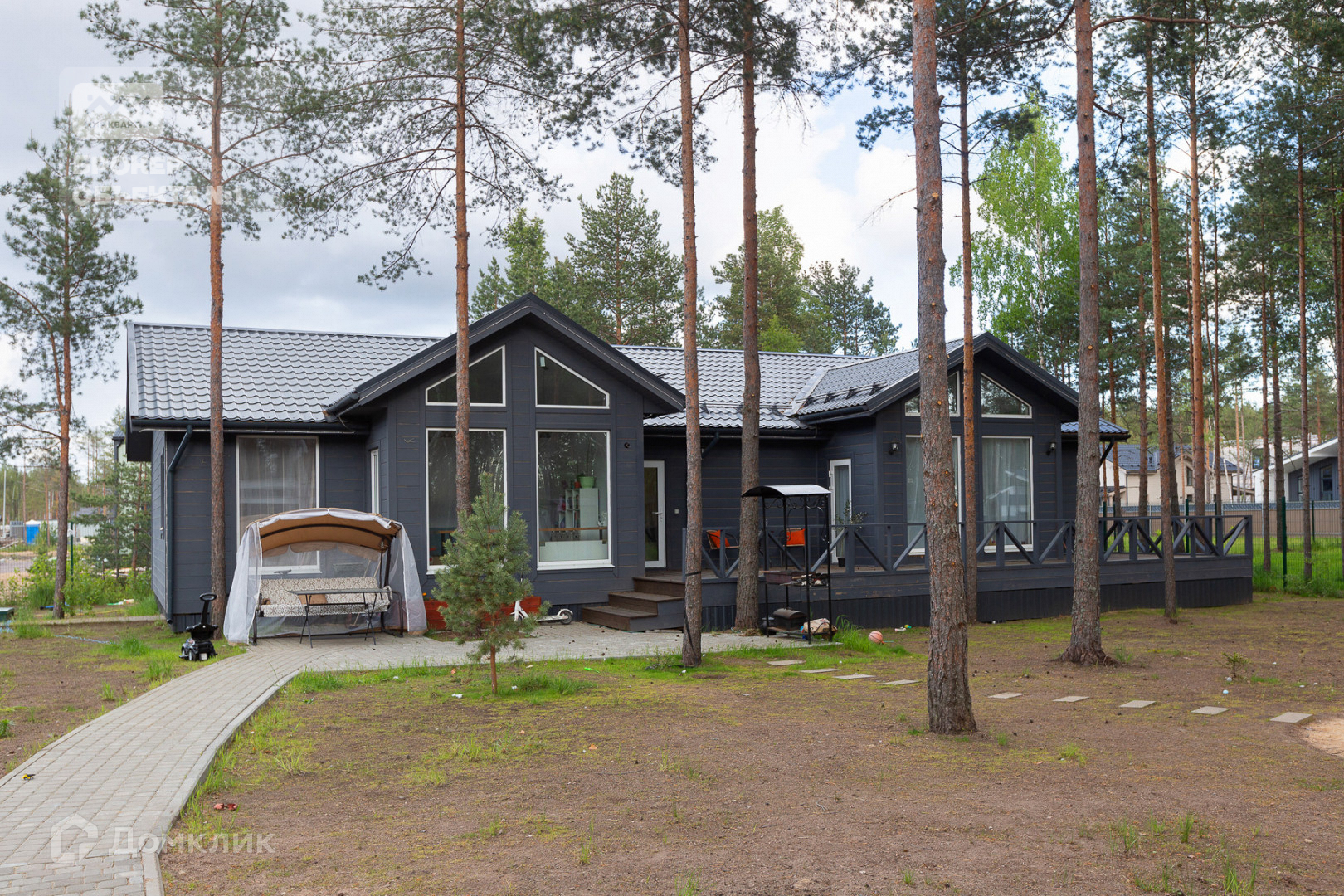 Наш дом общей площадью 191 кв.м. расположился на участке 12 соток с большим количеством вековых сосен. Выполнено мощение тротуарной плиткой.
