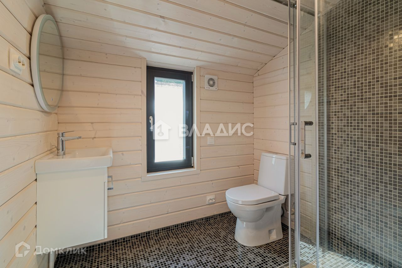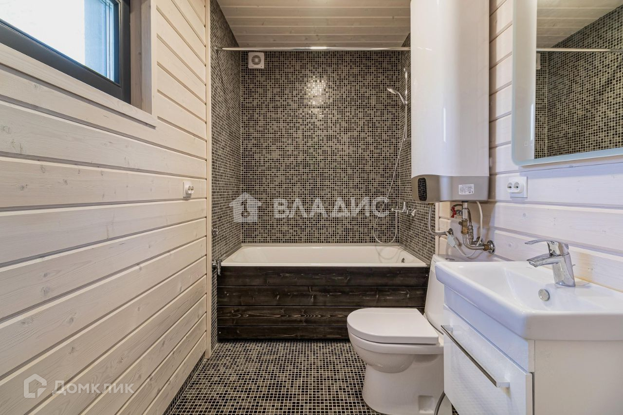 В ванной комнате: мозаичная плитка, теплые полы, чугунная ванна, смеситель, унитаз, раковина с тумбой, зеркало с подсветкой, бойлер (скрыт в шкафчик под потолком), вытяжка, фильтр грубой очистки. Окошко открывается на откидное положение.