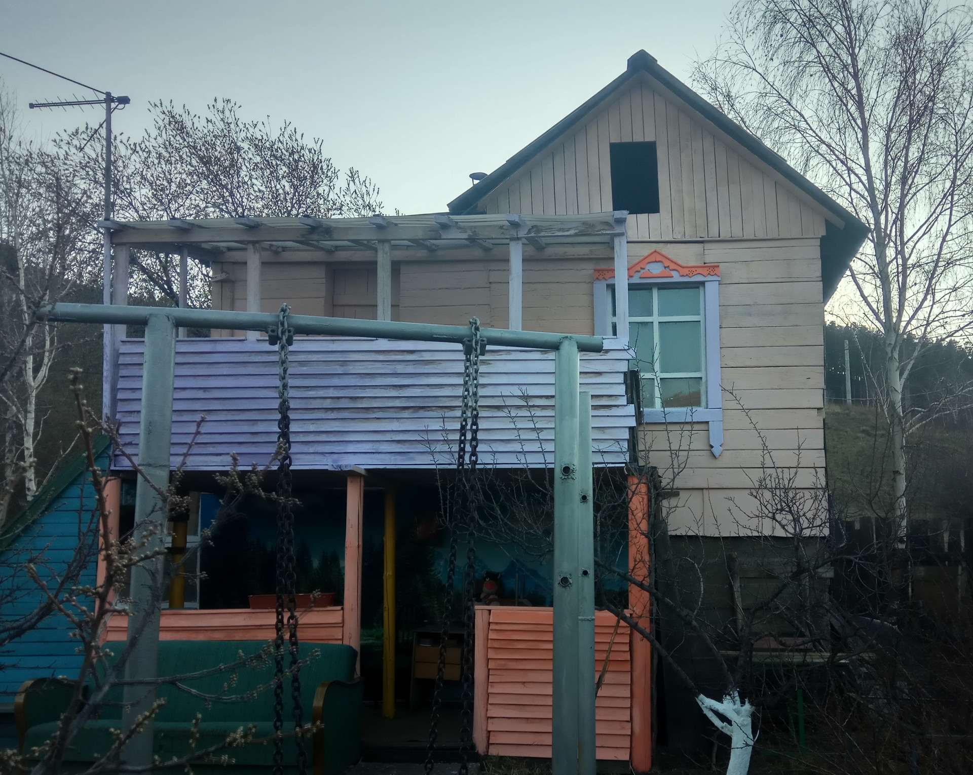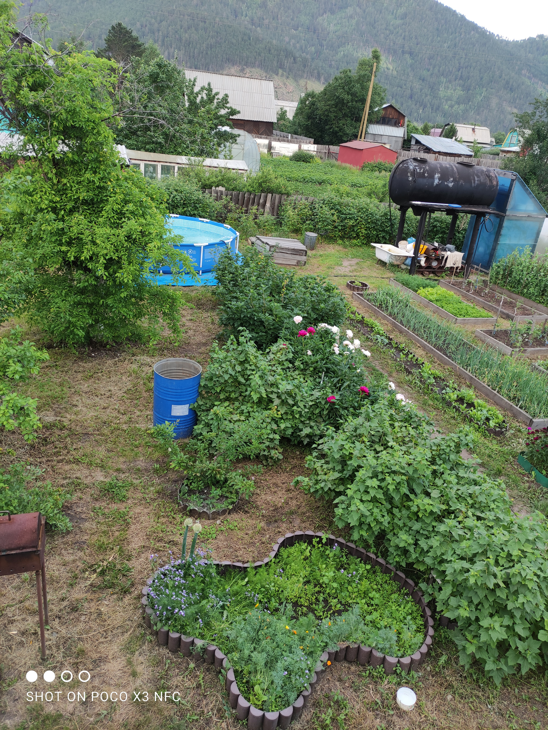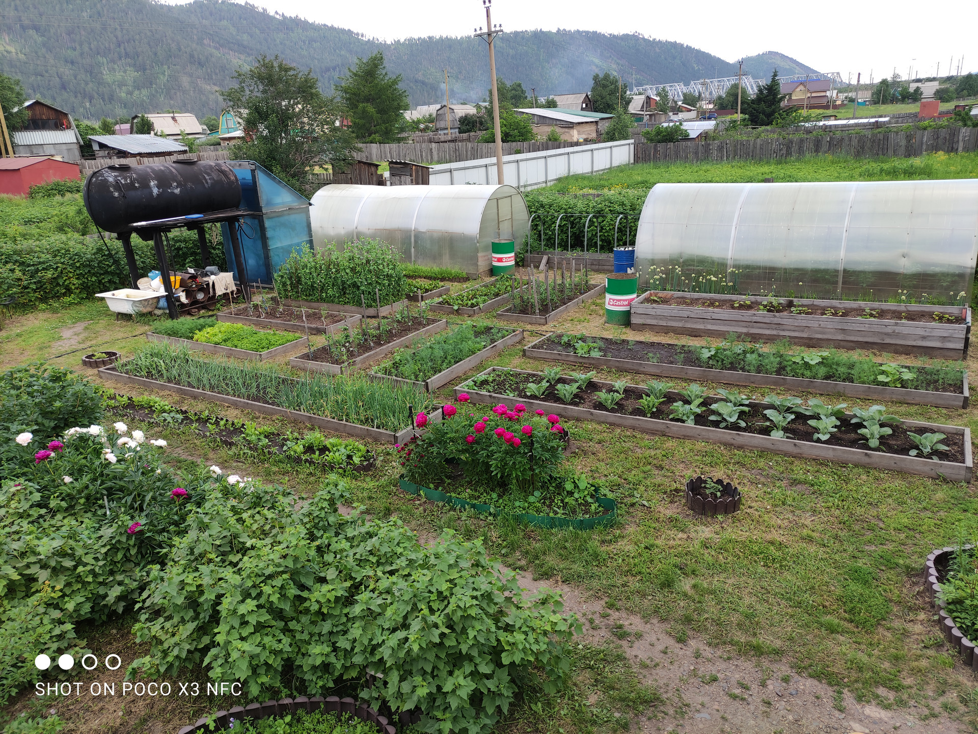 2 теплицы, 2 парника, каркасный бассейн, душ (с горячей водой), емкость для воды, гряды, цветники, курятник, компостер, беседка, качели, турники, картофельное поле.