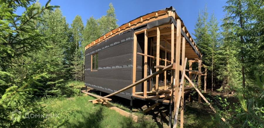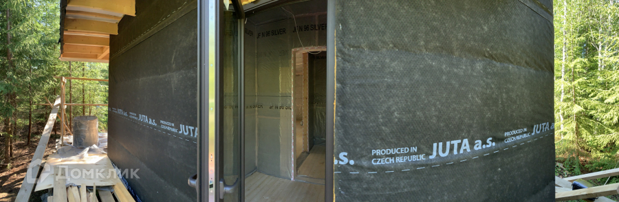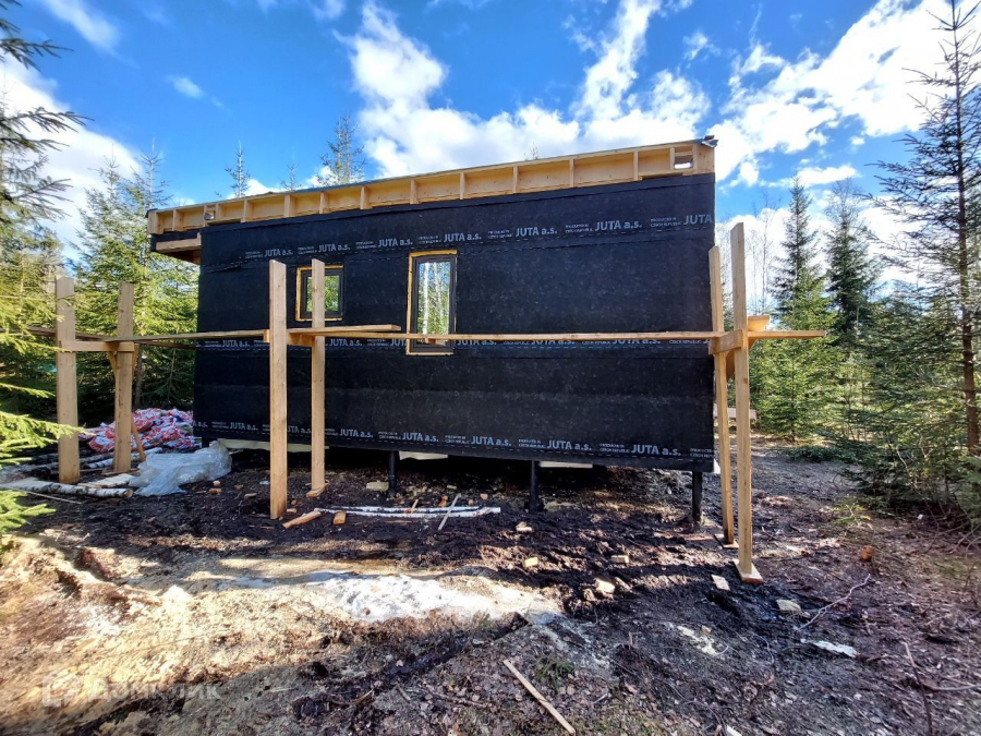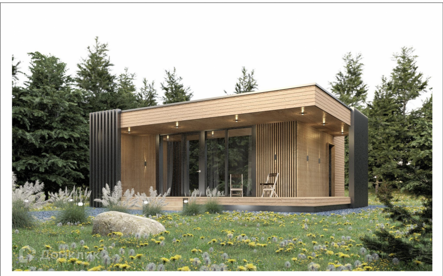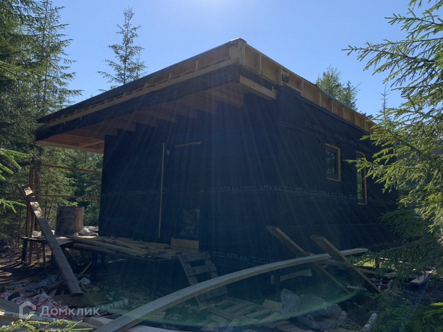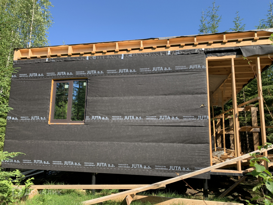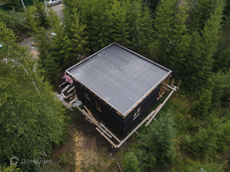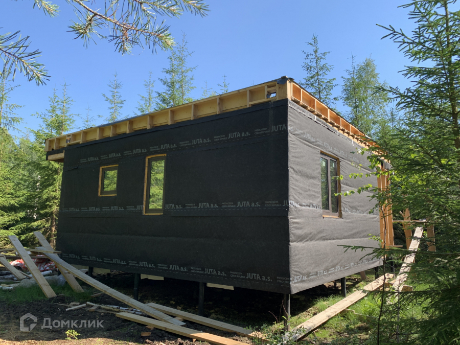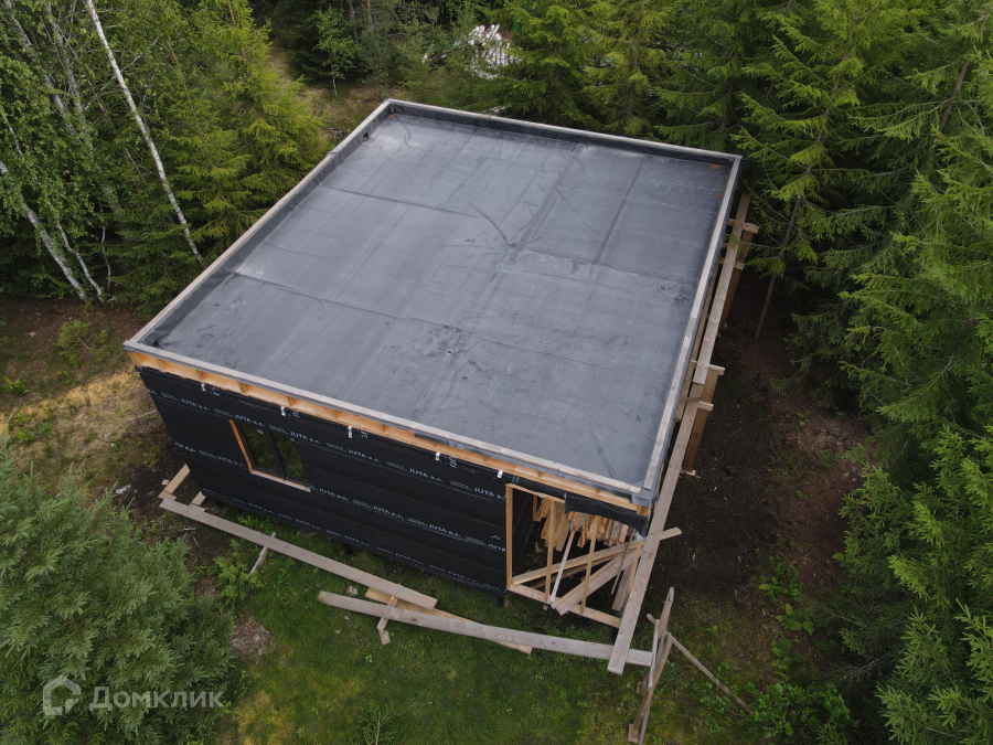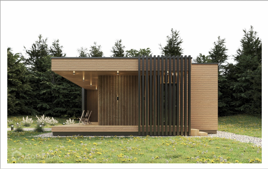 Дом одноэтажный стоит на свайно-винтовом фундаменте. Крыша плоская, покрыта EPDM-мембраной. Стены из бруса, утеплены качественными и теплым утеплителем ISOROC. Пленки гидро-, ветро-, пароизоляции чешского производства. Окна энергосберегаемые в алюминиевом профиле. Делали под заказ в рамках проекта дома. Планировка включает в себя: тамбур, холл, совмещенный с/у, спальня, кухня-гостиная, из которой идет выход на большую террасу с видом на лес. На участке при въезде сделана парковка на 3 машины, также установлен био-туалет.