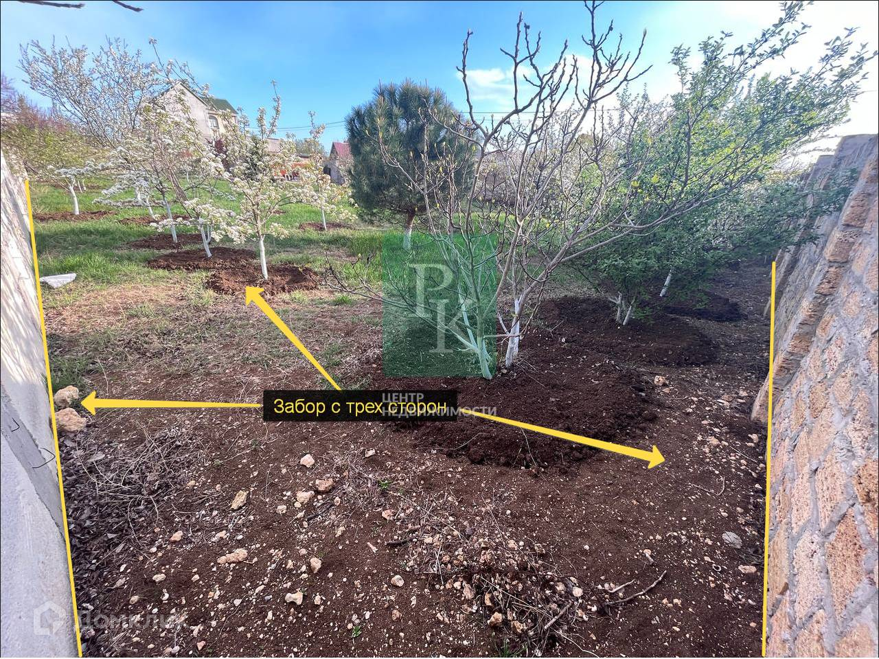 Участок с трех сторон огорожен капитальным забором из камня.