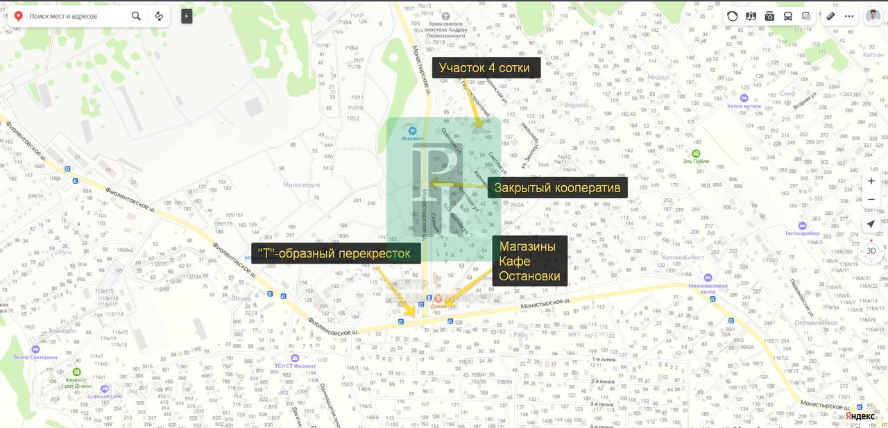 Участок находится развивающемся районе, поблизости со всей необходимой для жизни инфраструктурой. За 6 минут пешим шагом вы дойдете до ближайшего магазина, за 9 минут на машине вы доберетесь до рынка, многочисленных магазинов, аптек и других необходимых социальных объектов района “5-й км” и доберетесь в любую точку города, благодаря отличной транспортной развязке. За 25-30 минут можно доехать до центра города.
