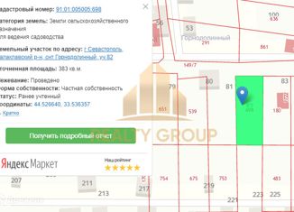 Участок 8,3 сотки СТ Участок 8,3 сотки (СТ) расположен в г. Севастополь, ТСН СНТ “Горнодолинный”. Участок просторный, с уклоном. Подъезд асфальтированный. Позвоните нам, чтобы узнать все детали! Коммуникации: -Электричество - заведено -Вода - кооперативная На участке есть дом площадью 25м2 (большой коридор, комната, чердачное помещение), построенны... |