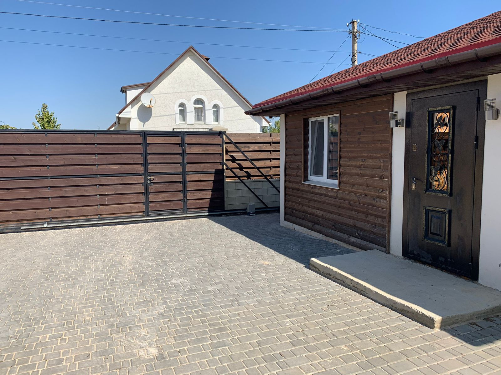 Участок 4 сотки, ровный, правильной формы, огорожен забором по всему периметру. Откатные ворота. Двор выложен плиткой.