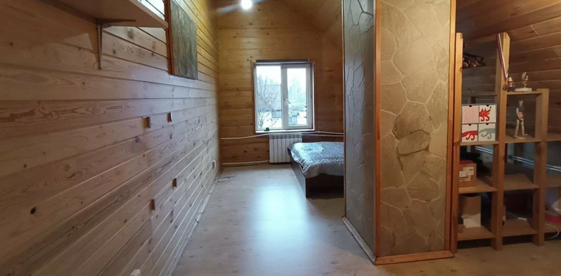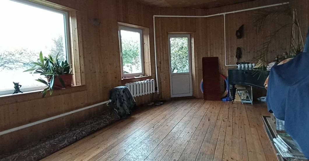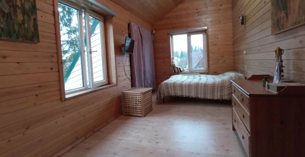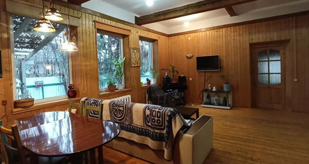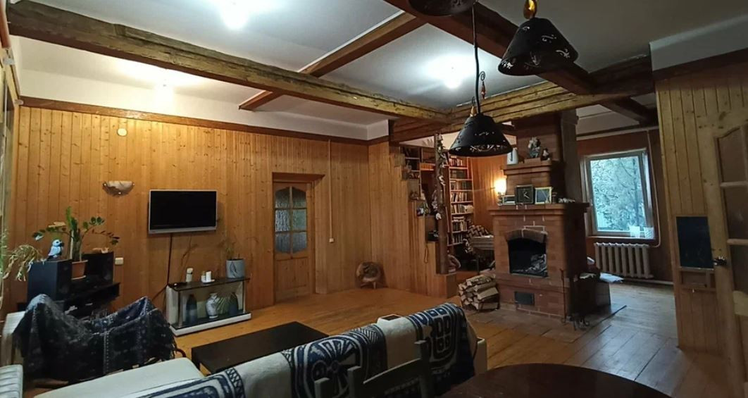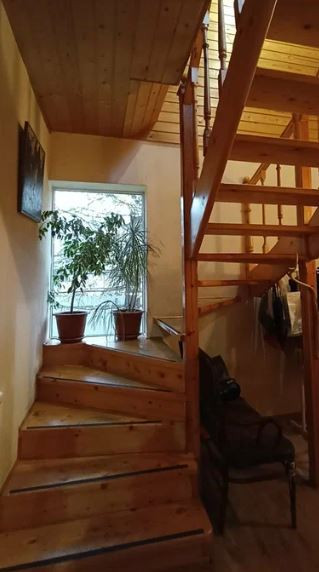 Двухэтажный дом на ленточном фундаменте с деревянным срубом, обнесенный кирпичом.  Есть пристройки в виде открытой террасы и отапливаемой веранды.  Высокие потолки от 3х метров во всем доме.  Отапливается котлом, есть камин в гостиной. Внутренняя отделка: вагонка.