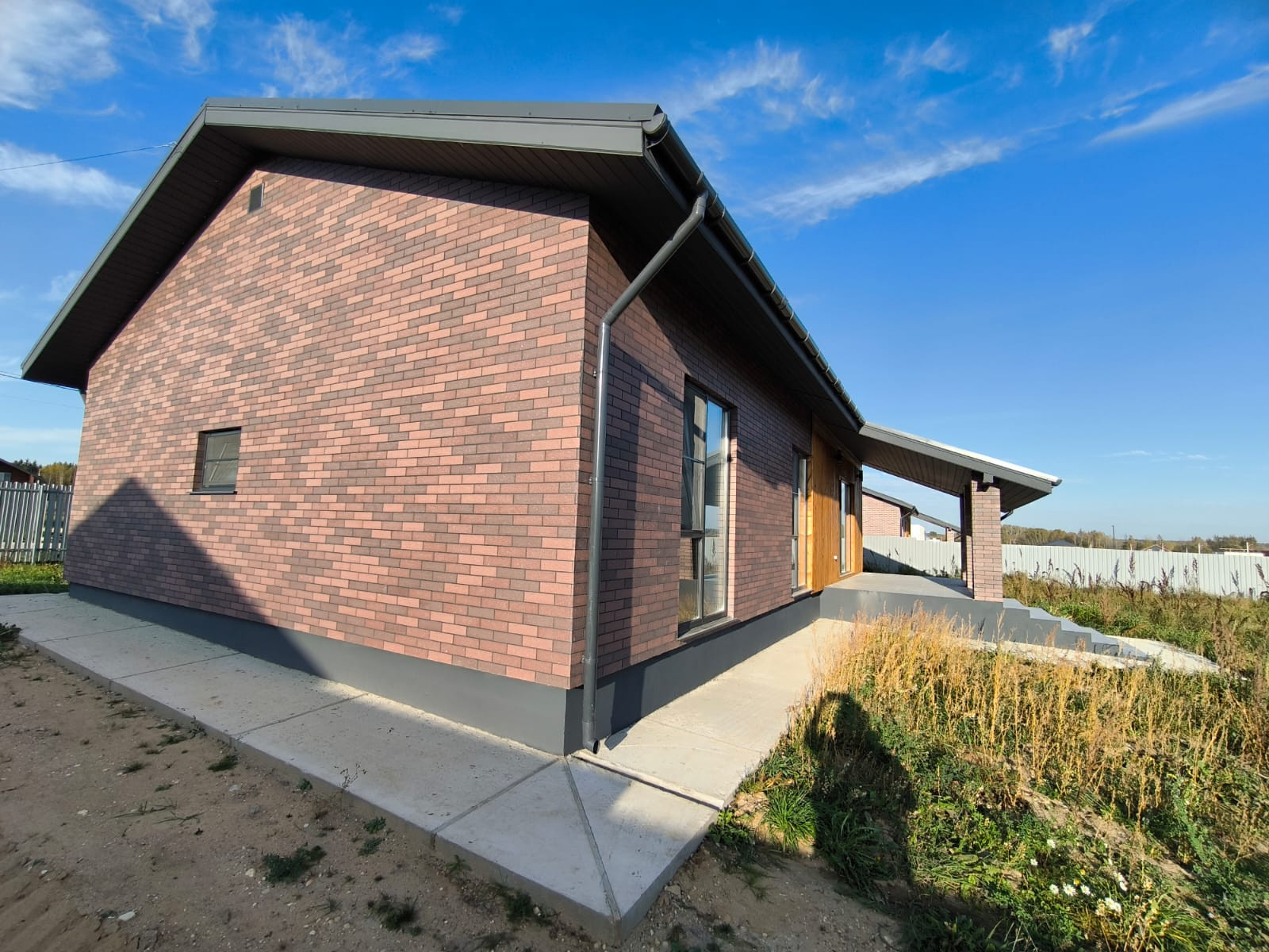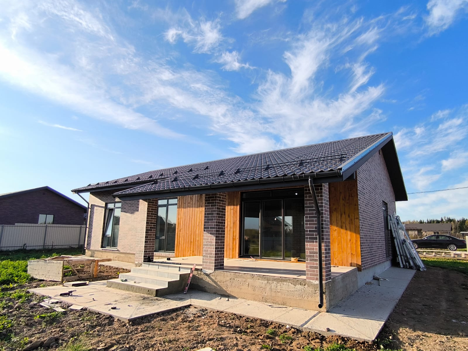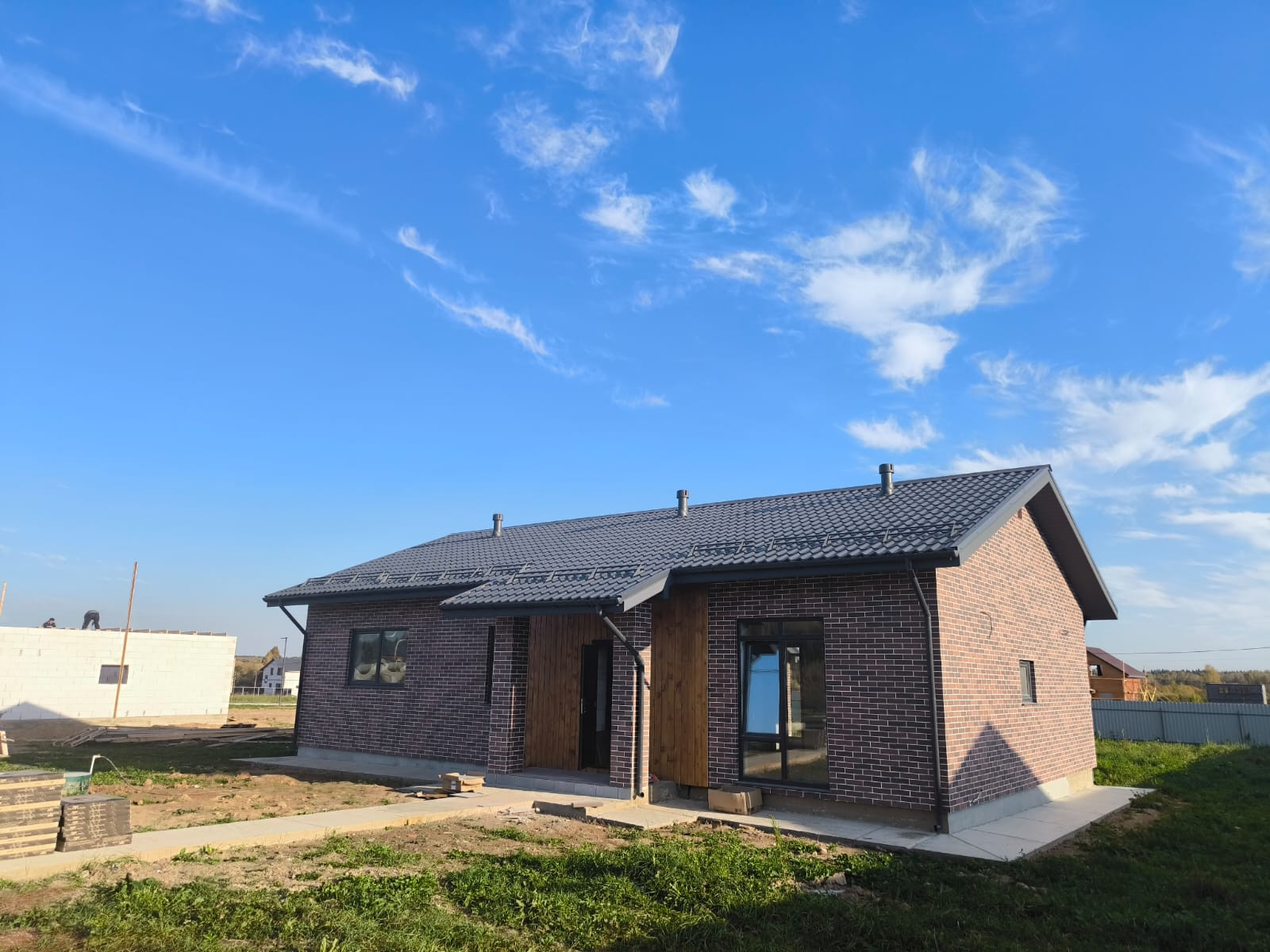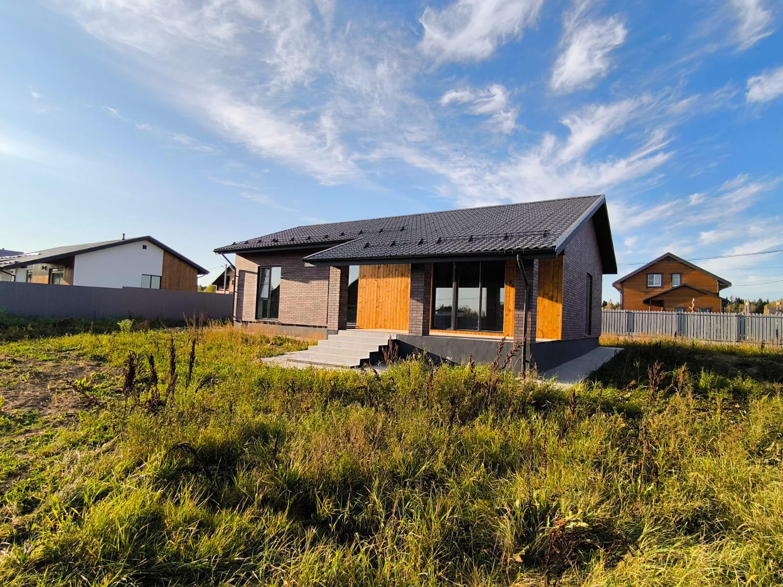 Окна - Rehau, облицовка- панели АМК + фасад лиственничный планкен. Фундамент монолитная армированная плита, крыша металлочерепица, утепление 200. Сделана водосточная система, снегодержатели.