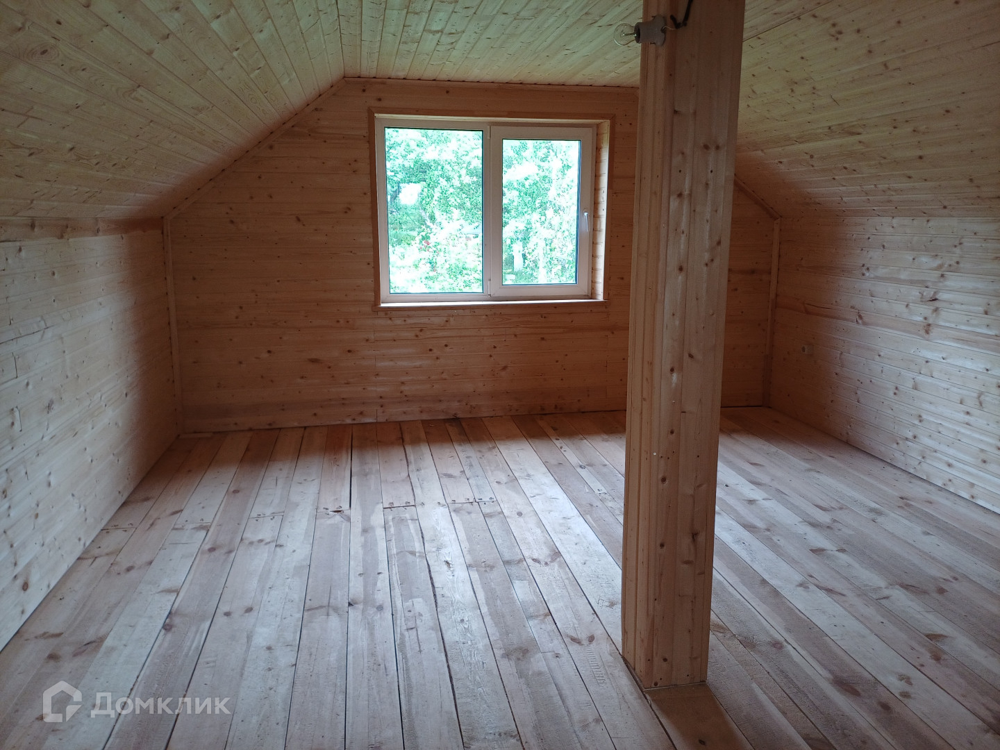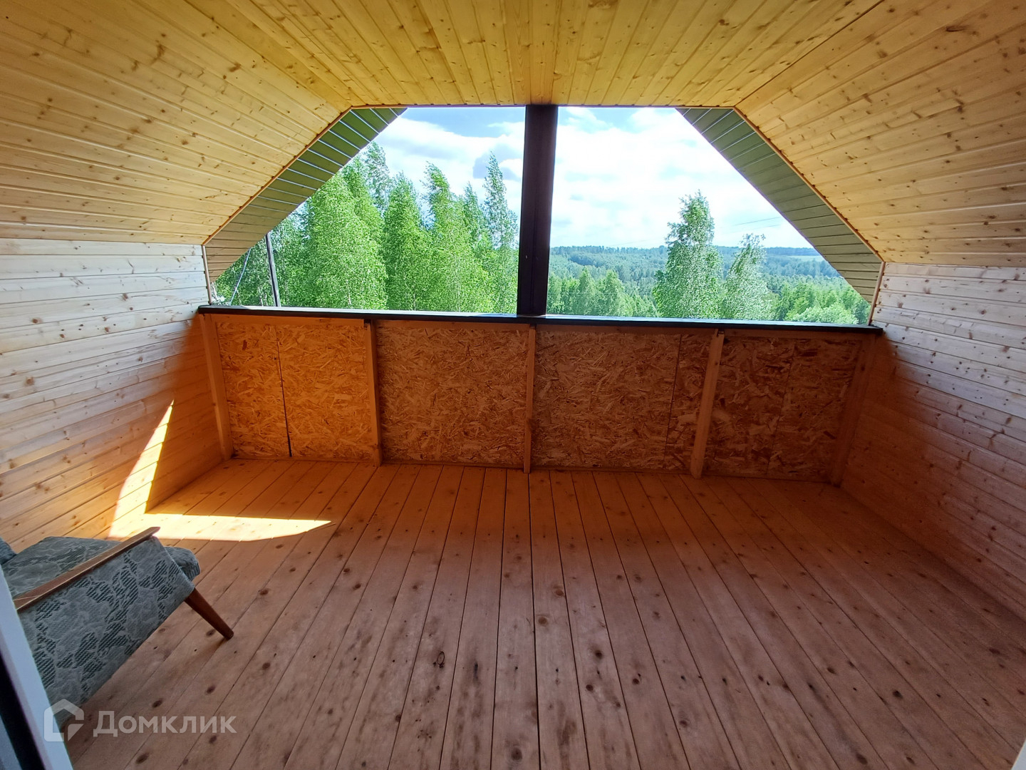 На втором этаже комната и большая терраса с видом лесные просторы. Стены обшиты вагонкой.