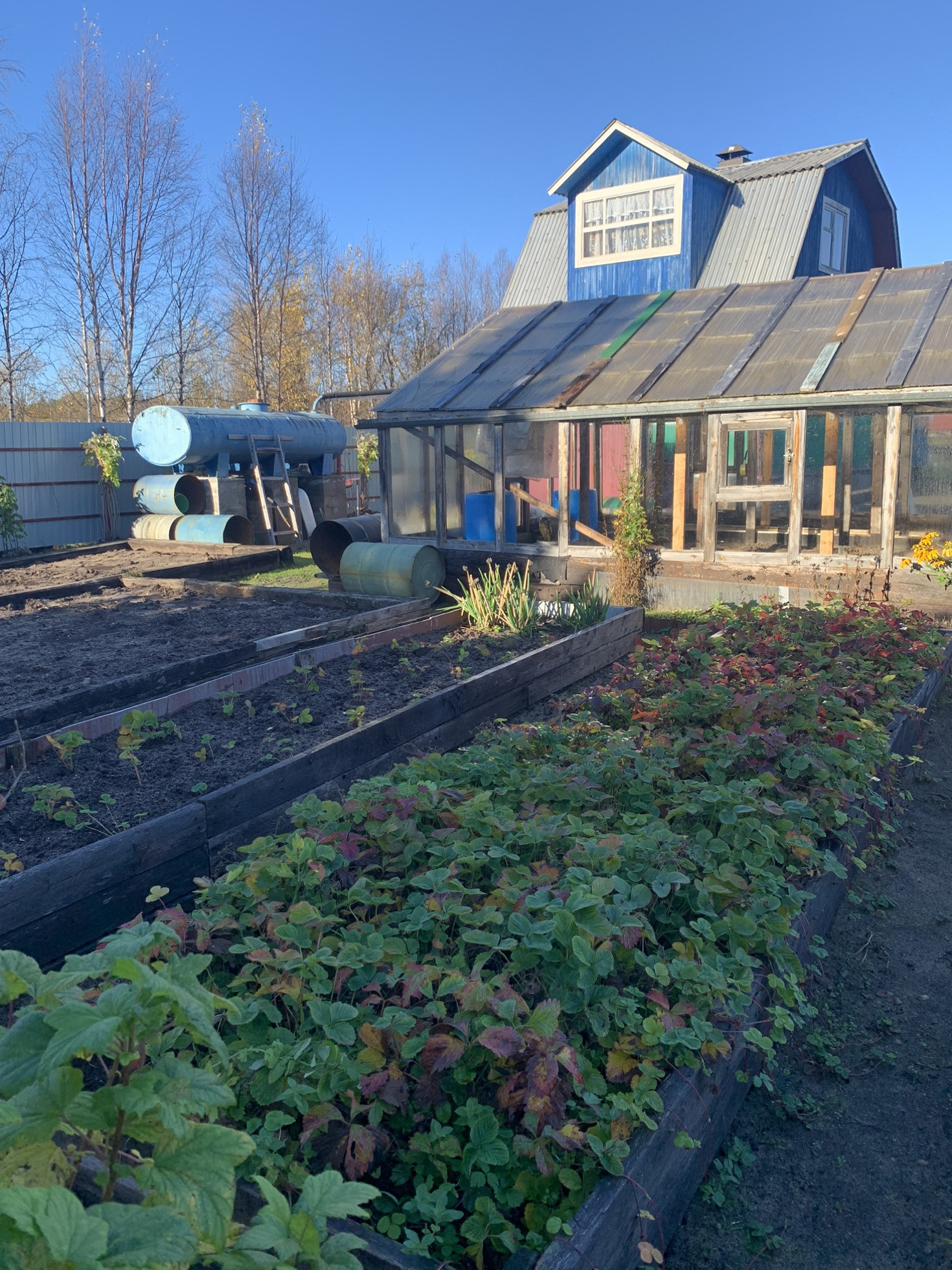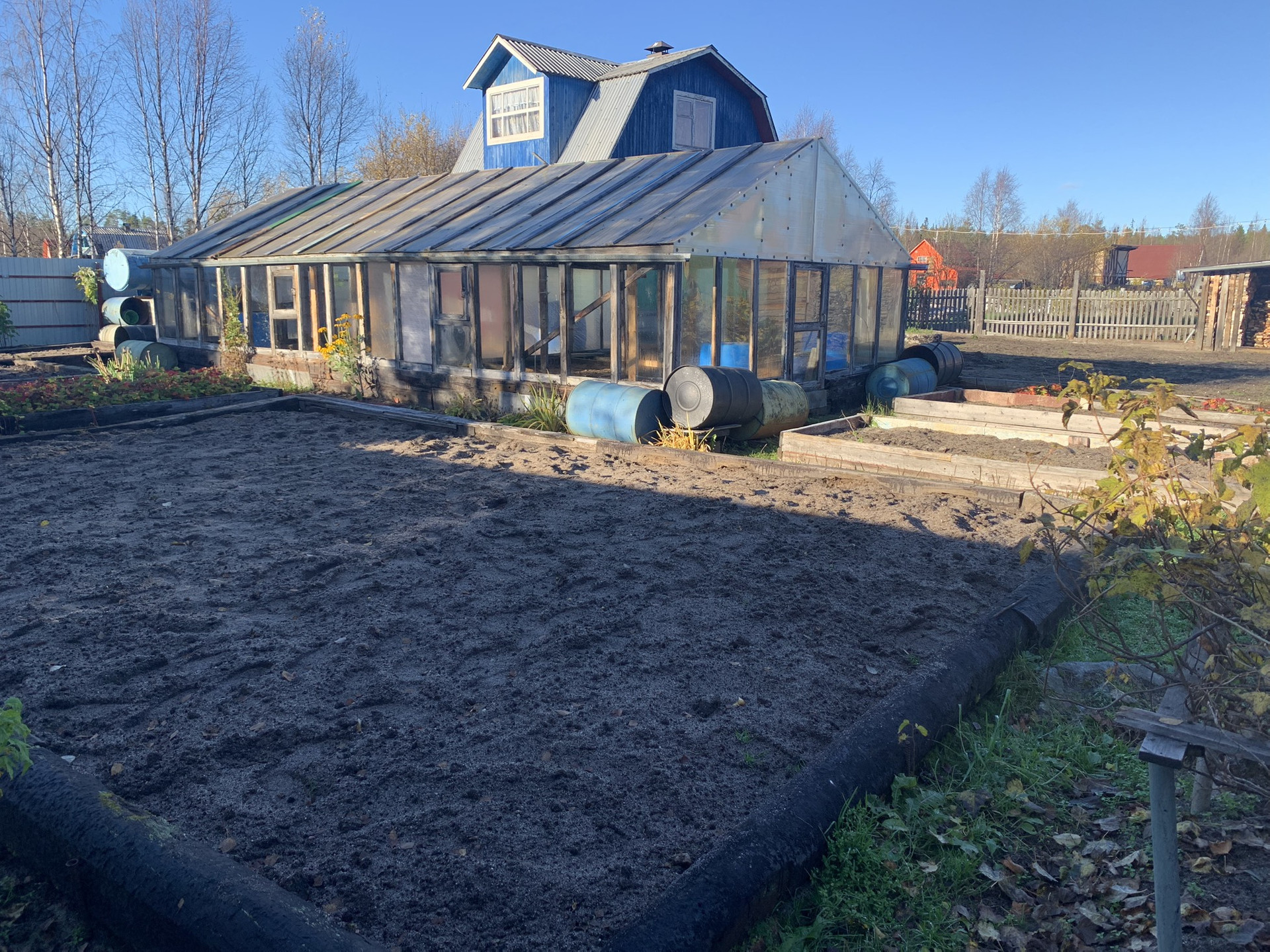 Три огорода под посадку картофеля, Малина -10 кустов, смородина черная -6 кустов, красная смородина - 4 куста, грядки с клубникой - 3 большие грядки, крыжовник , в 2023 году высажены яблони и облепиха. На участке стеклянная теплица 5*10 м . Теплица имеет два отделения с двумя входами. В теплице для согревания воды установлены 4 большие пластиковые емкости с кранами. Теплица с водостоками по углам. Под каждым водостоком по 3 бочки для сбора дождевой воды. На участке установлен накопительный бак для воды на 500 литров .