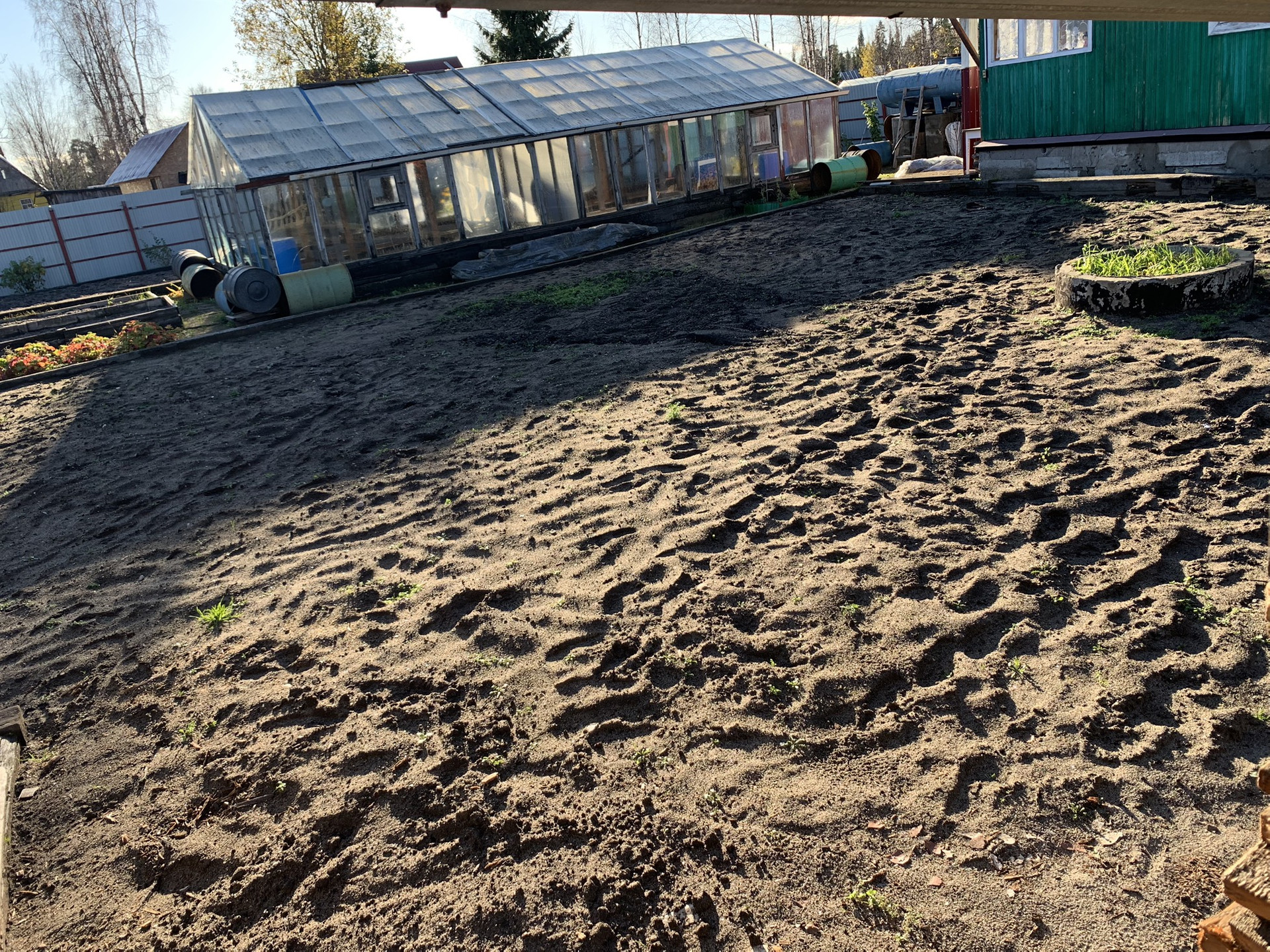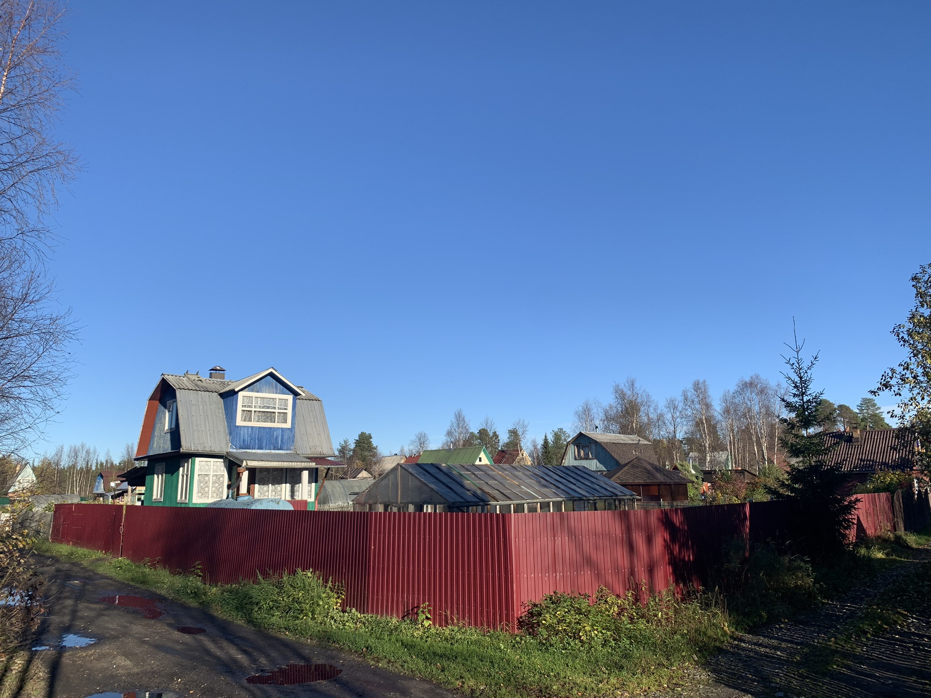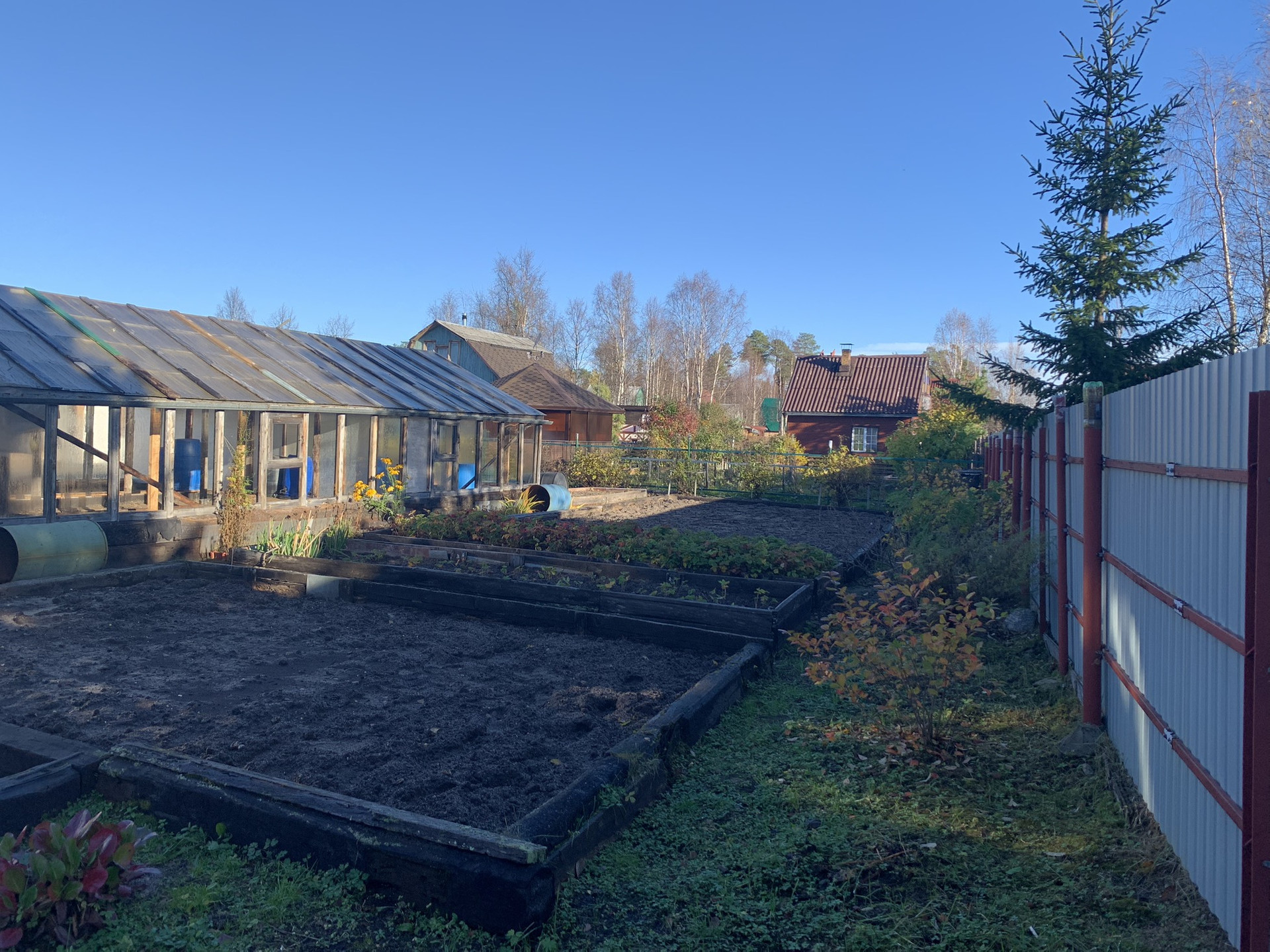 С внутренних сторон соседние участки только с двух сторон. С одной стороны новая рабица. С другой штакетник.