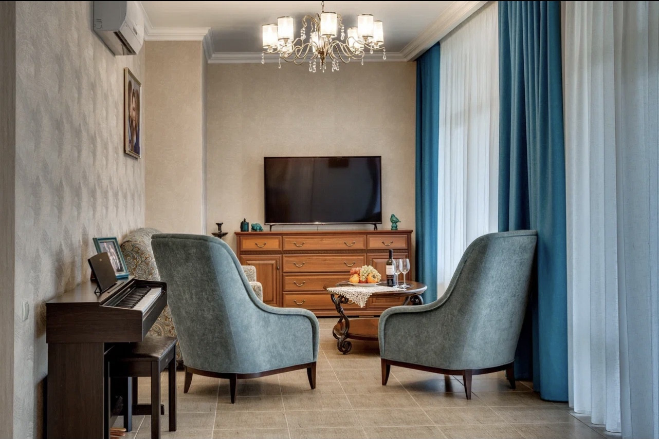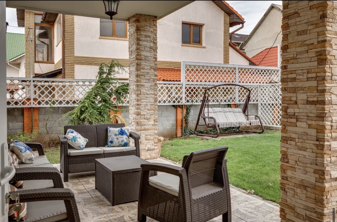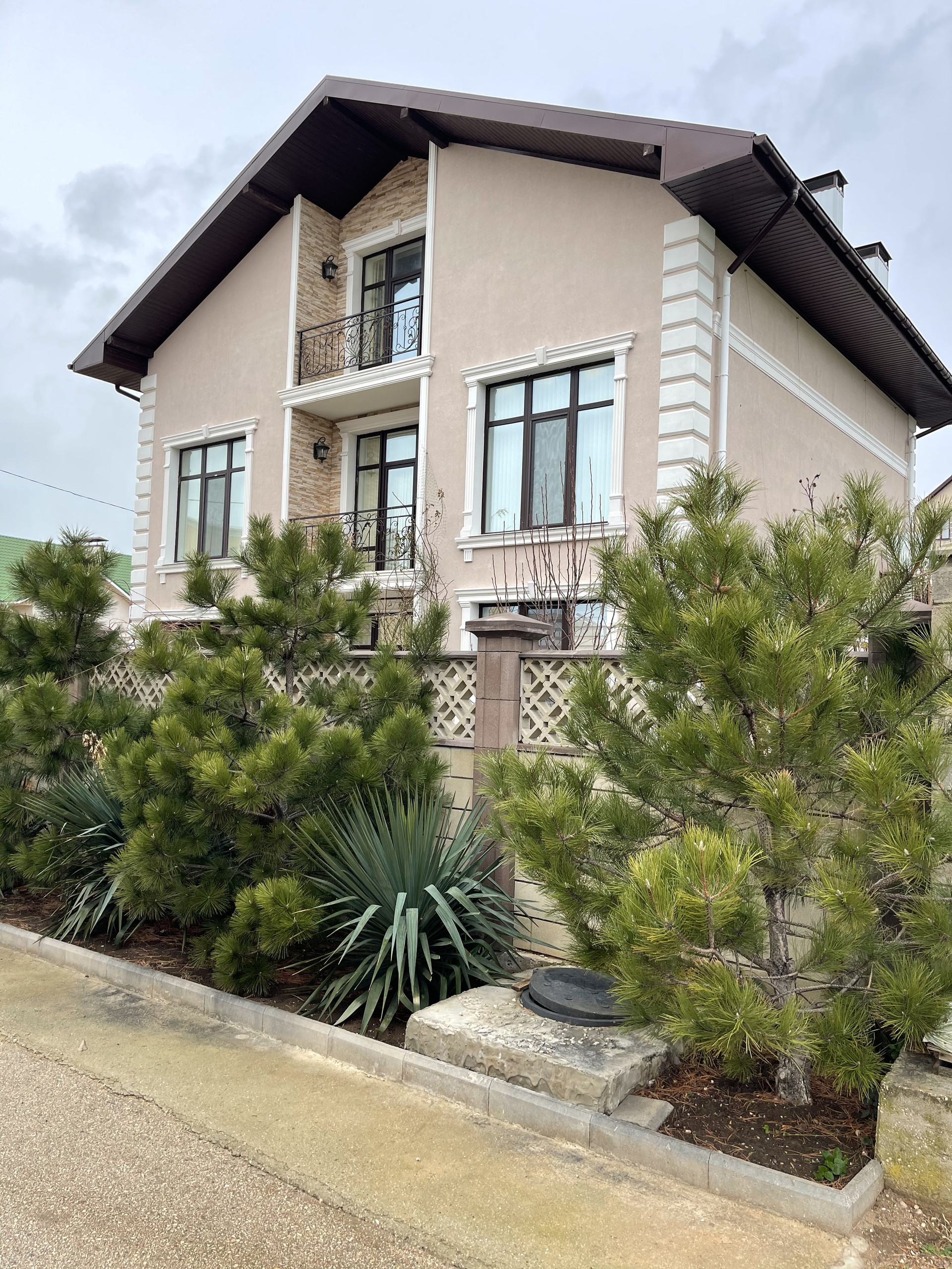 Во дворе за домом расположена печь на дровах, мангал, тандыр, электроиндукционная печь для копчения. Для полива газона используется американская автоматическая система. На участке высажен карликовый Крымский кедр, плодоносят абрикосы, персики, вишни, черешни. Ротанговая мебель на верандах и балконах . Дом продается со всей мебелью, техникой и оборудованием. Можем предоставить проект дома
