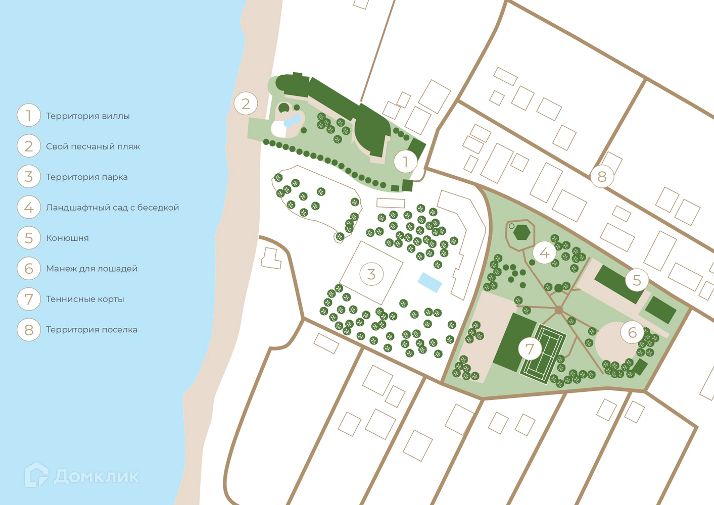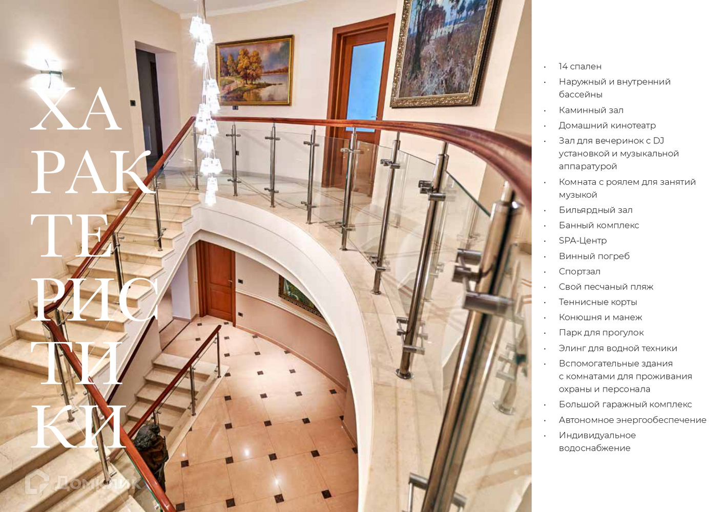 На участке 1,58 Га распололожены: просторная четырёхэтажная вилла, впечатляющая своим стилем и удобствами, банный комплекс, теннисные корты, конюшня и манеж, парк для прогулок, элинг для водной техники, свой песчаный пляж протяжённостью 70 метров, большой гаражный комплекс, вспомогательные здания с комнатами для проживания охраны и персонала. Автономное энергообеспечение. Индивидуальное водоснабжение.