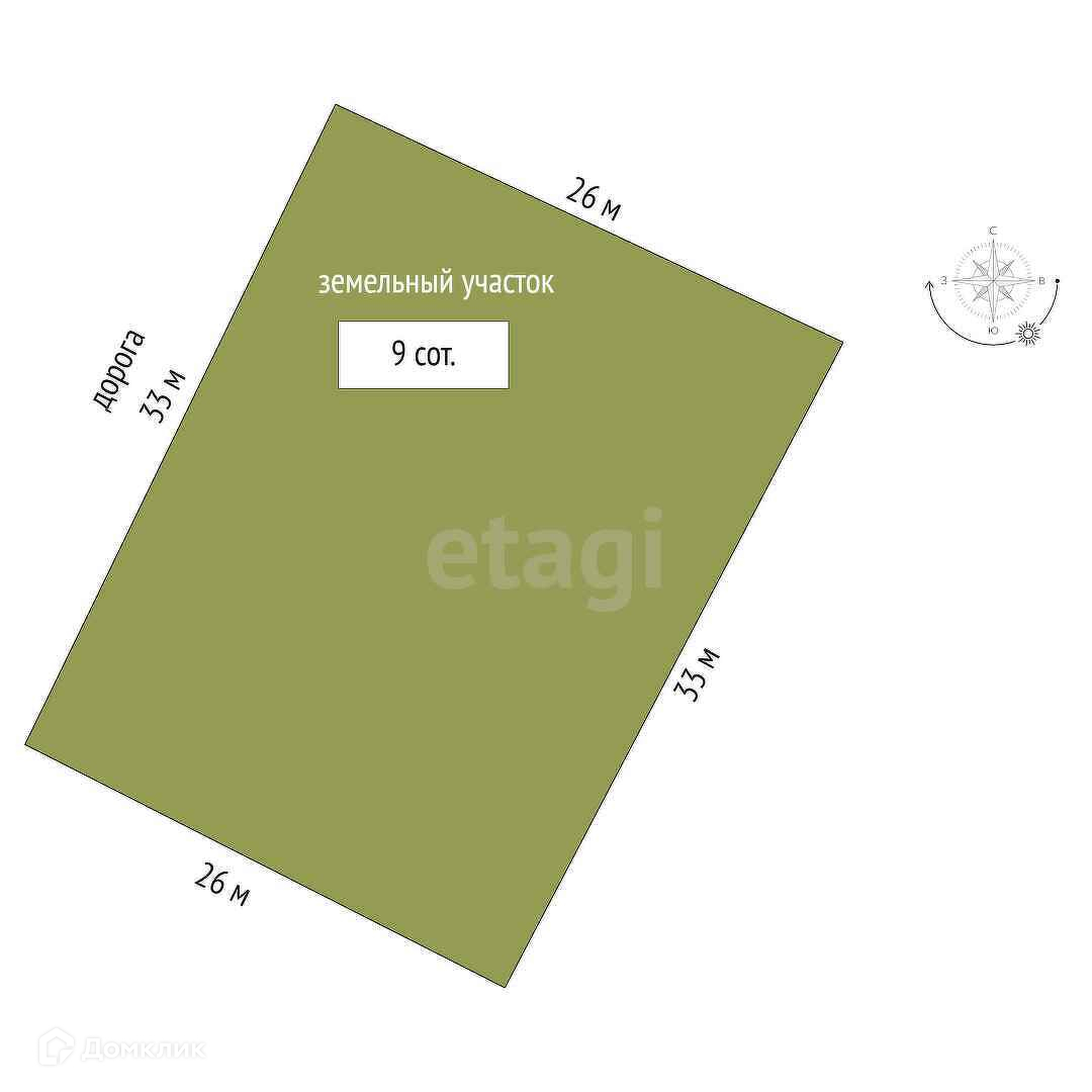 Площадь участка - 9 соток. Участок прямоугольной формы со сторонами: 26 м*33 м*26 м*33 м.