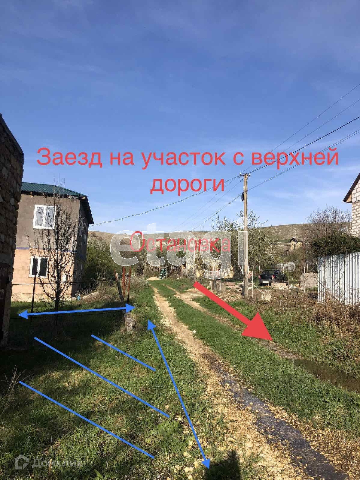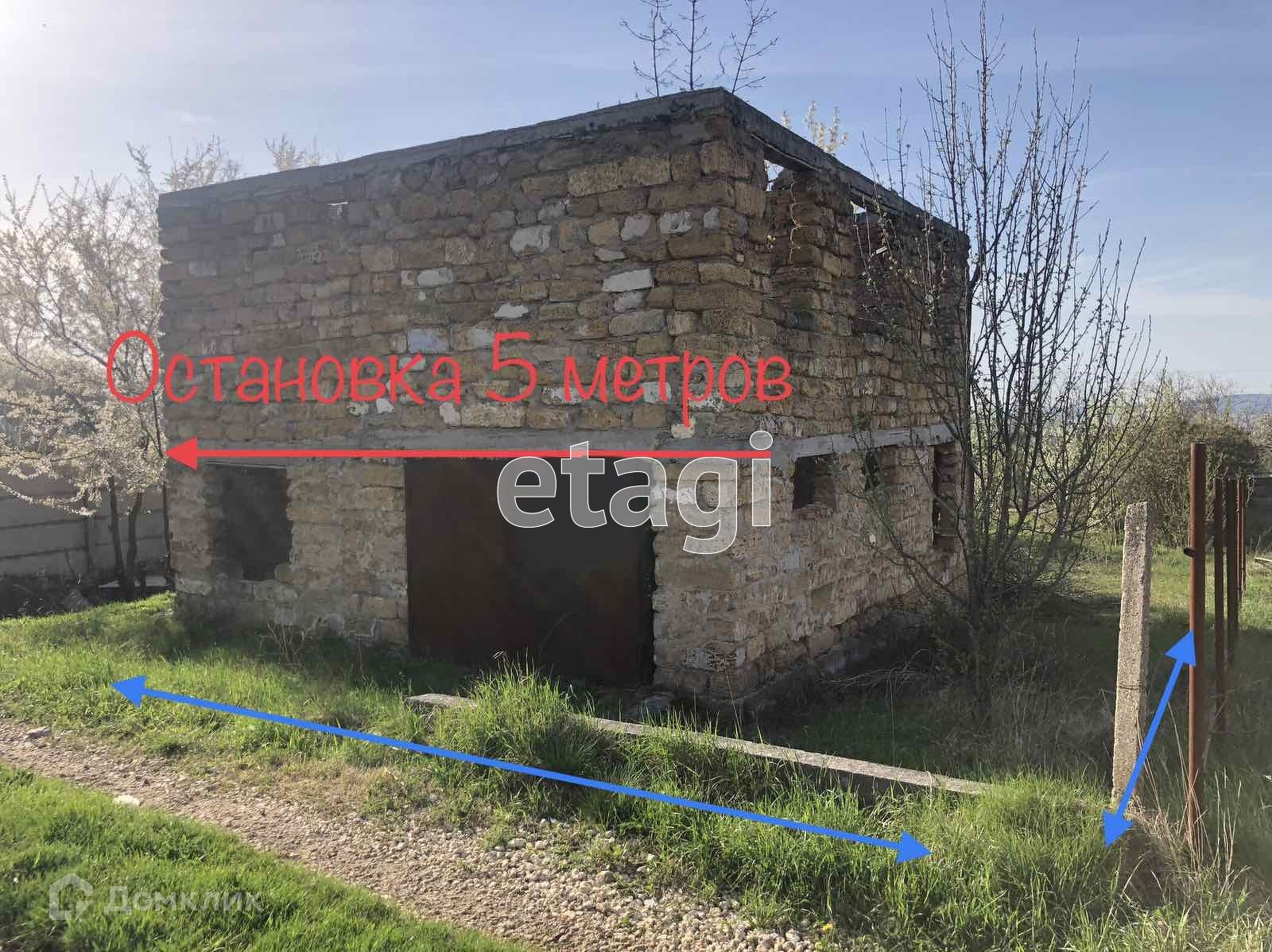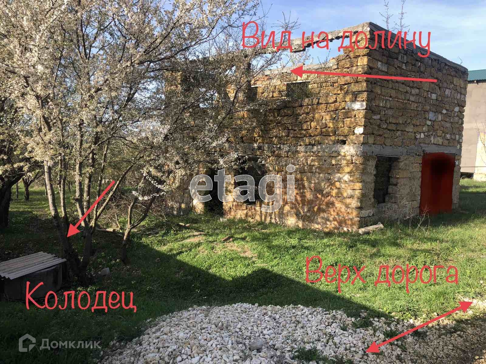На участке строение в два этажа, подвал и гараж с железными воротами. Дом построен в один камень. На участке, есть колодец. Шикарный вид с участка, т к находиться на возвышенности. Рядом остановка автобусная, автобус ездит каждый два часа из Симферополя с Москольца.