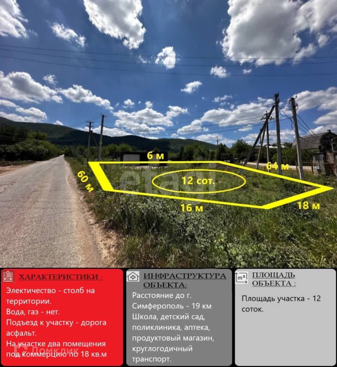 Земельный участок ровный, площадь - 12 соток. Дорожное покрытие рядом с земельным участком - асфальт.