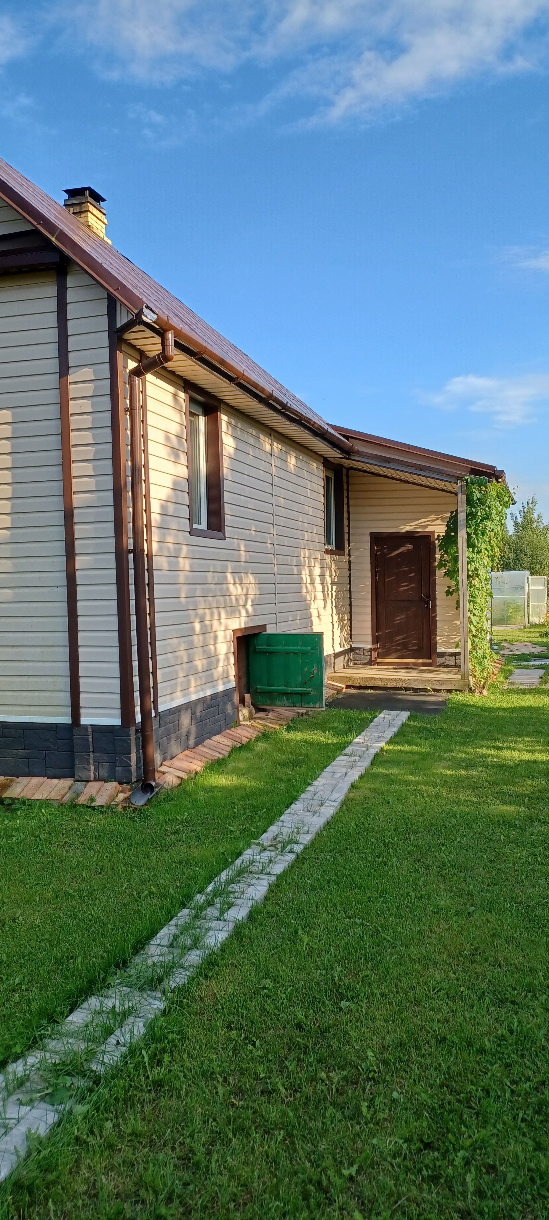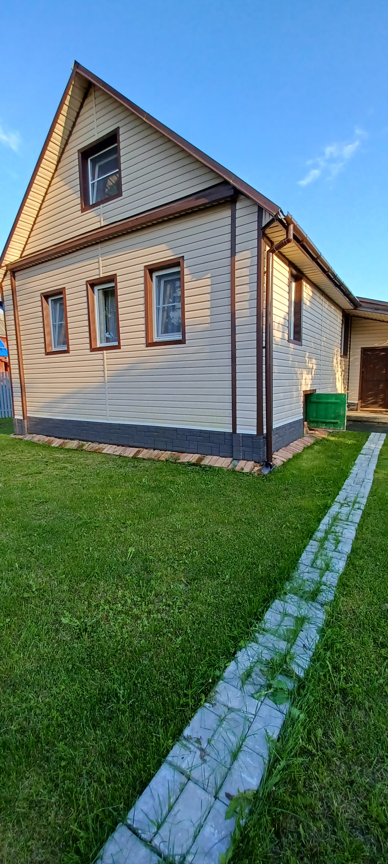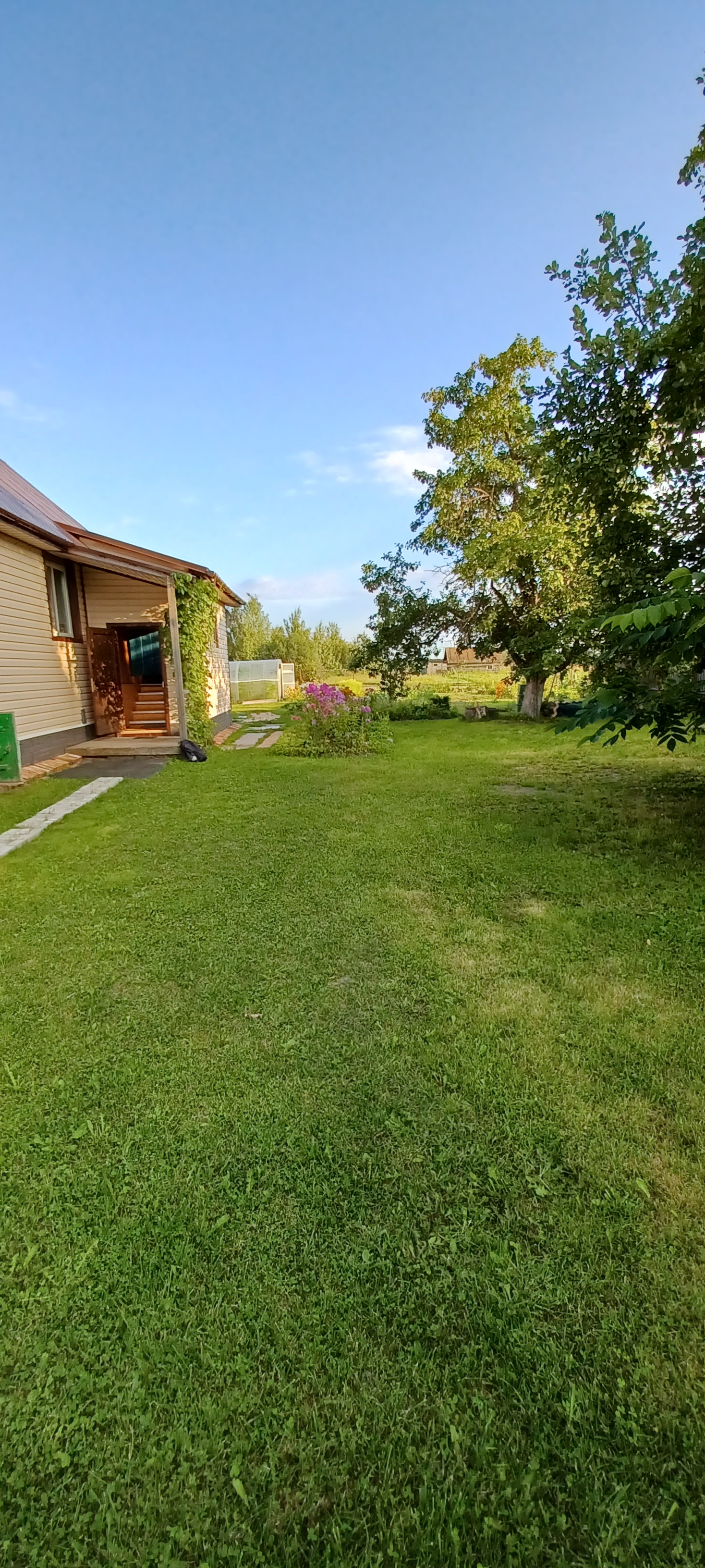 Отличный большой двор с зеленой мягкой травой. Транспортная доступность: электричкой от Московского или Ладожского вокзалов Санкт-Петербурга. От железнодорожной станции - платформа 55 км до дома - 5 -10 минут пешком.