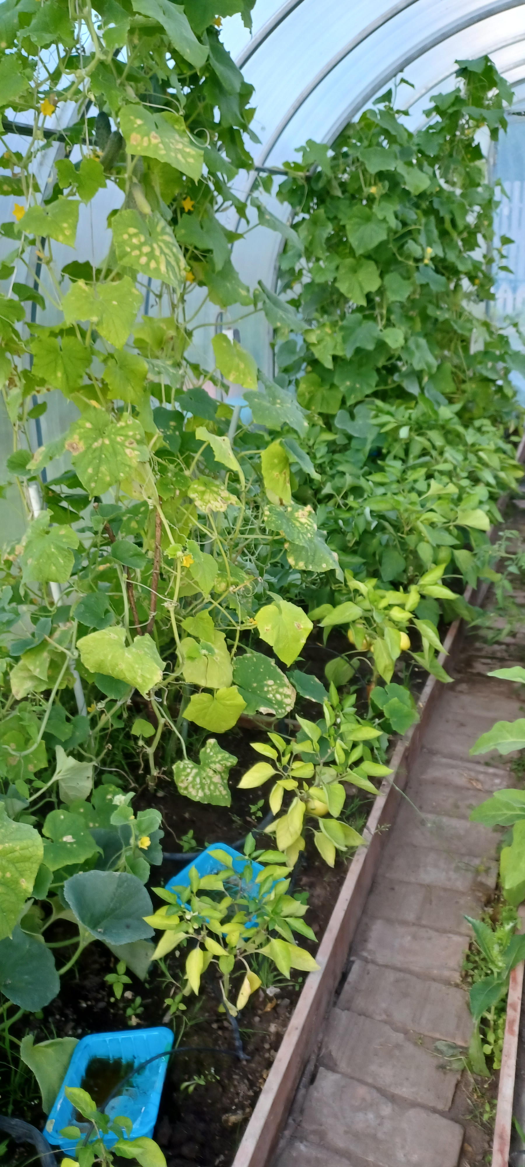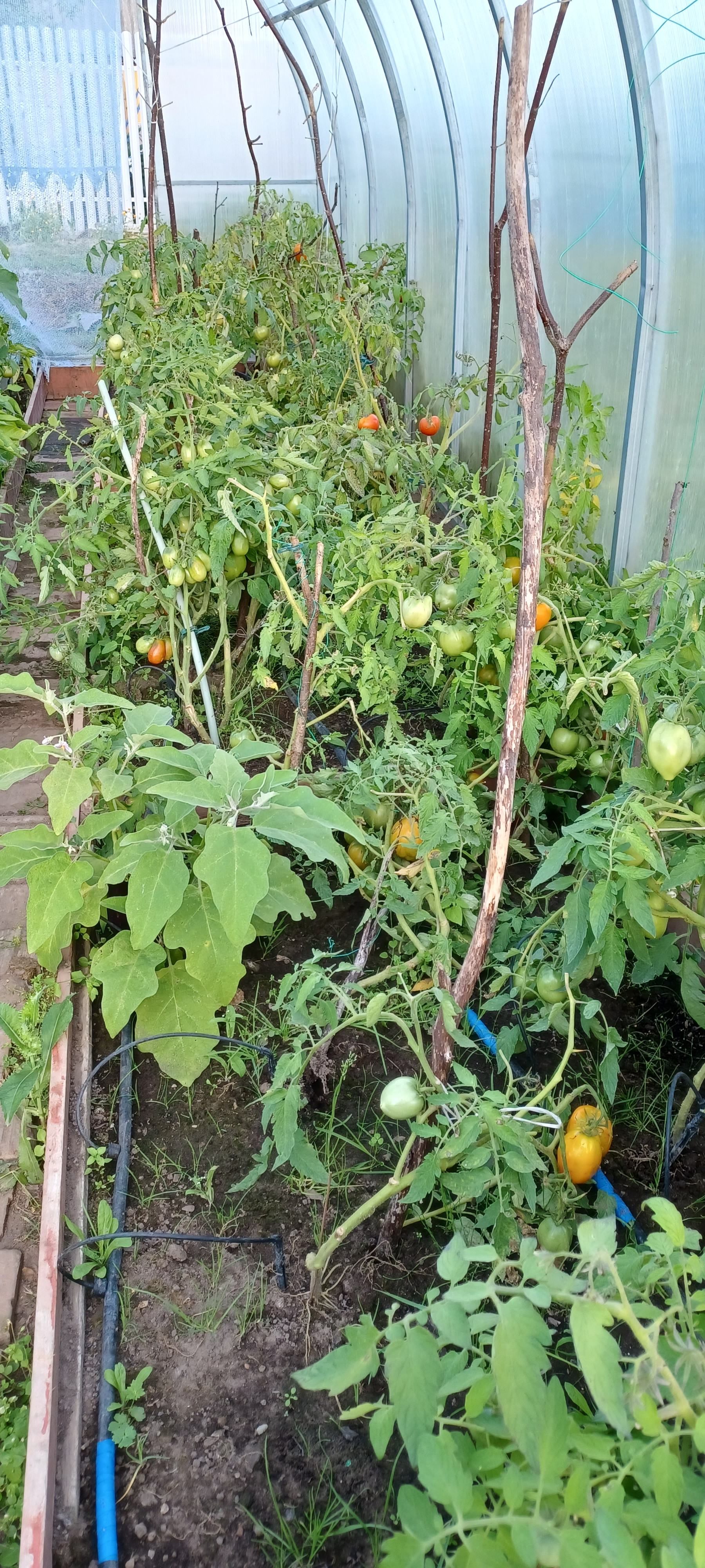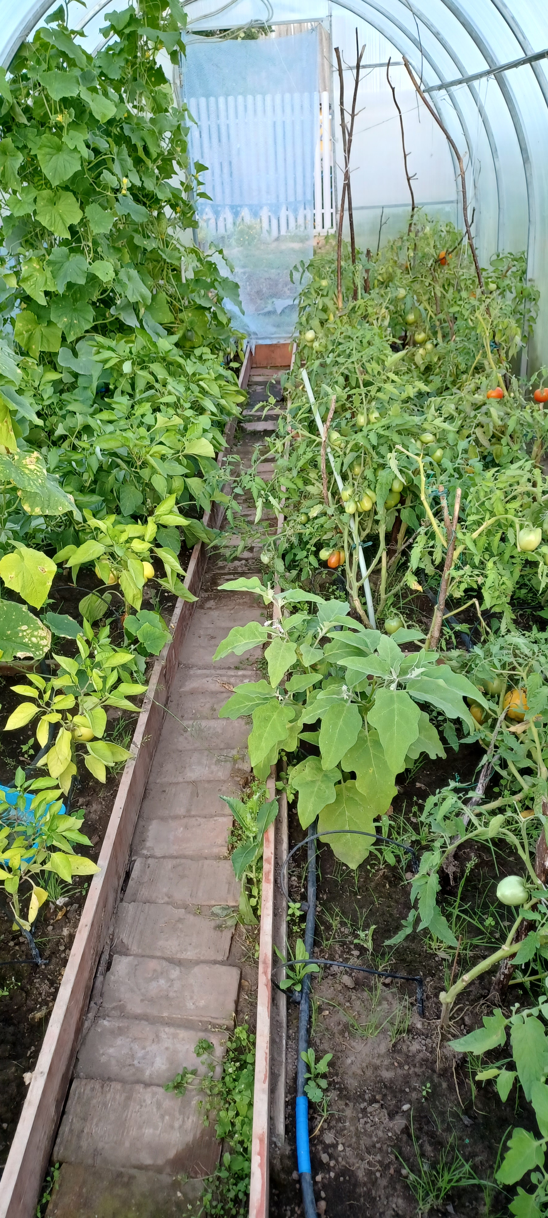 Теплица: 2,5*6 метров. Удачно расположена на участке, растут и плодоносят огурцы, помидоры различных сортов, баклажаны, перец, дыни.