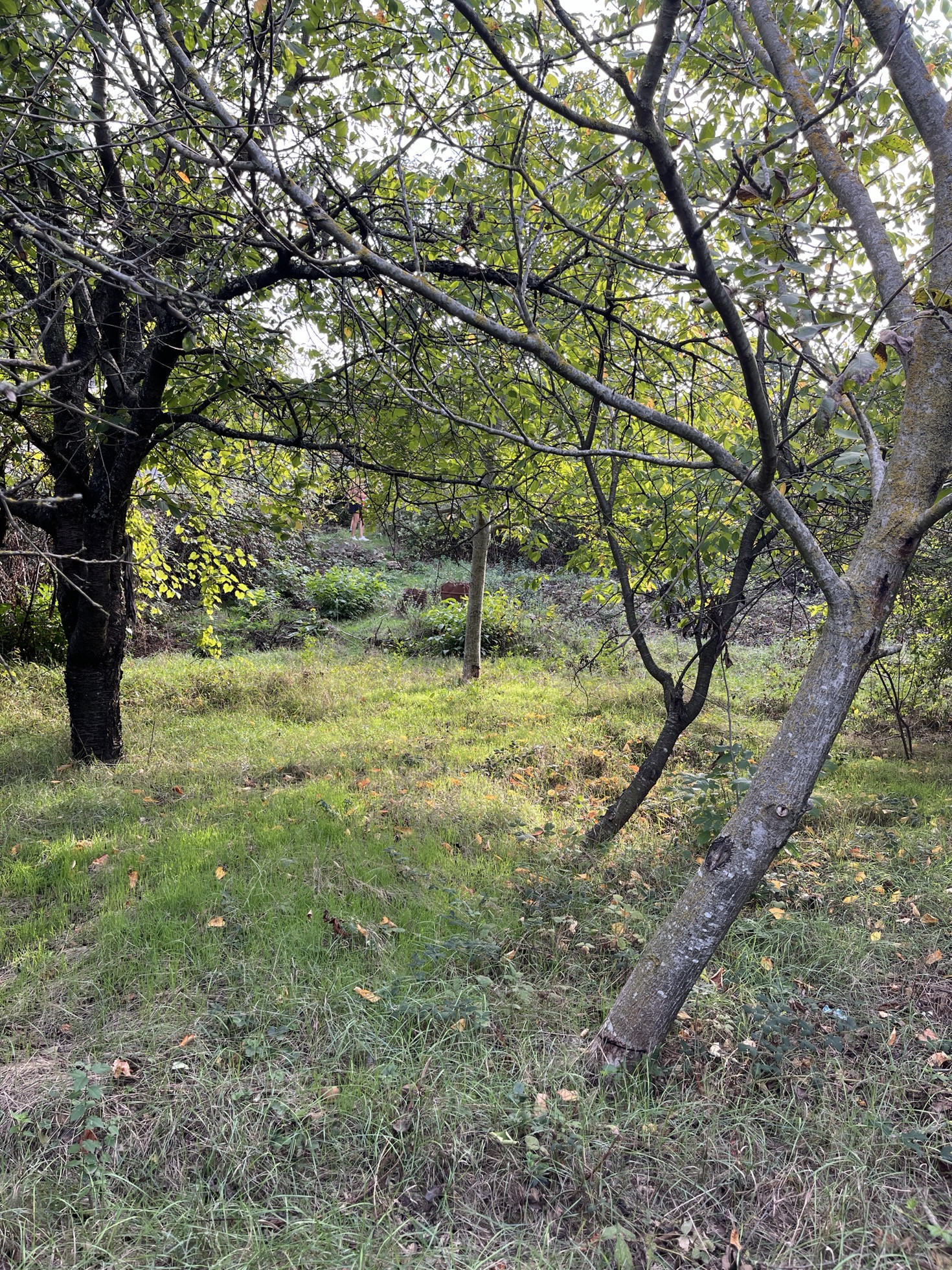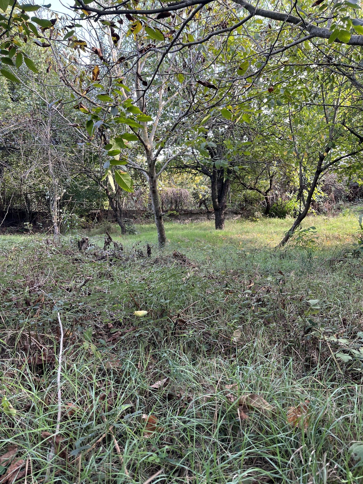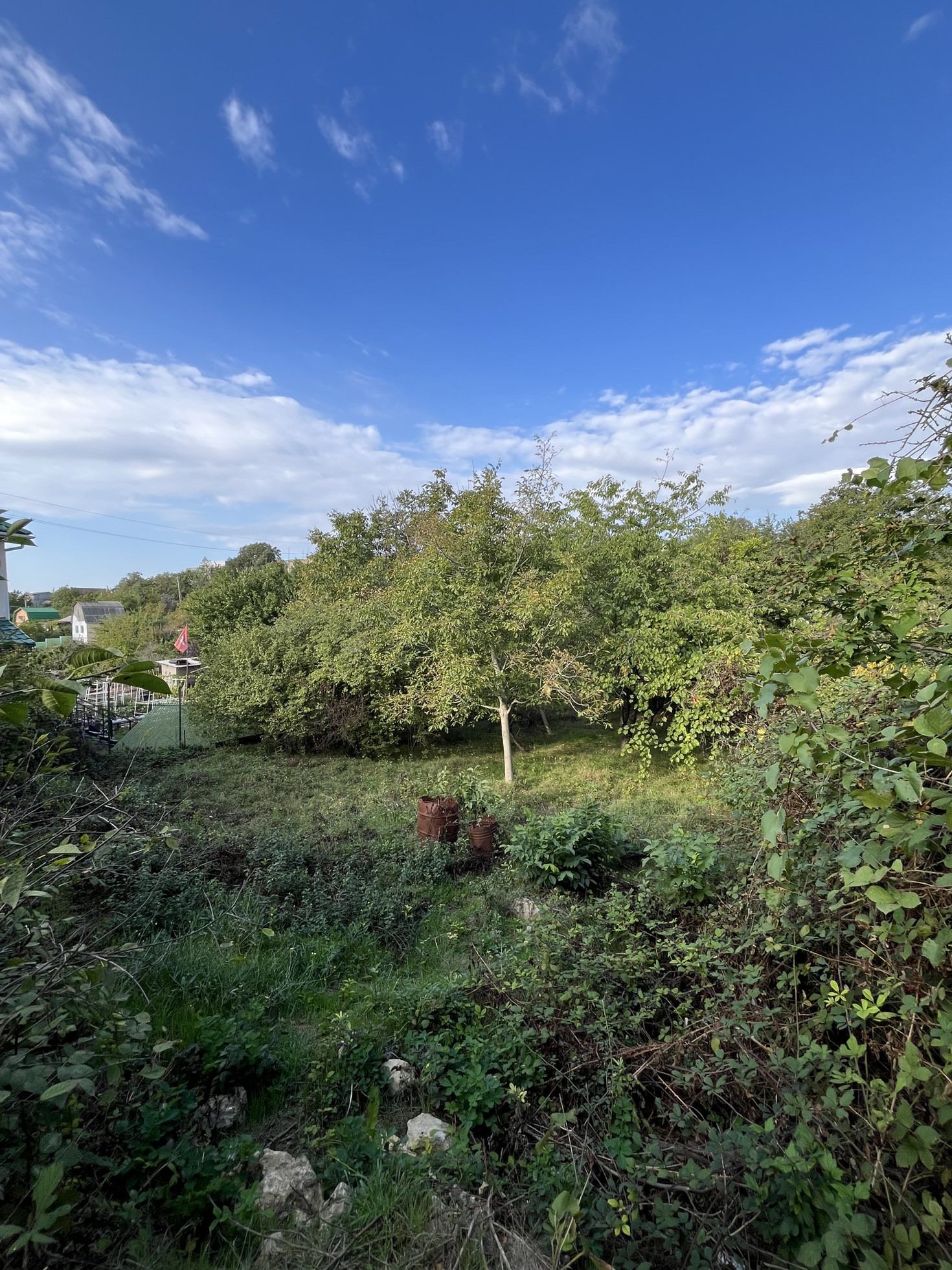 На участке растут плодоносящие фруктовые деревья: орех, черешня, яблоня, слива и миндаль .