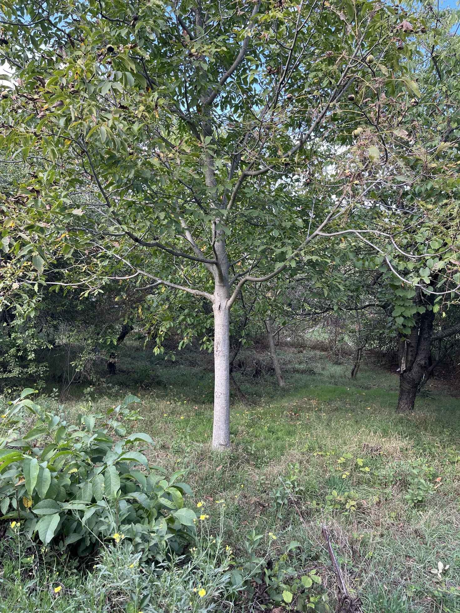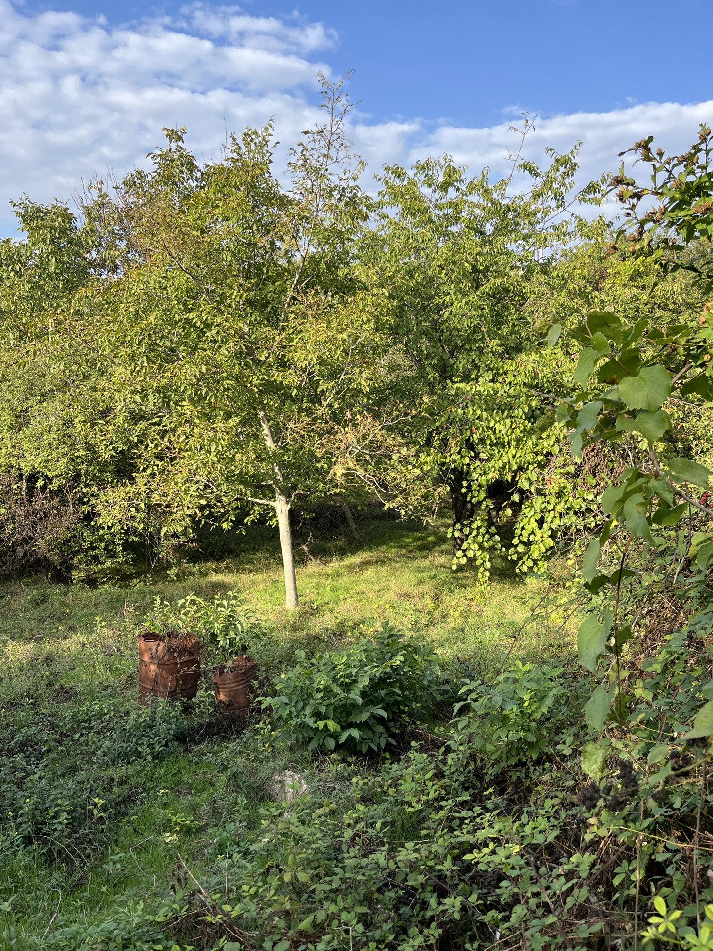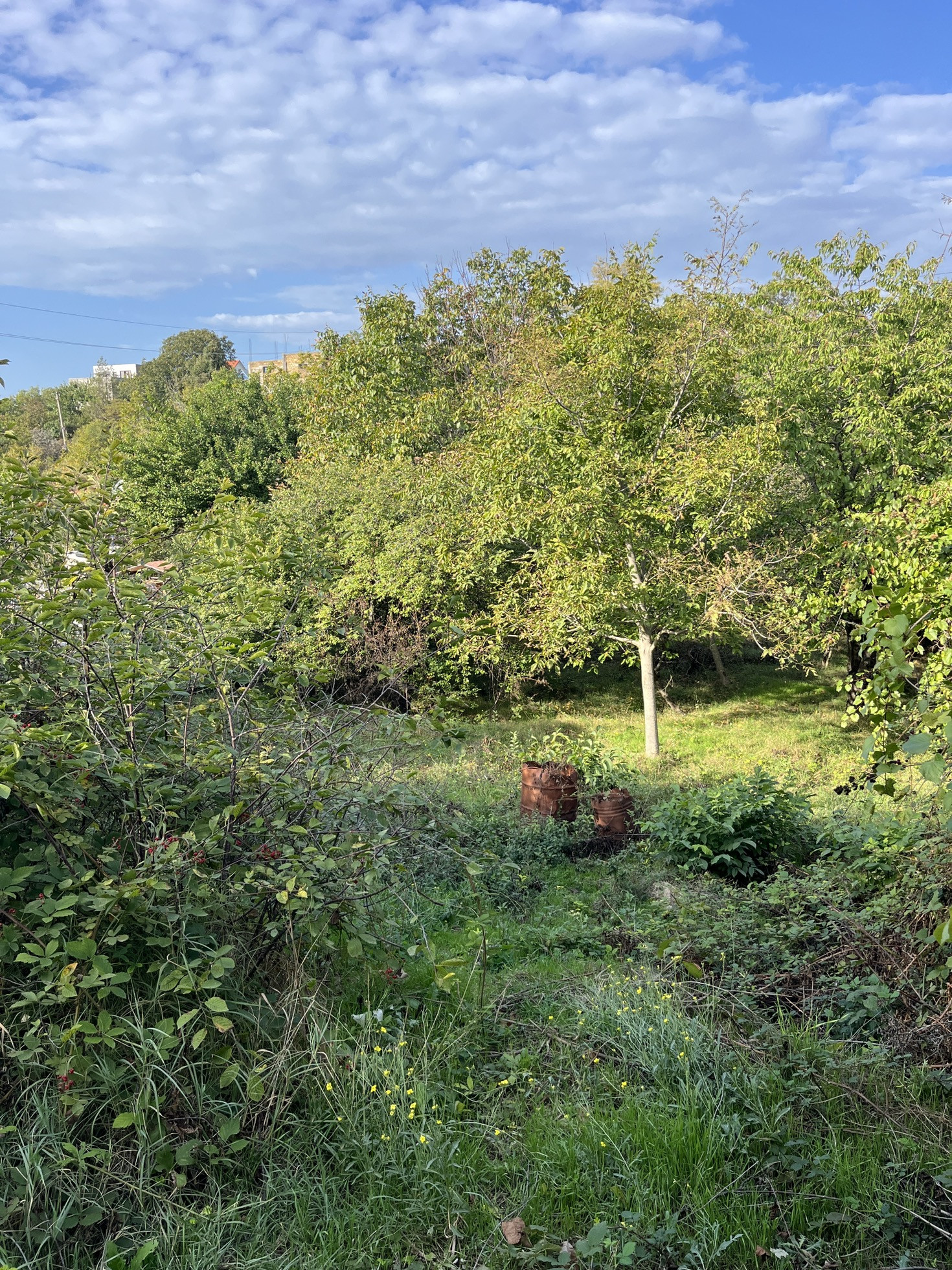 На участке растут плодоносящие фруктовые деревья: орех, черешня, яблоня, слива и миндаль .