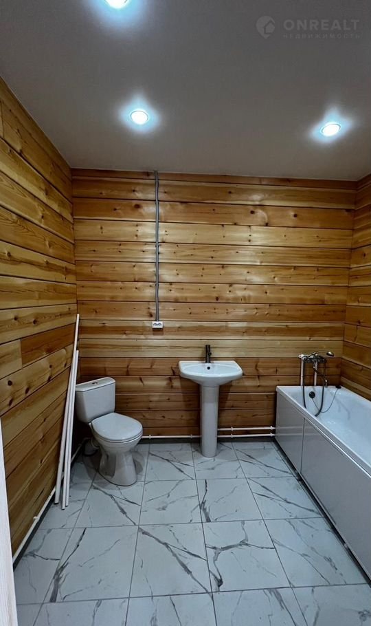 Дом сдается с чистовой отделкой: натяжные потолки с точечными светильниками, кафель и сантехника в санузле, линолеум под плинтусы в комнатах.