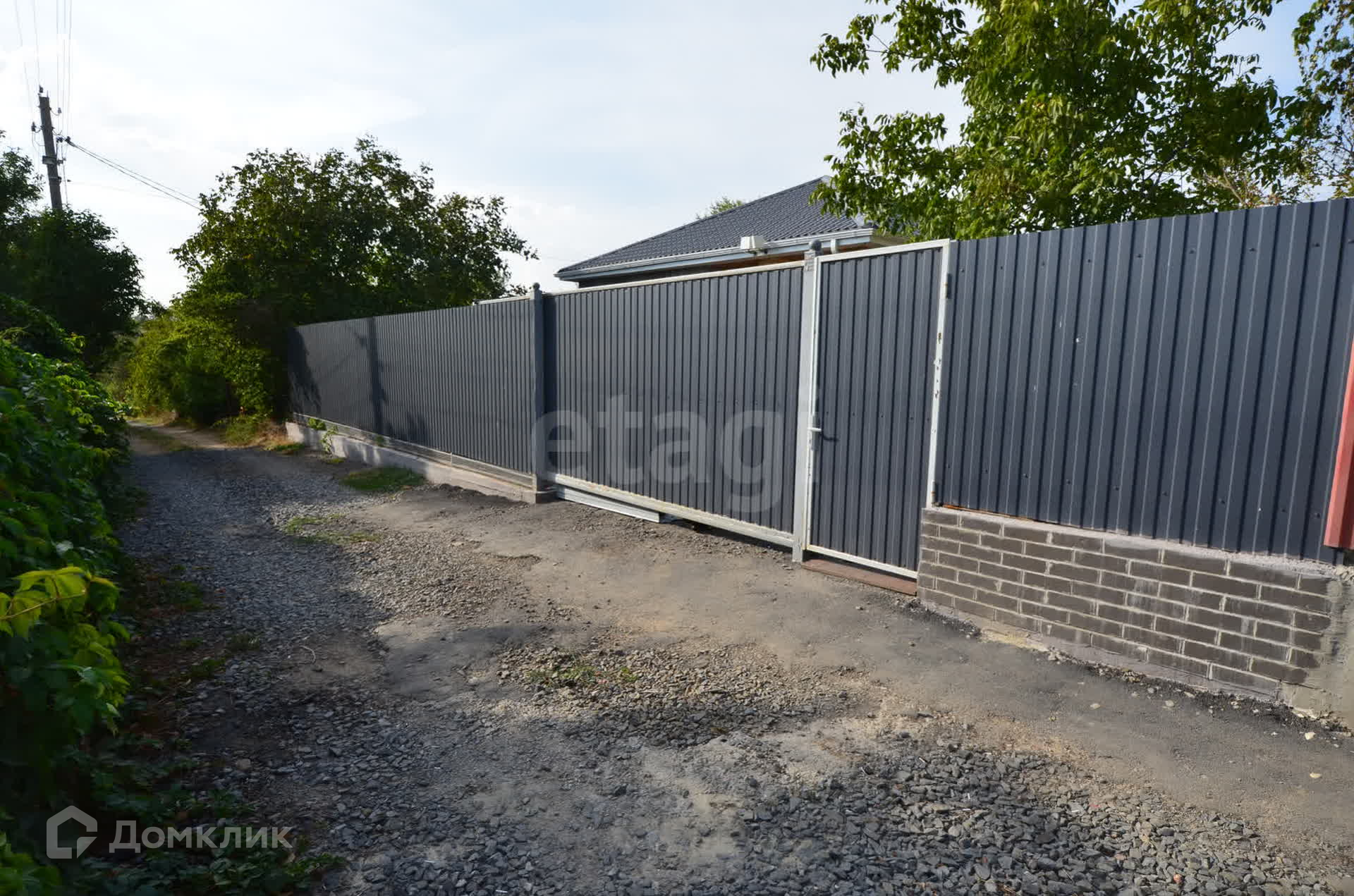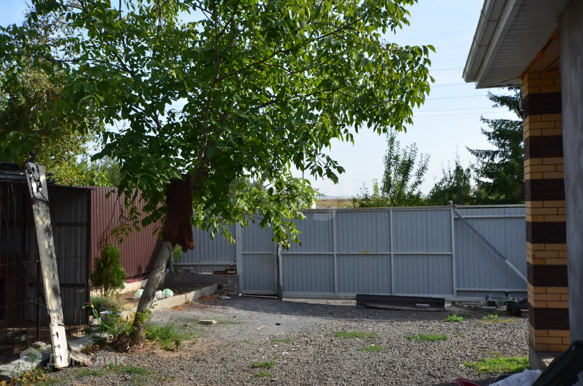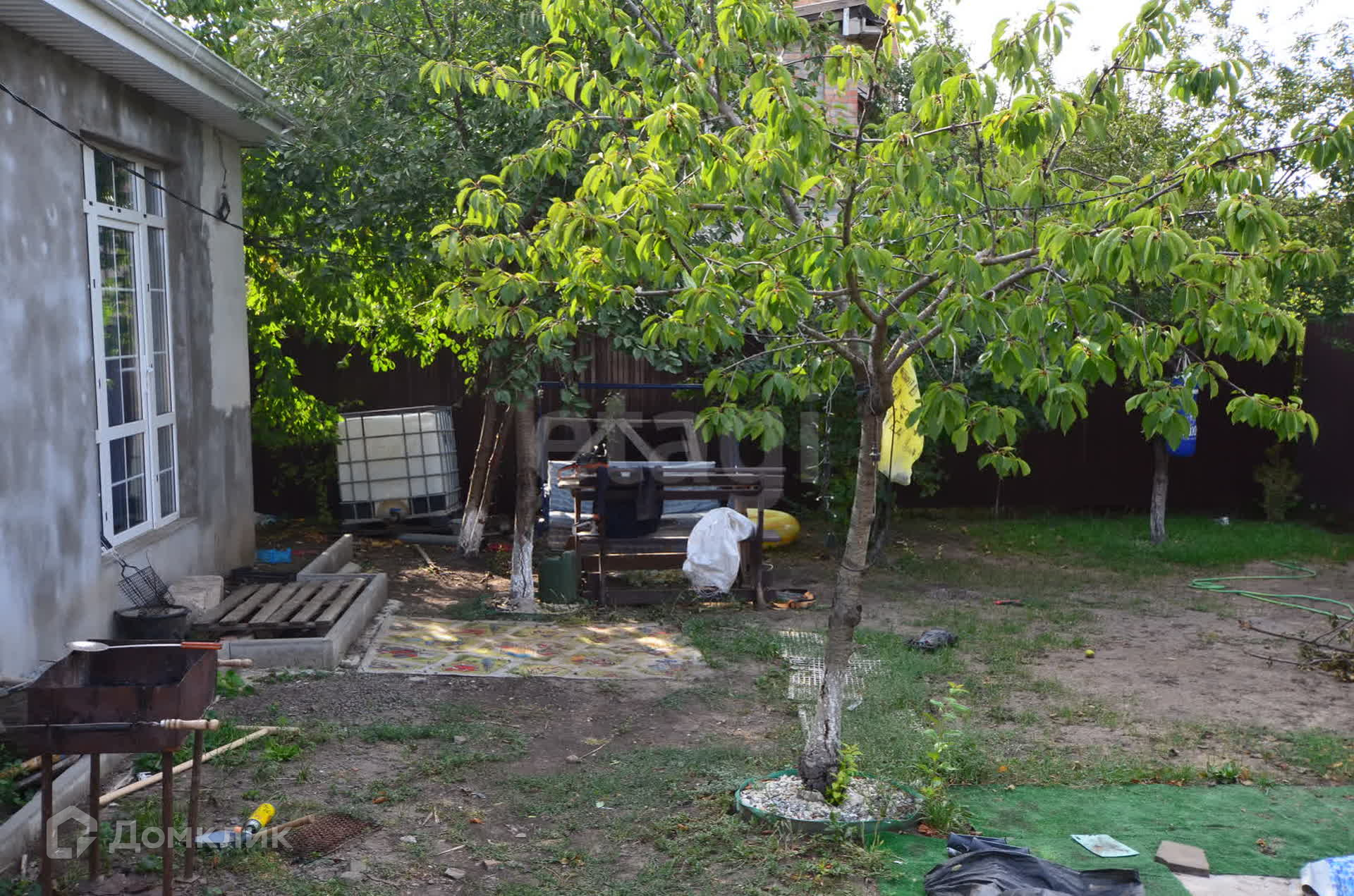 Участок правильной формы, фасад 20 метров, огорожен профнастилом, въезд осуществляется через откатные ворота, возможность разместить до 5 автомобилей. На заднем дворе можно разместить мангальную зону, беседку, установить бассейн, на участке растут плодовые деревья. Также построен уличный душ и санузел. Имеется небольшая хозпостройка.