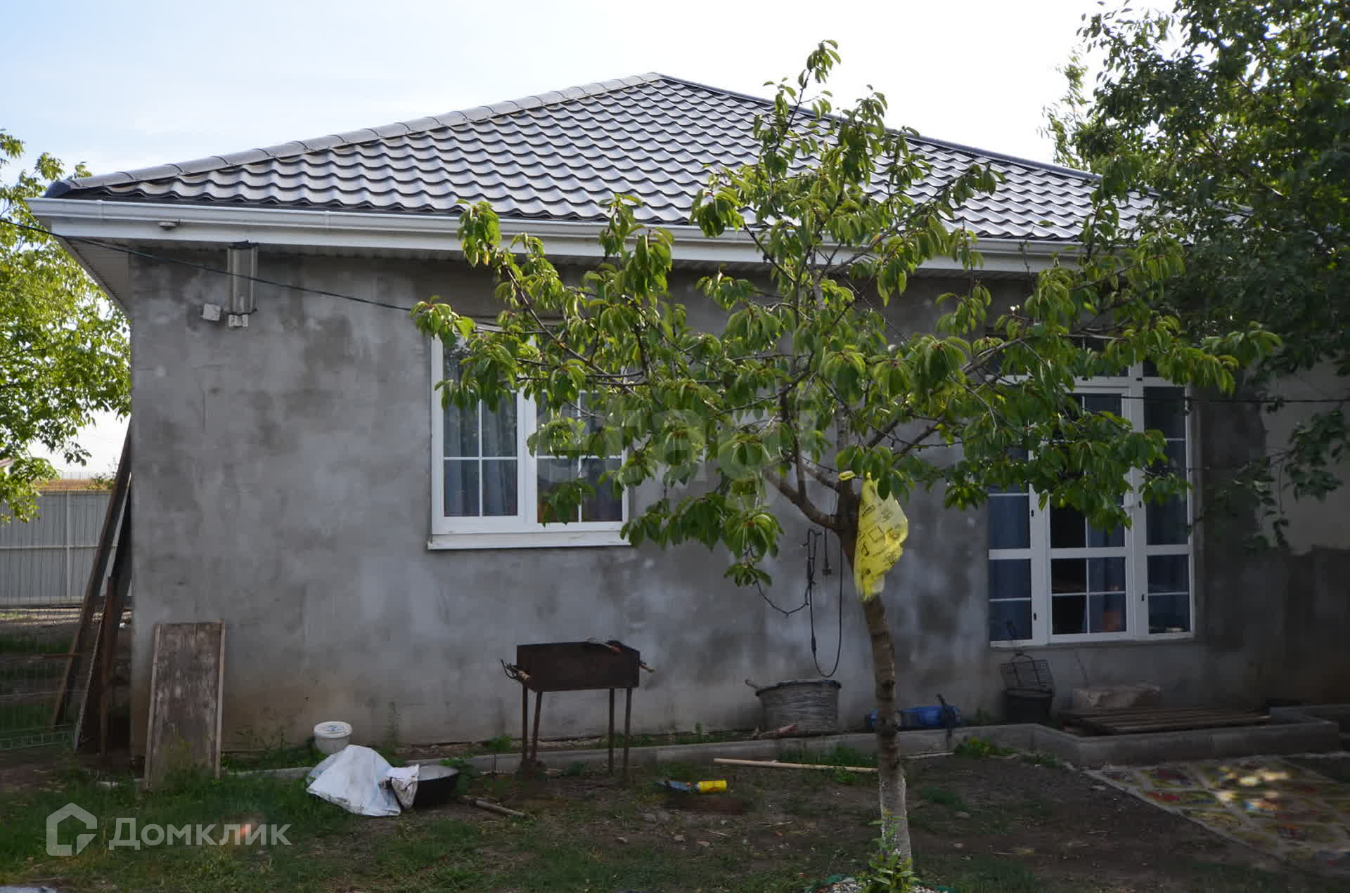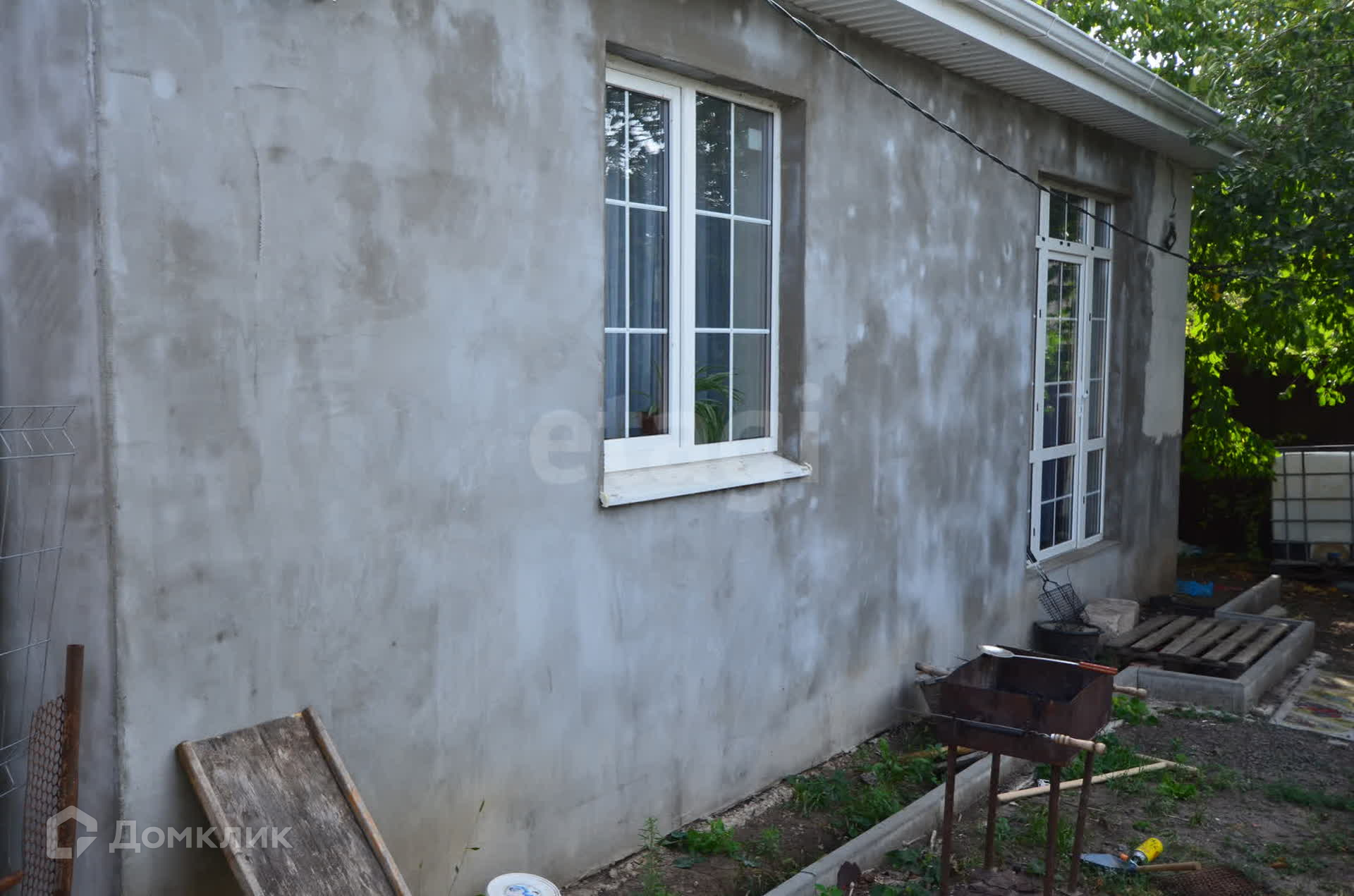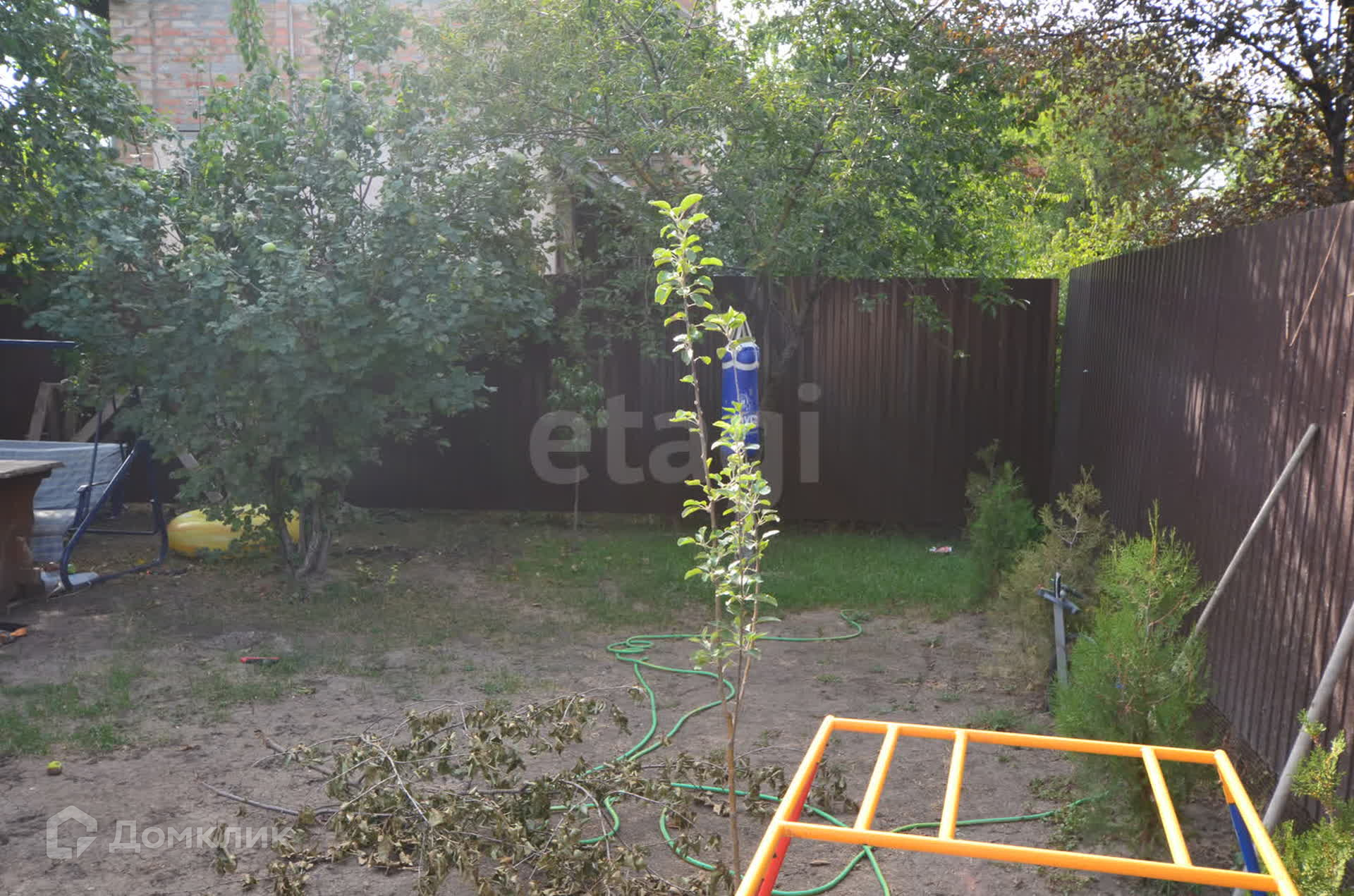 Участок правильной формы, фасад 20 метров, огорожен профнастилом, въезд осуществляется через откатные ворота, возможность разместить до 5 автомобилей. На заднем дворе можно разместить мангальную зону, беседку, установить бассейн, на участке растут плодовые деревья. Также построен уличный душ и санузел. Имеется небольшая хозпостройка.