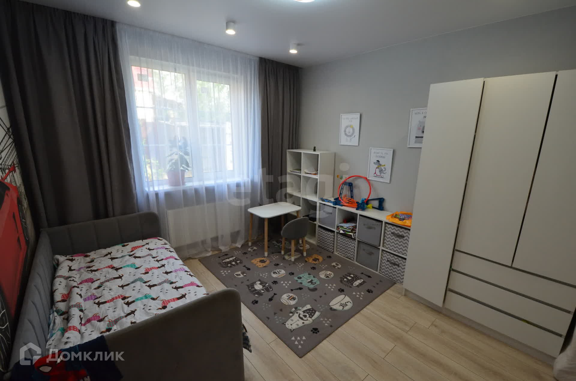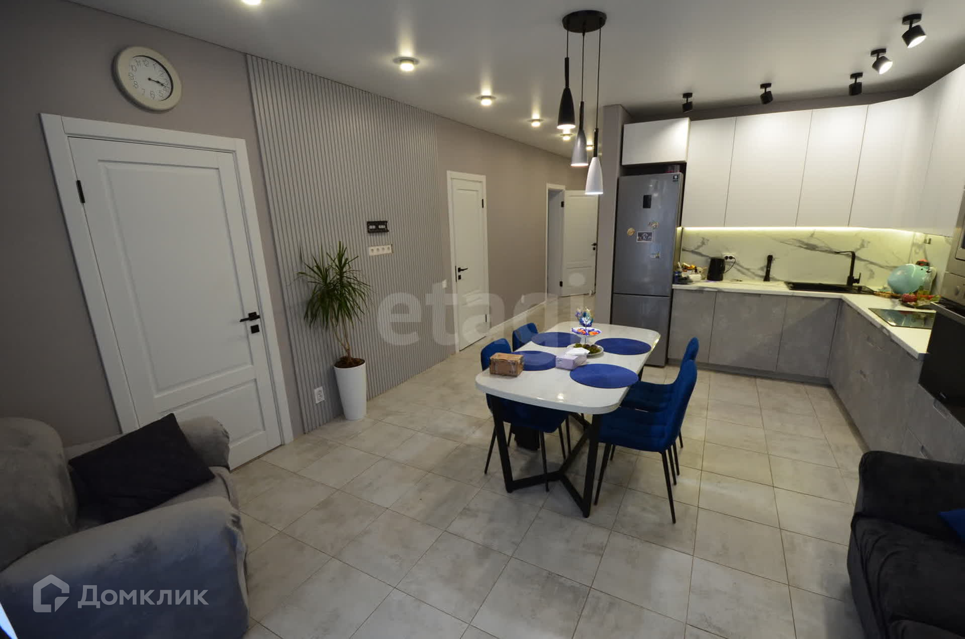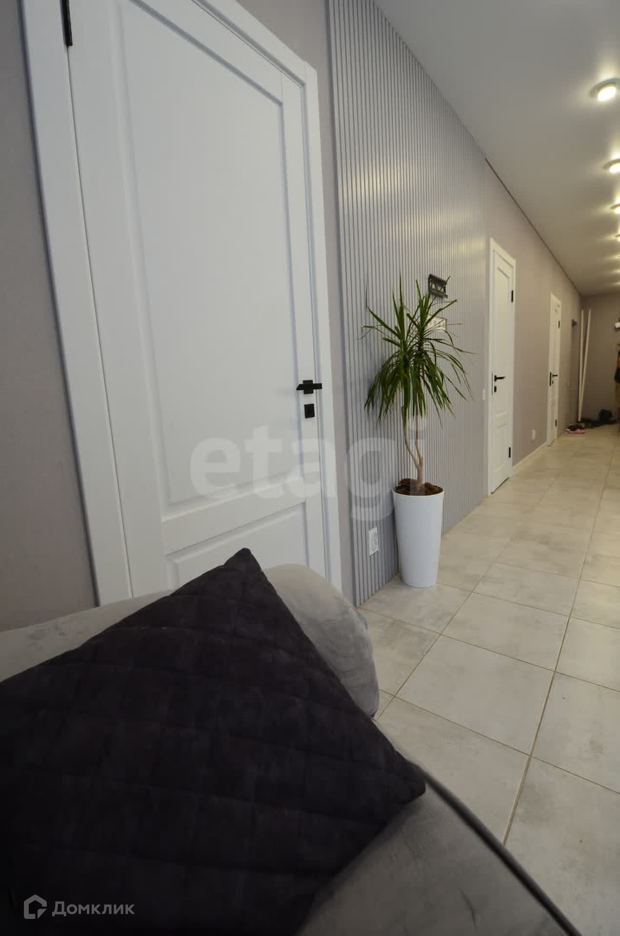 В доме выполнен качественный ремонт в светло-серых тонах. Установлены дорогие межкомнатные двери, поклеены обои, на полу керамическая плитка (в спальнях ламинат), множество точек подключения электроприборов, сделано зонированное освещение во всех комнатах.