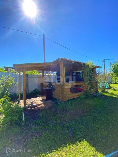Есть беседка. Забор из профнастила. За забором пруд.