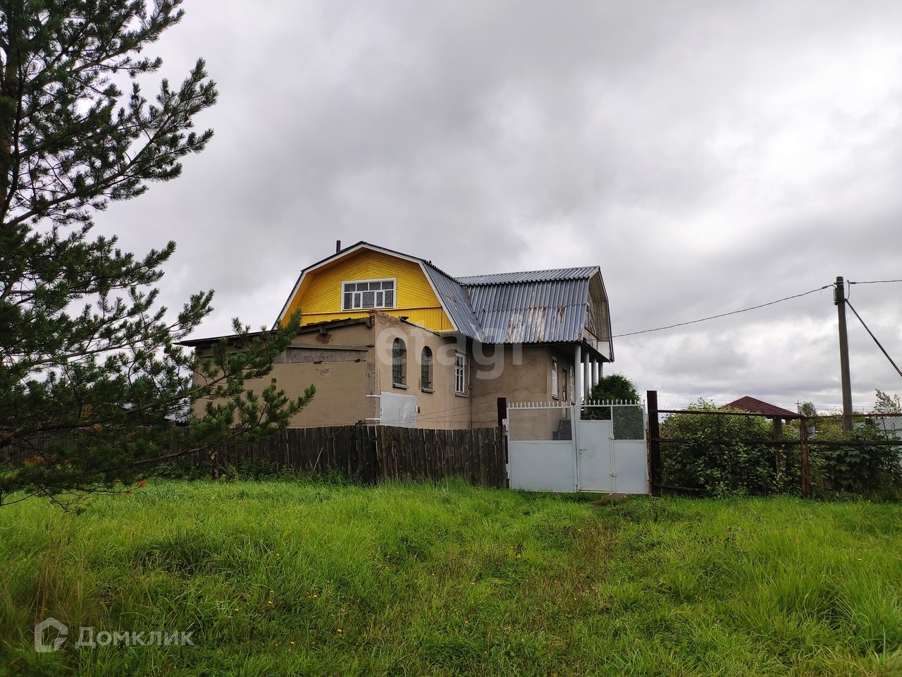 Есть беседка. Забор из профнастила. За забором пруд.