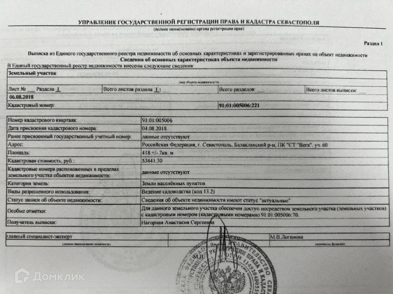 Кадастровый номер участка : 91:01:005006:221.