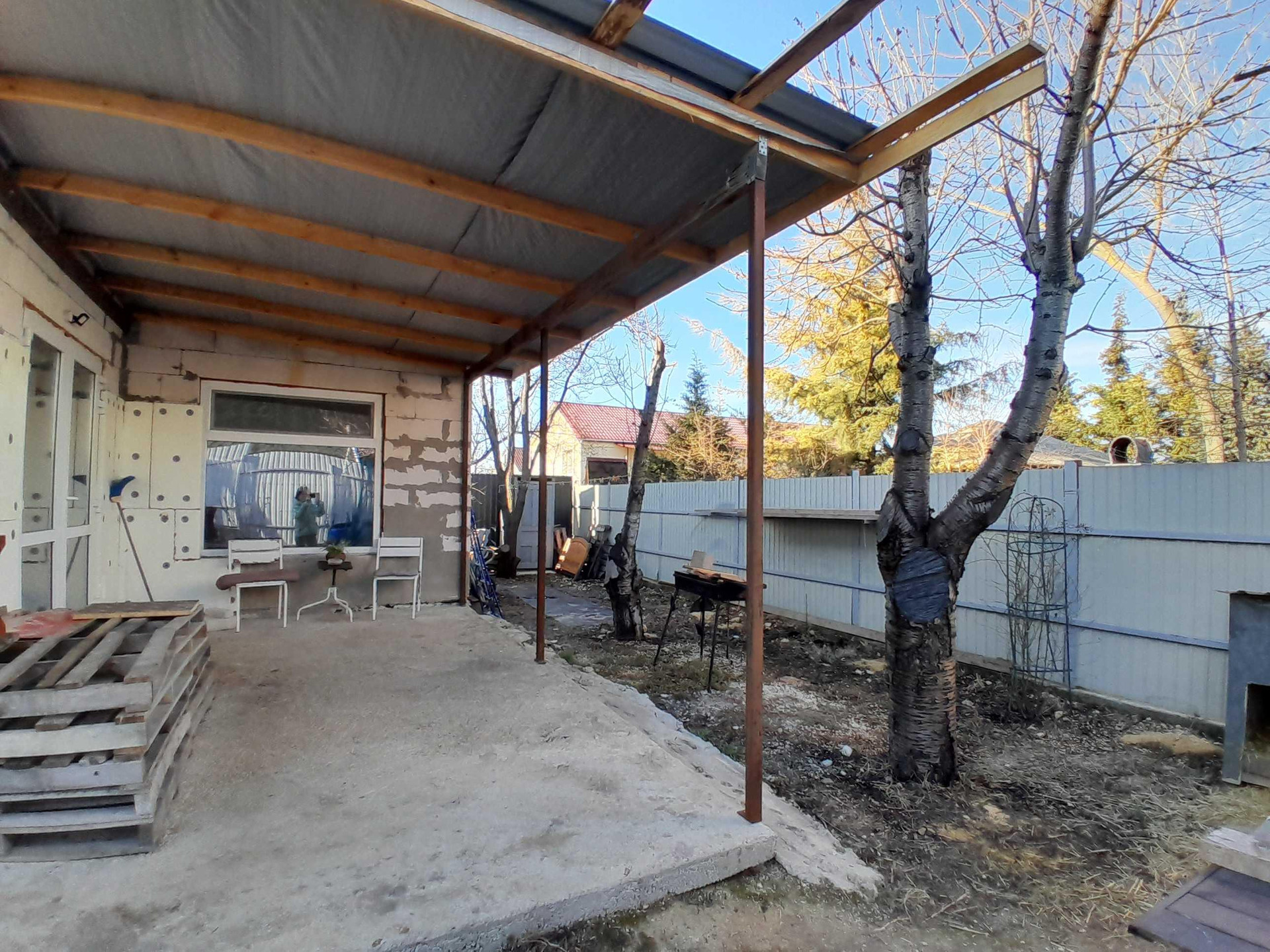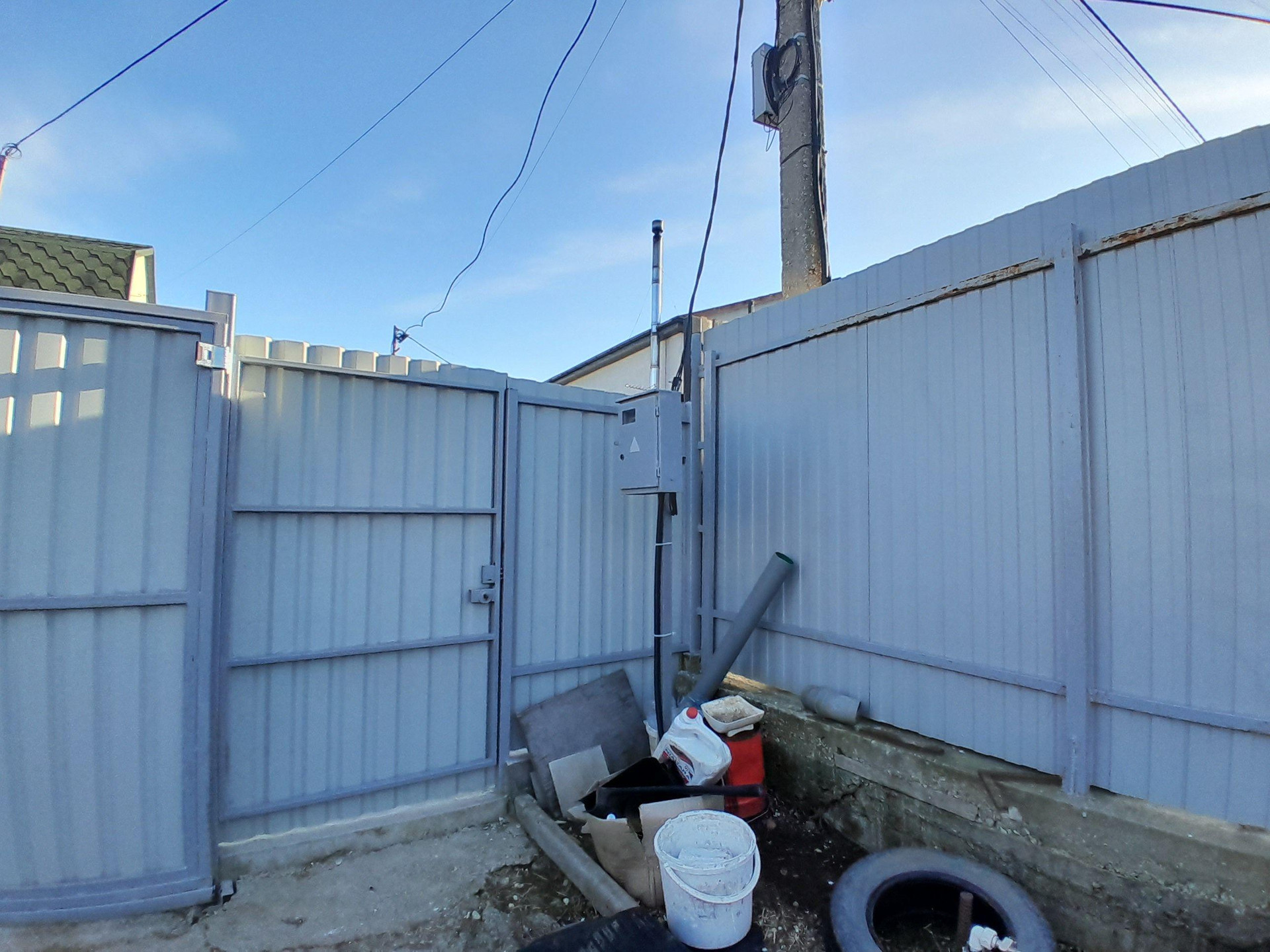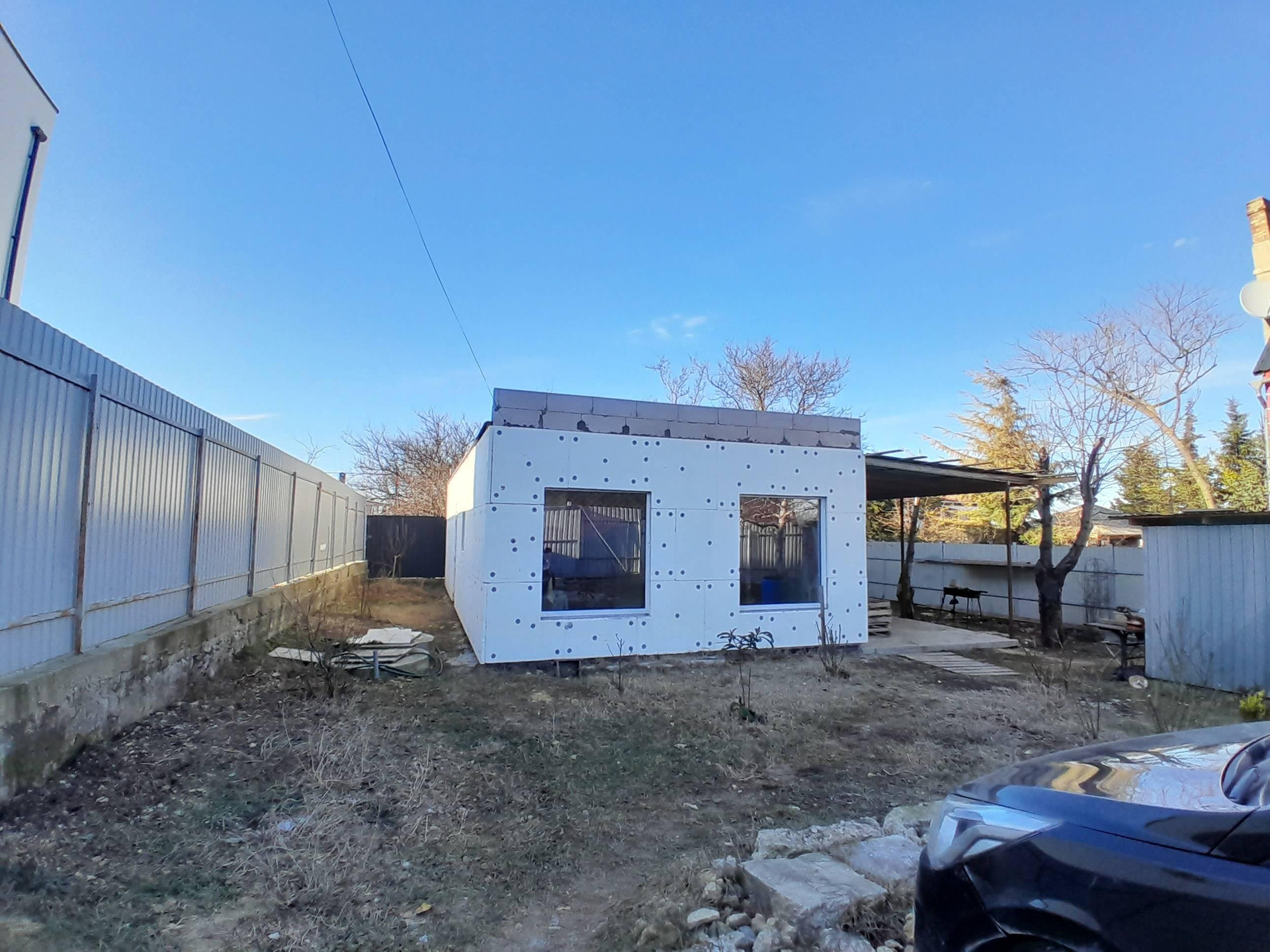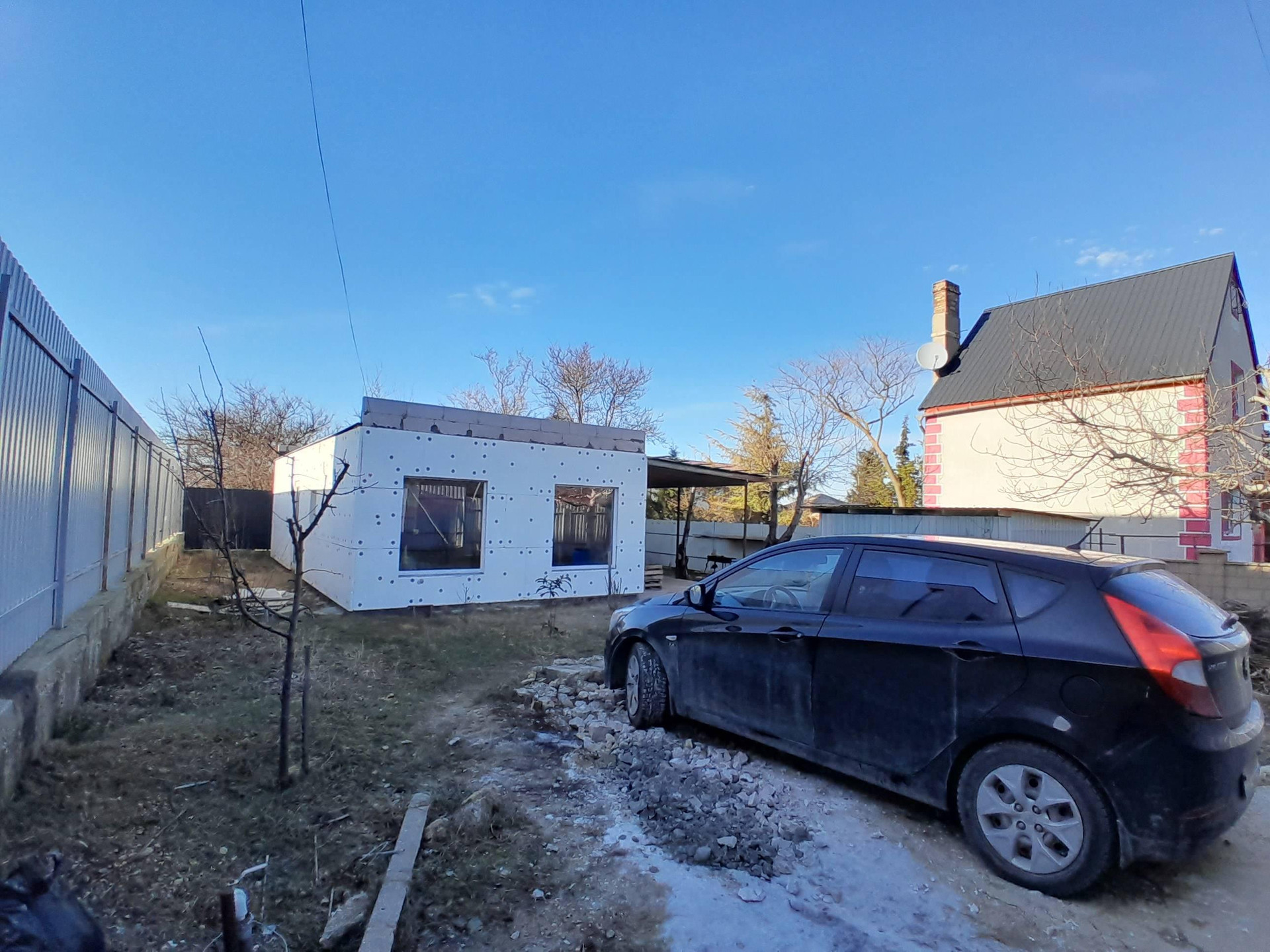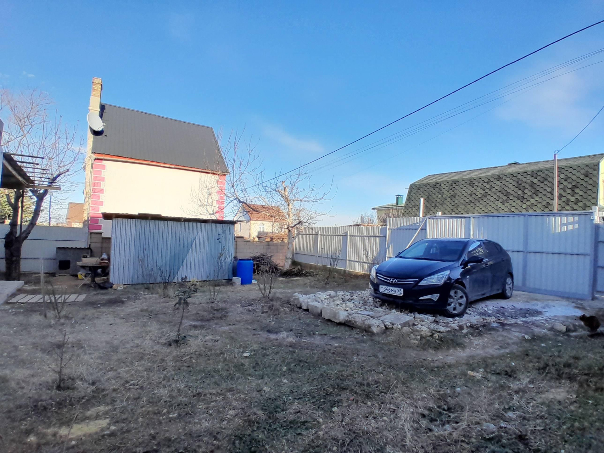 Участок: 4 сотки, прямой, без уклонов, правильной квадратной формы, по периметру огорожен профнастилом толщиной 3 мм, имеются откатные ворота и отдельная калитка. На участке плодовые деревья: черешня, грецкий орех и другие, а также высажены розы под окнами гостиной. На участке также имеются хозпостройка и уличный санузел, парковочное место засыпано щебенкой, место для приготовления шашлыка у террасы.