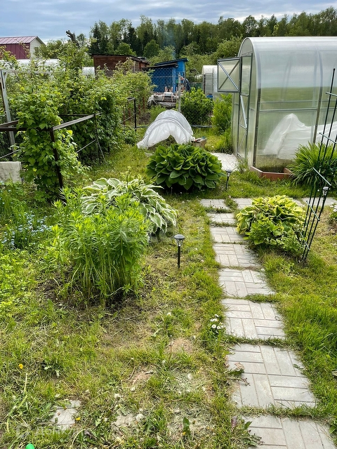 На участке растёт: малина, клубника, смородина, розы, гортензии, туи, ирисы, пионы  и др.