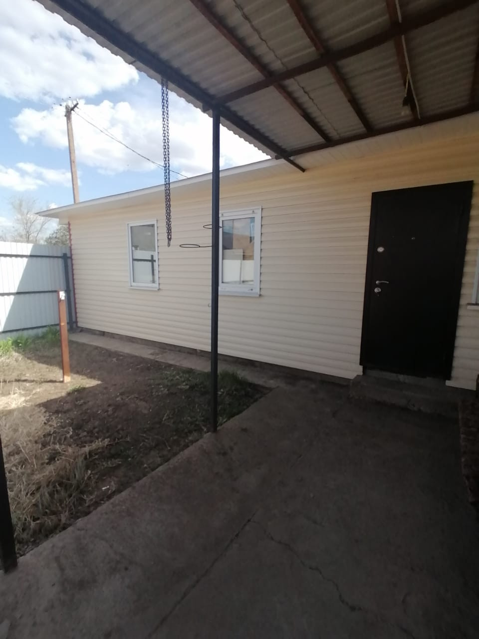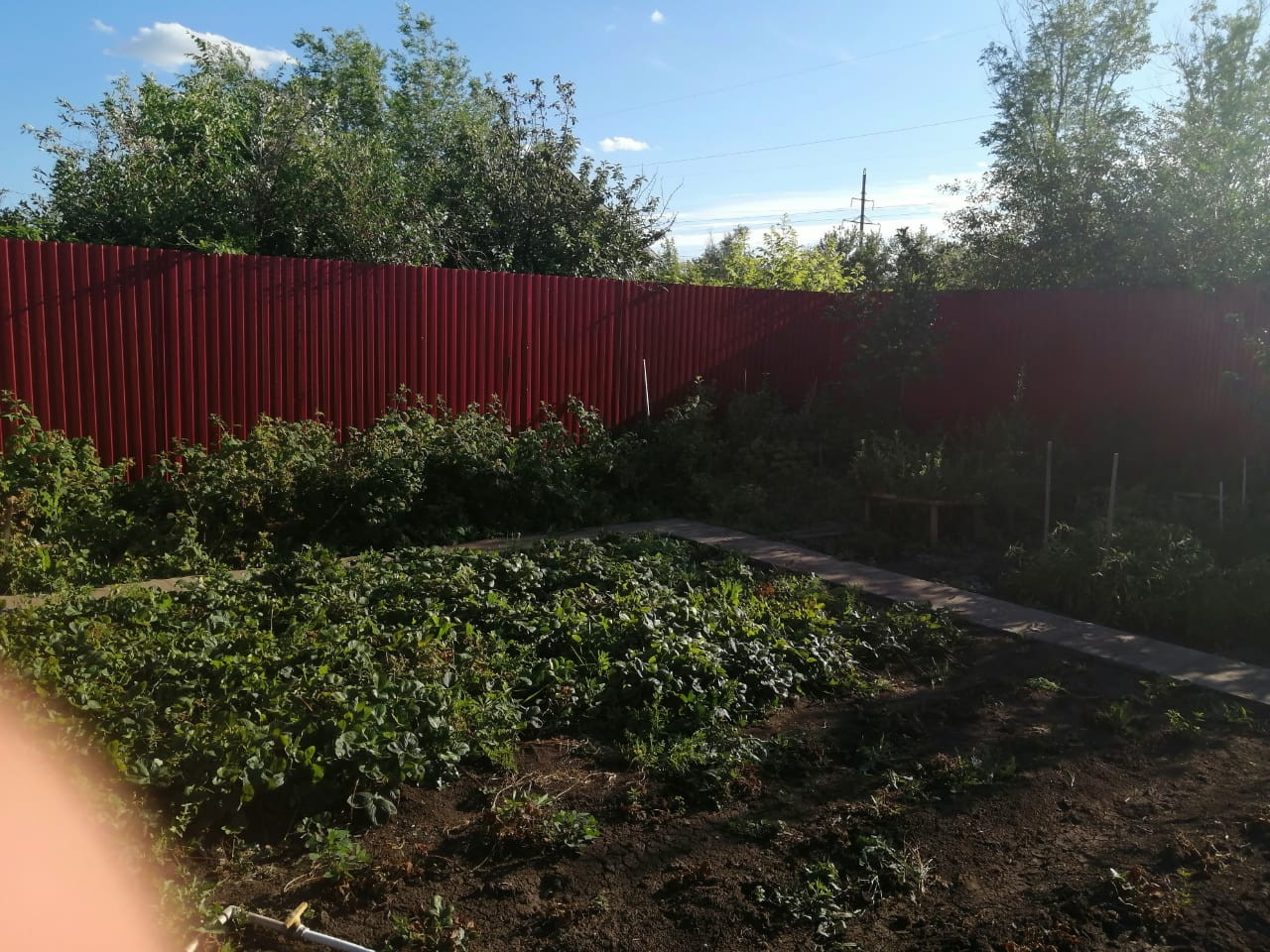 Участок обнесен забором из профлиста, во дворе площадка под автомобиль. На участке: яблони, абрикос, вишня, малина, крыжовник, клубника и виноград.