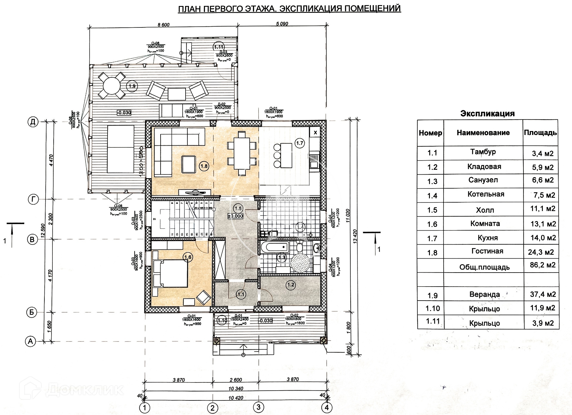 1 этаж: крыльцо, прихожая, кладовая, котельная, гостиная - кухня, комната для сан.узла, спальная комната, веранда.
