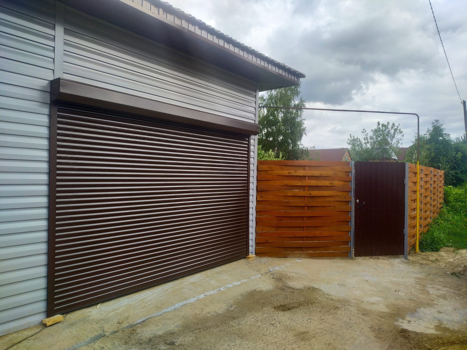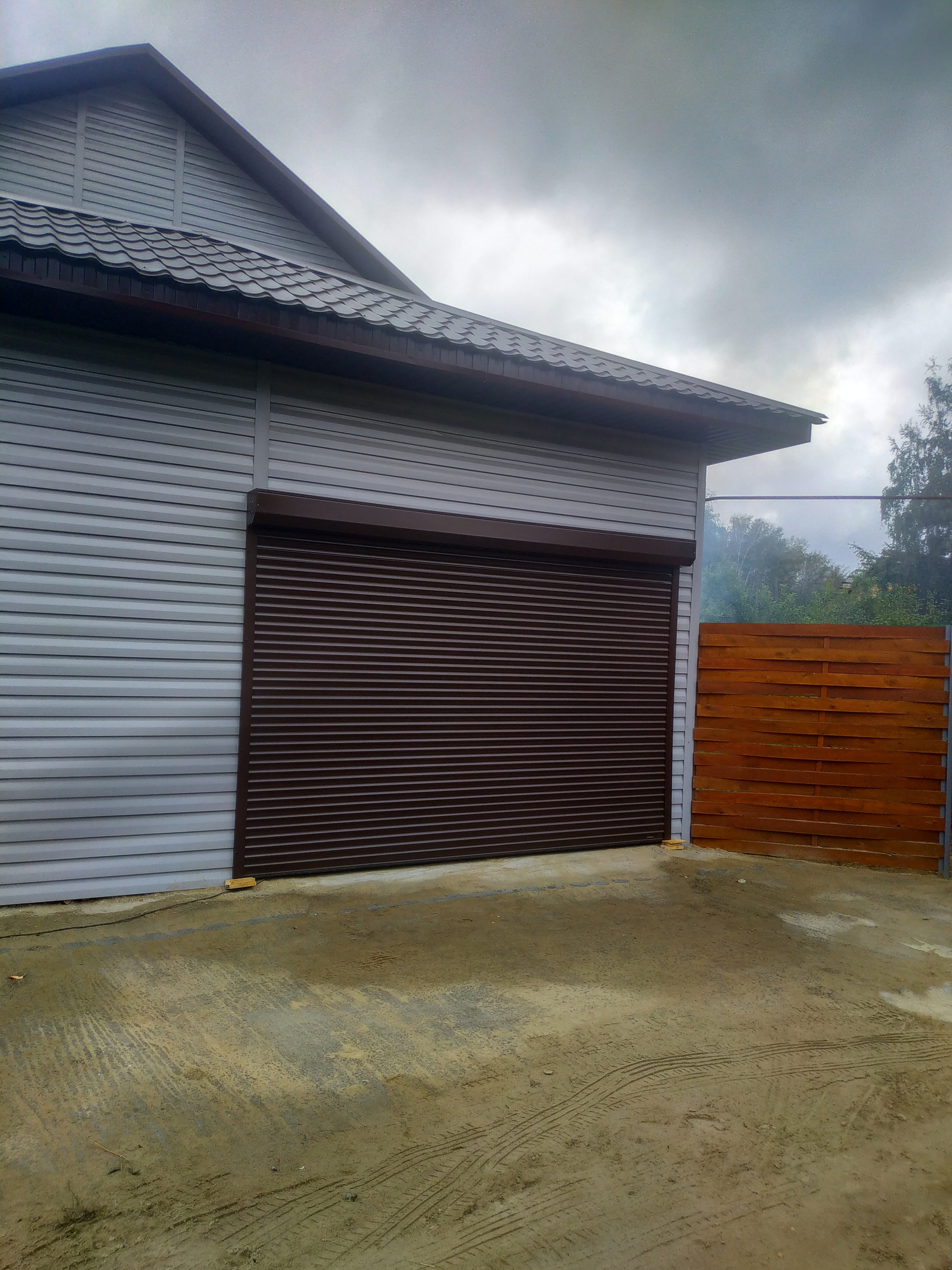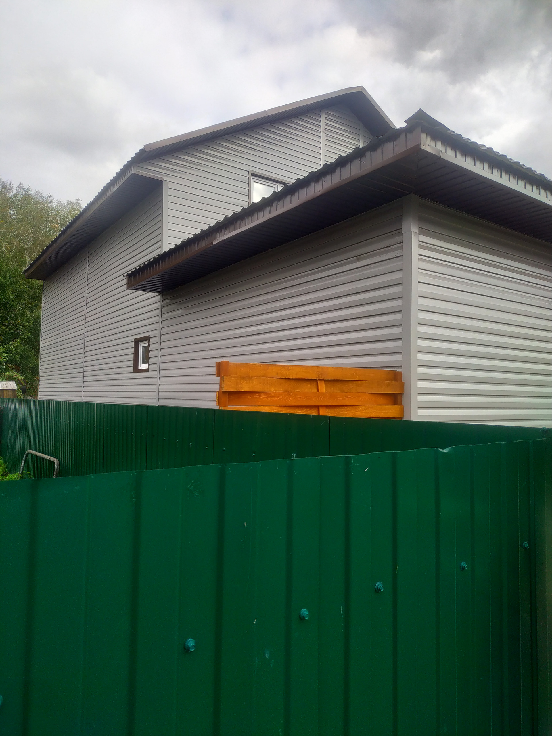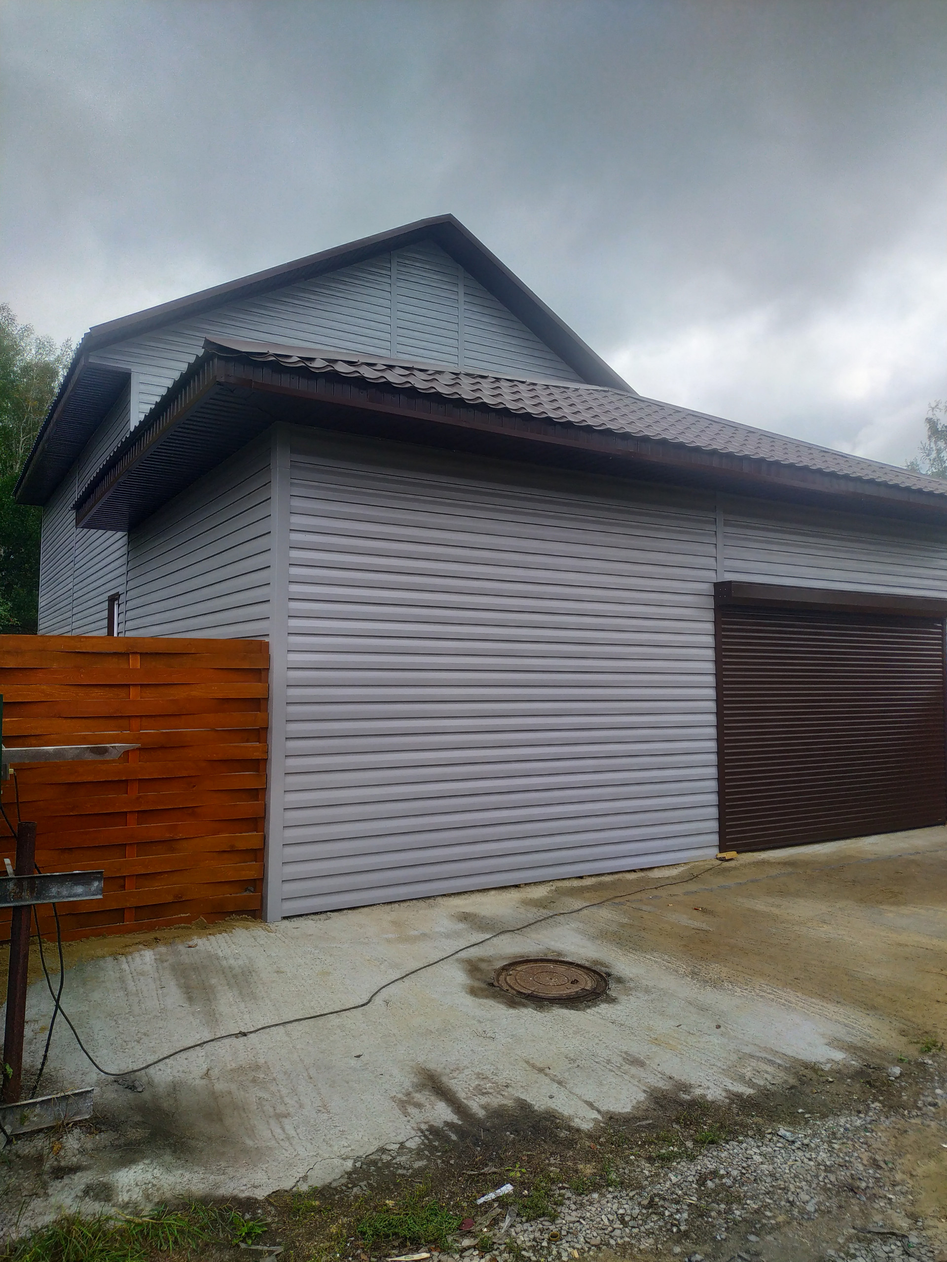 Гараж на одну машину обшит OSB. Выделено помещение под баню. Вокруг дома сделана отмостка из бетона.