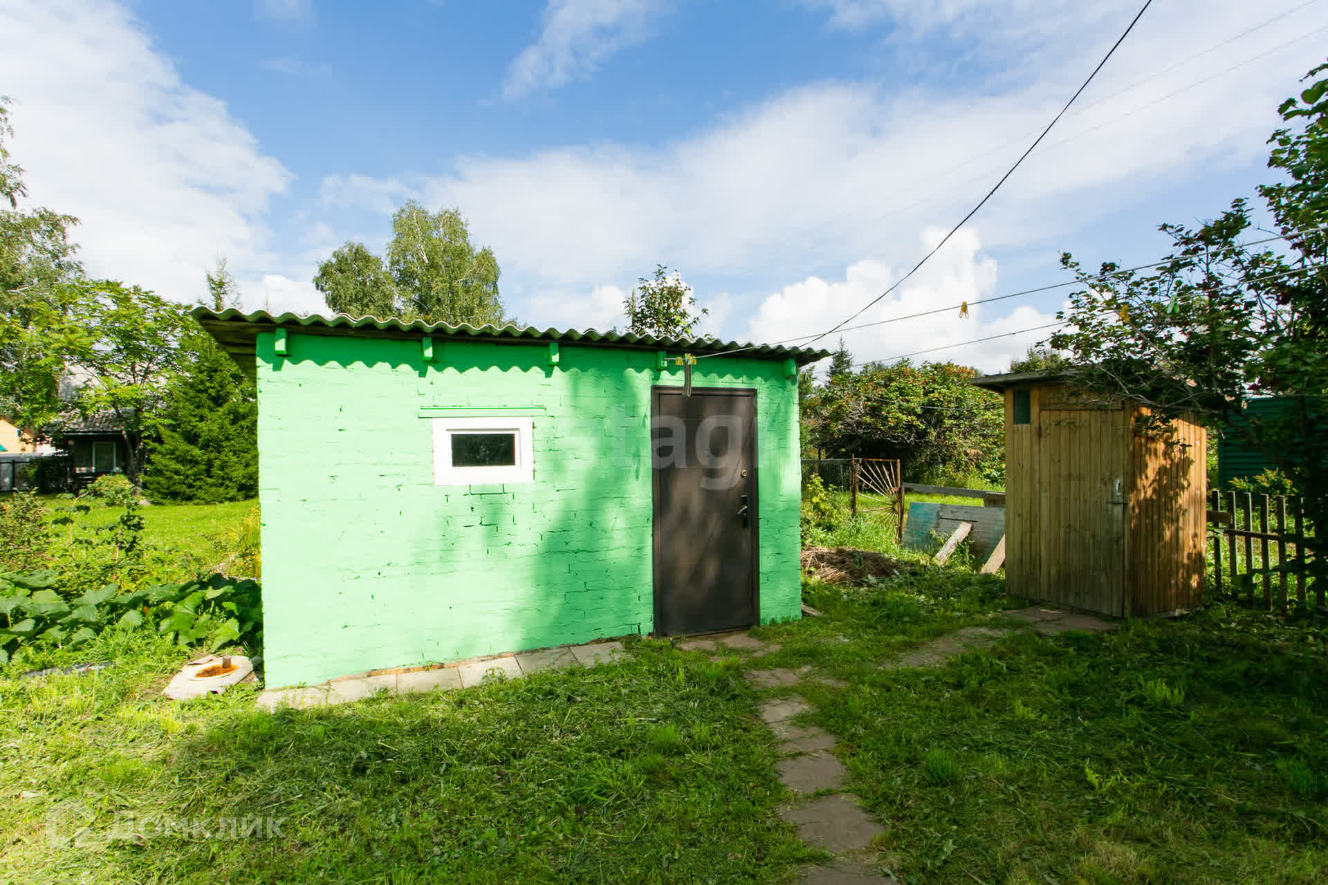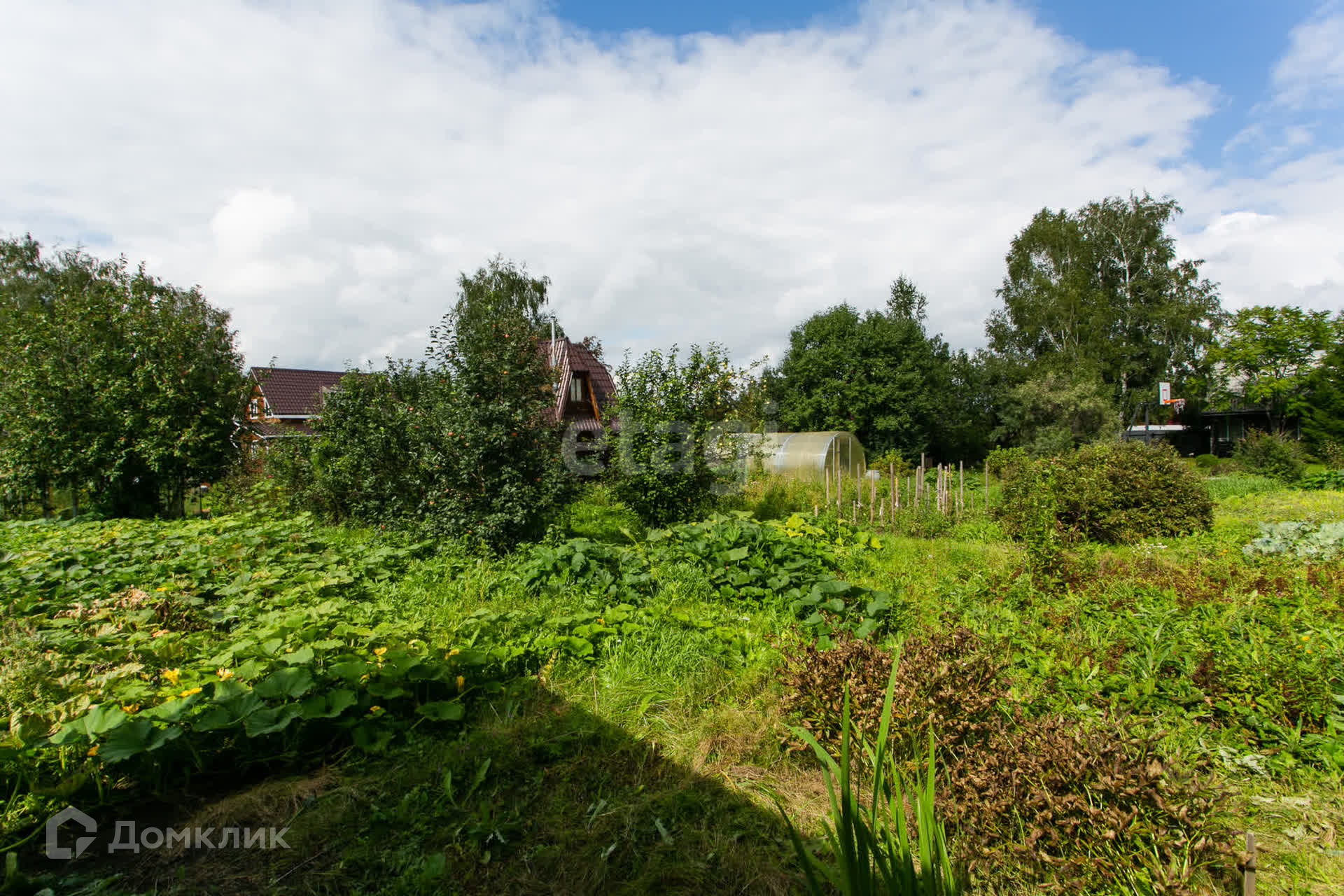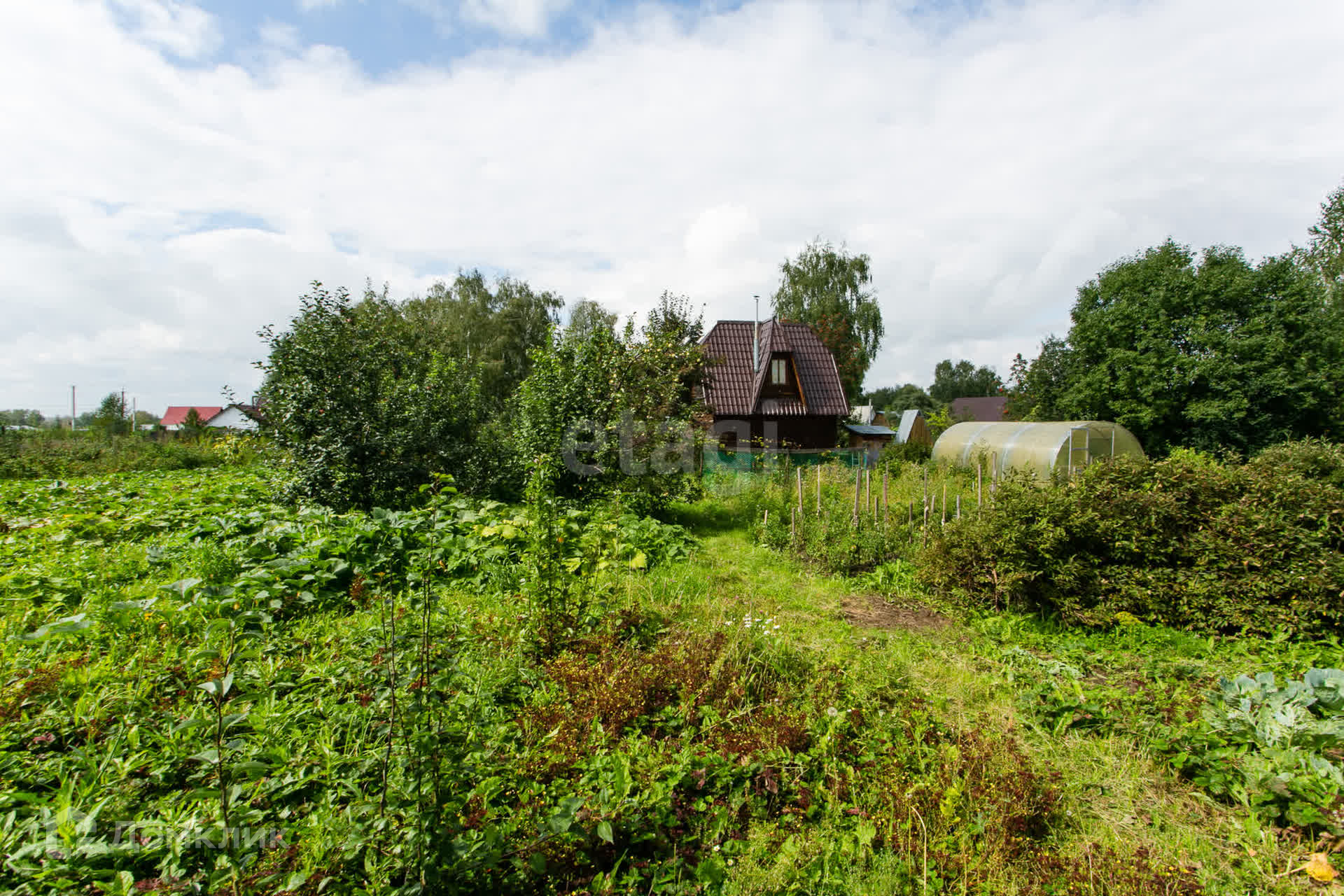 На участке баня с летней мансардной комнатой, сарай для садовой техники и инвентаря, две теплицы.