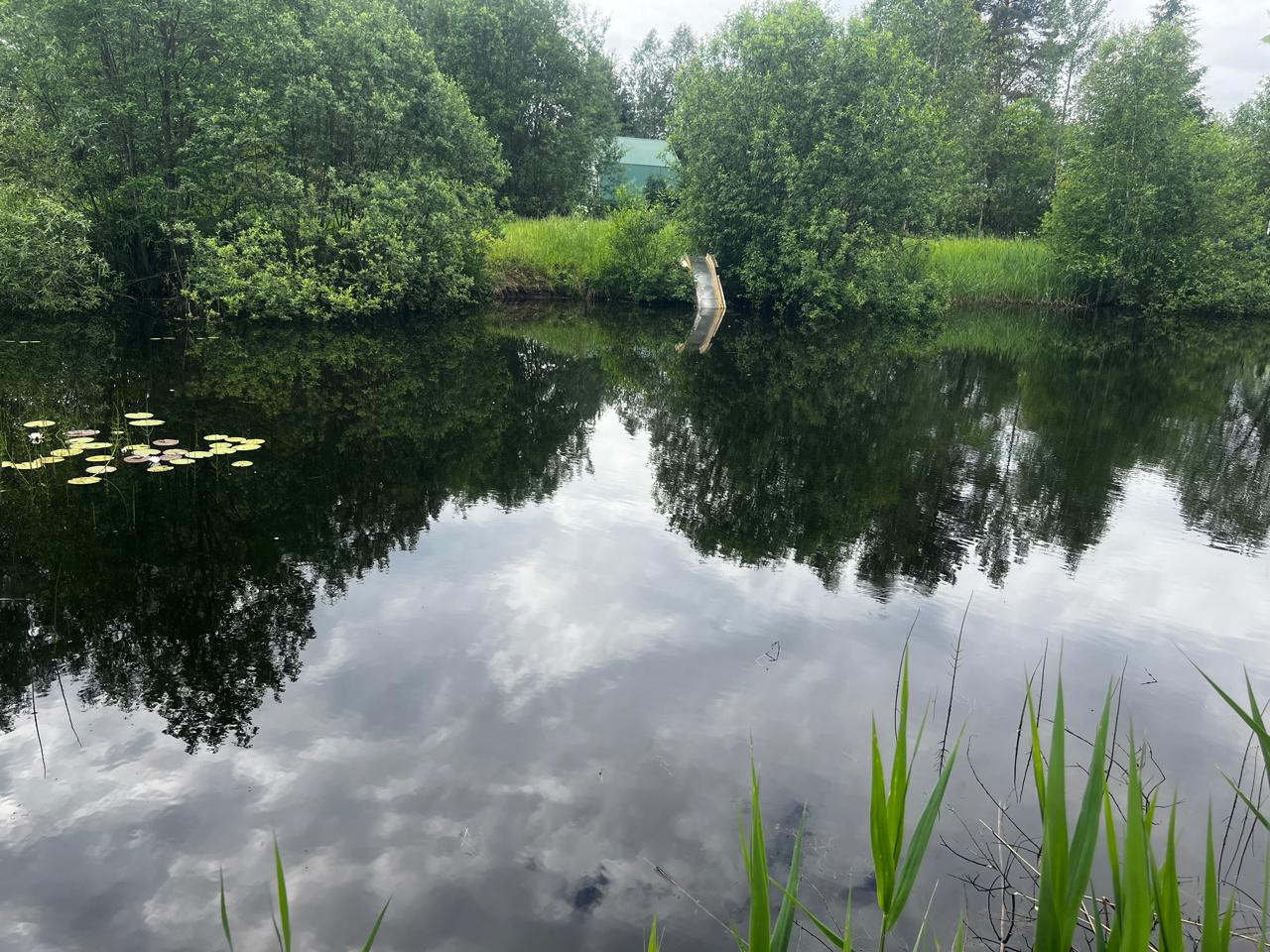 Участок ровный, правильной формы, ухожен, оборудованы грядки, растут кустарники, смородина, малина, клубника. Около дома достаточно места для парковки авто и личного пространства, напротив нет соседей, только пруд и живописный лес.
