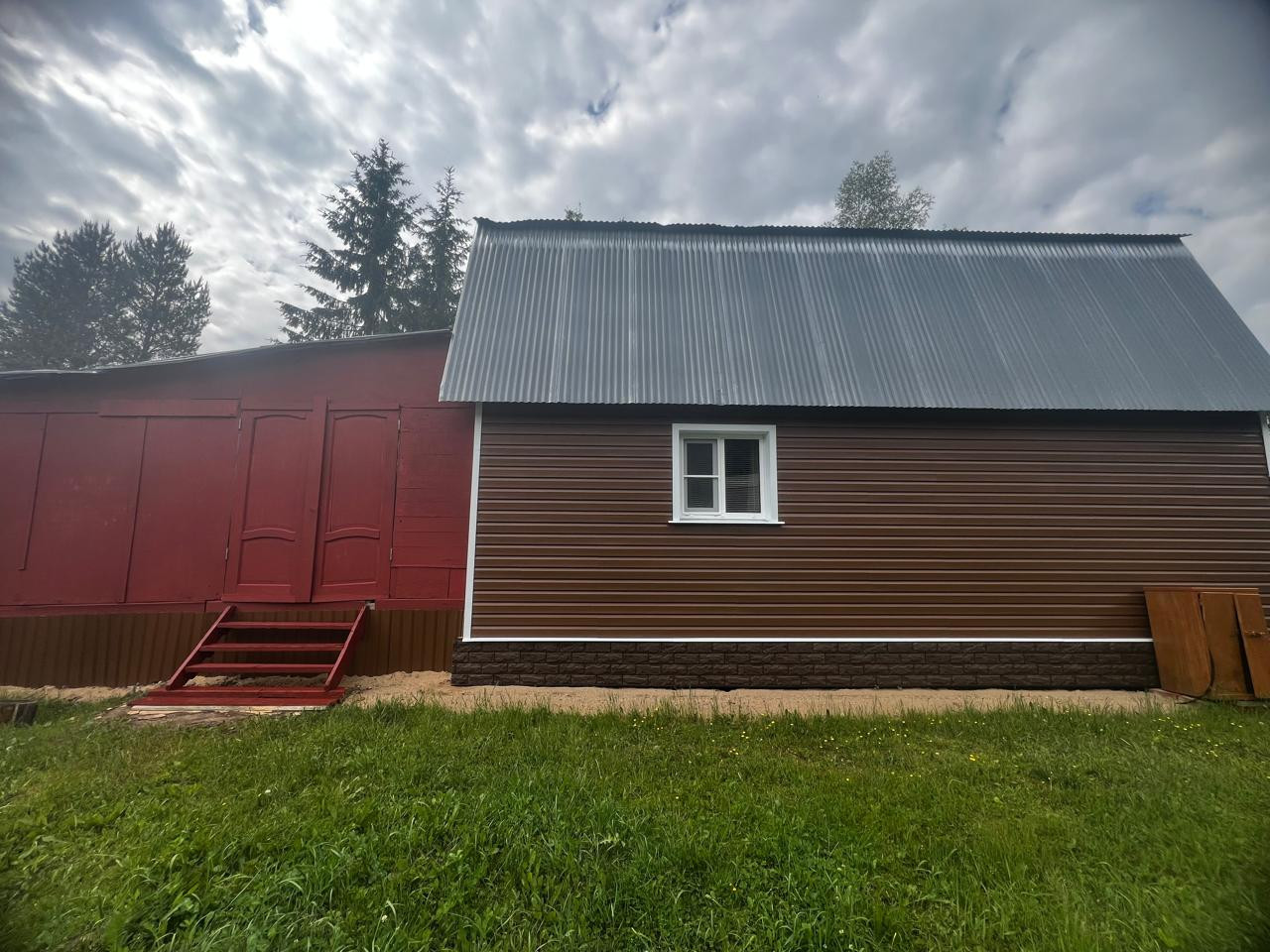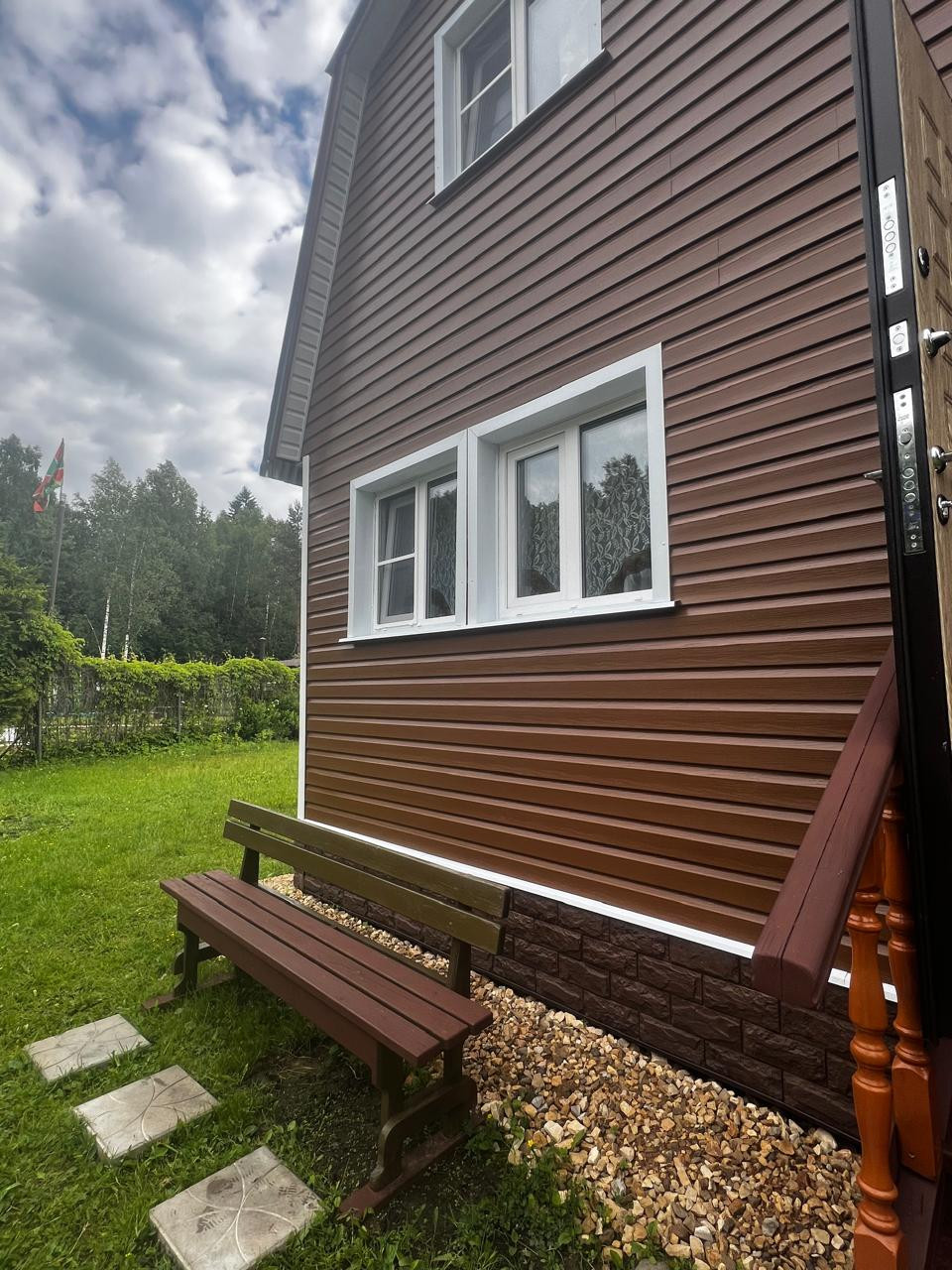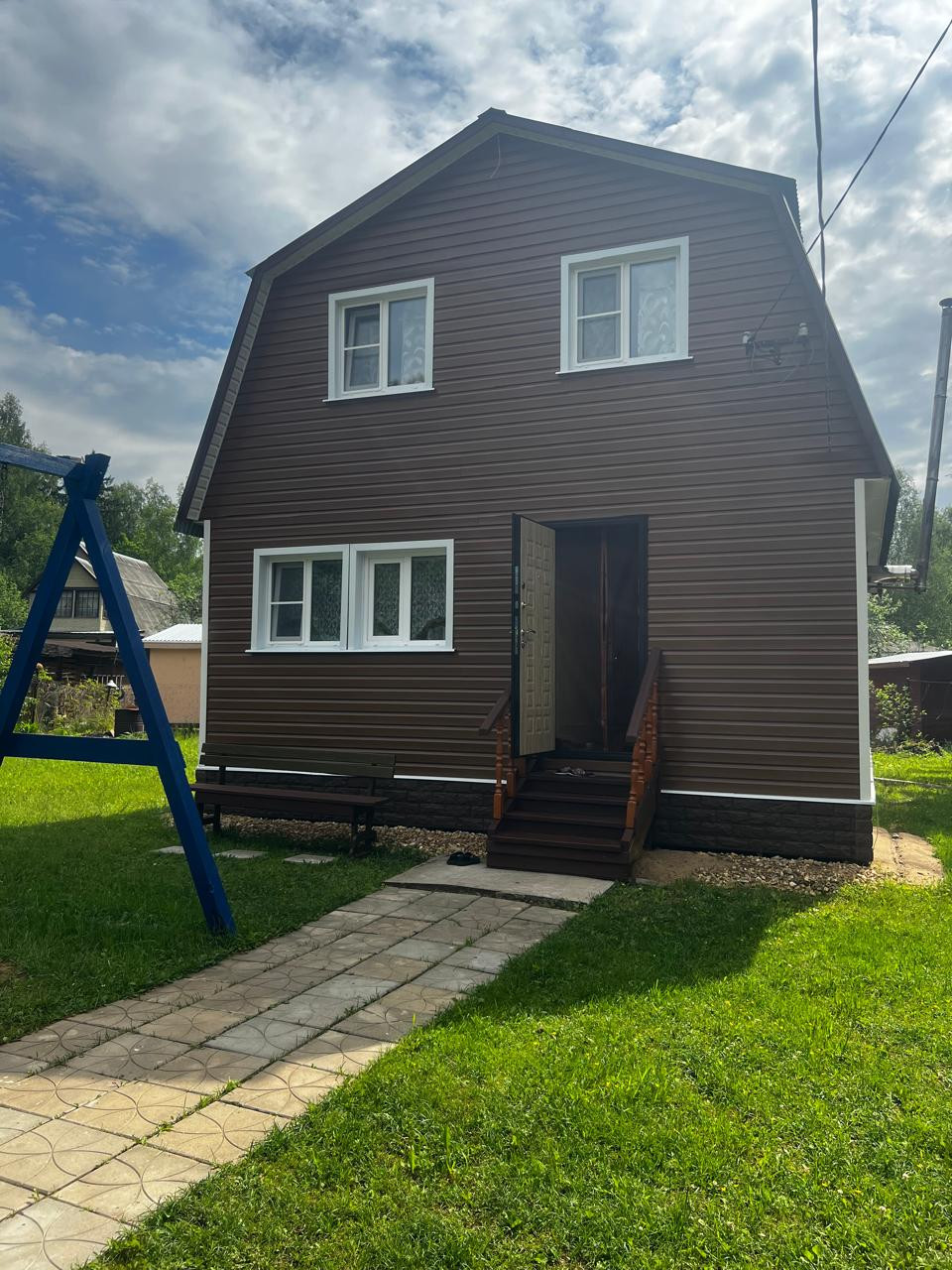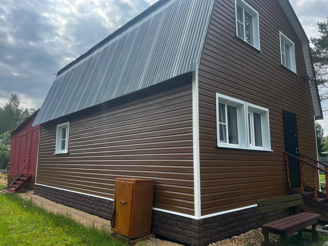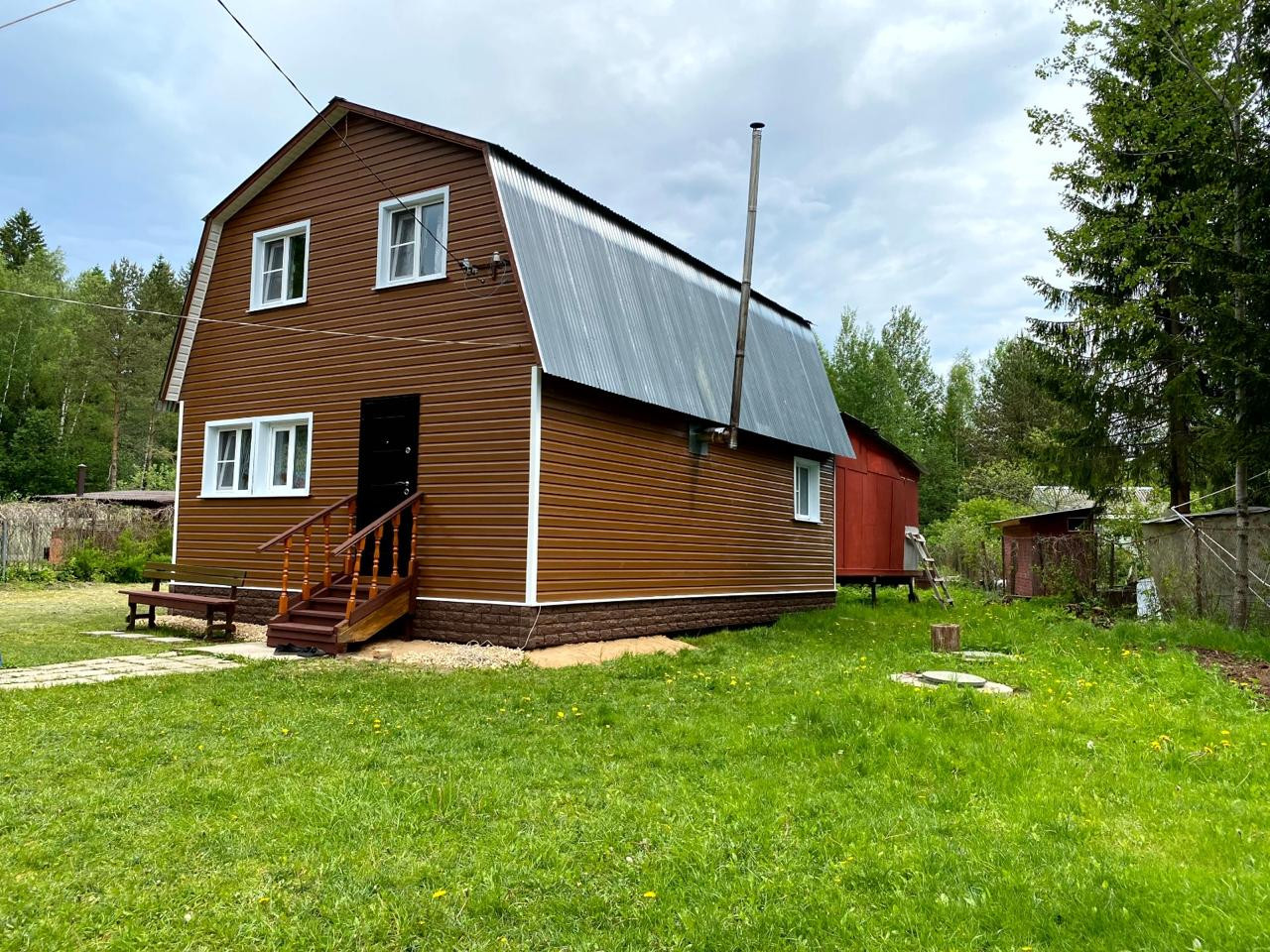Дом каркасный, рассчитан под круглогодичное проживание на свайном фундаменте, утеплен, обшит сайдингом. Крыша - металл.