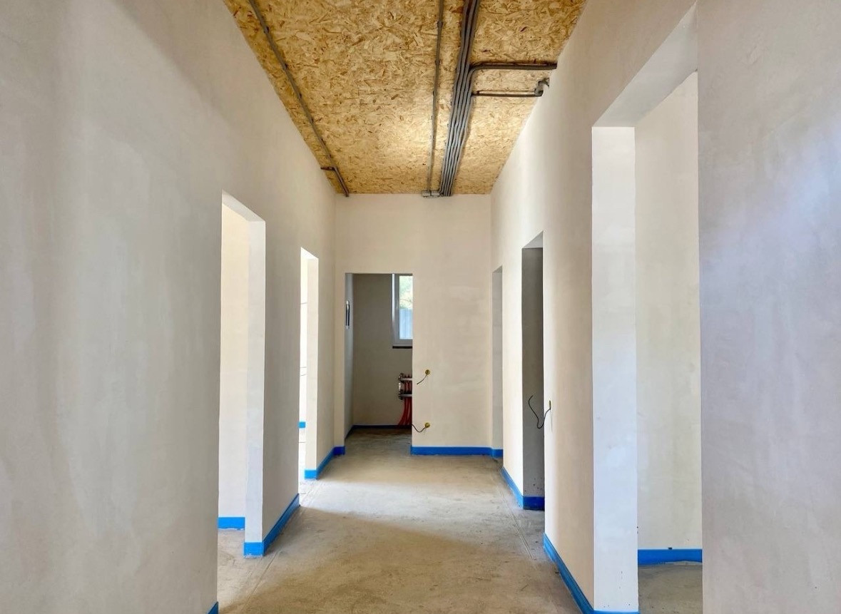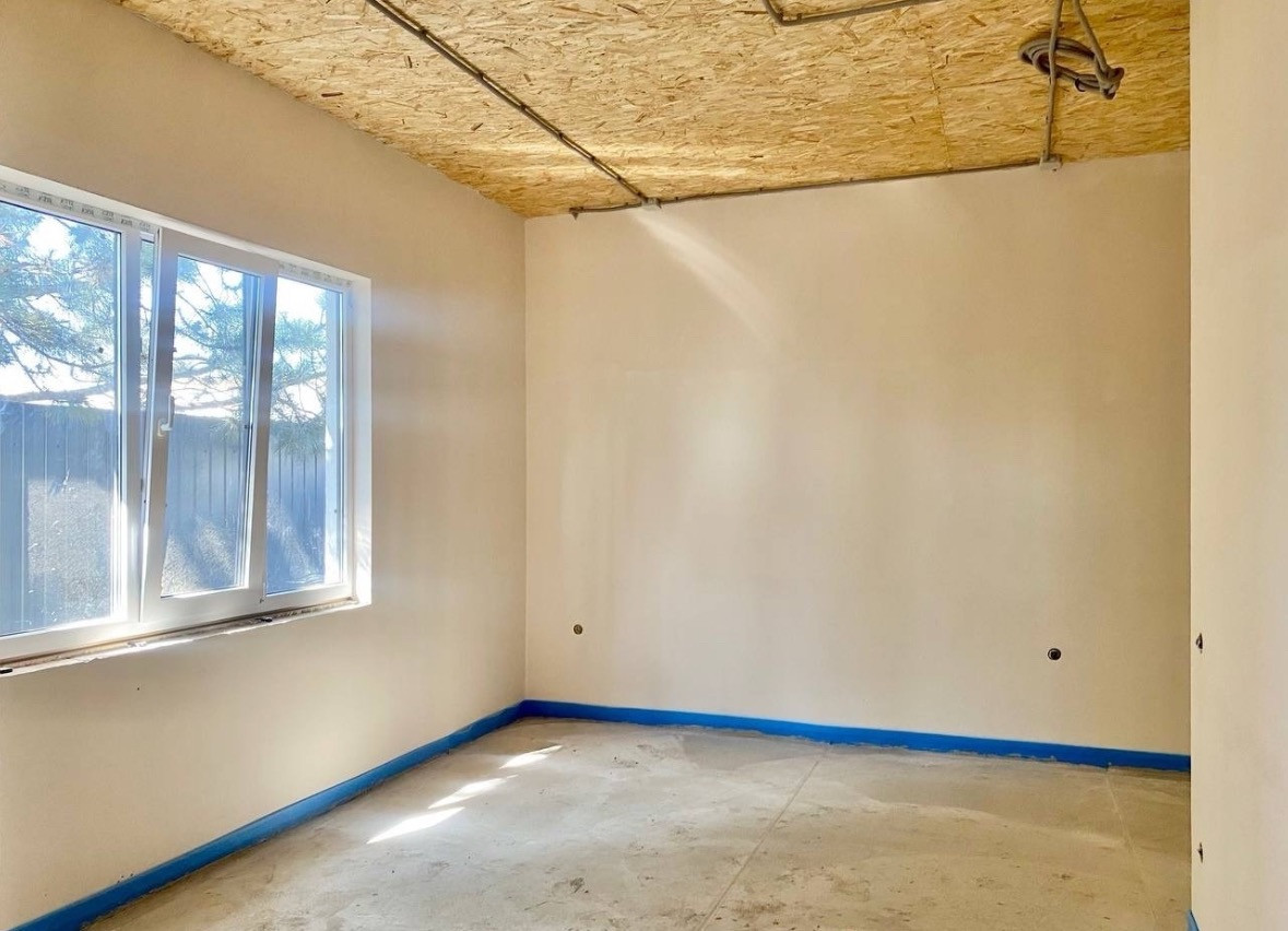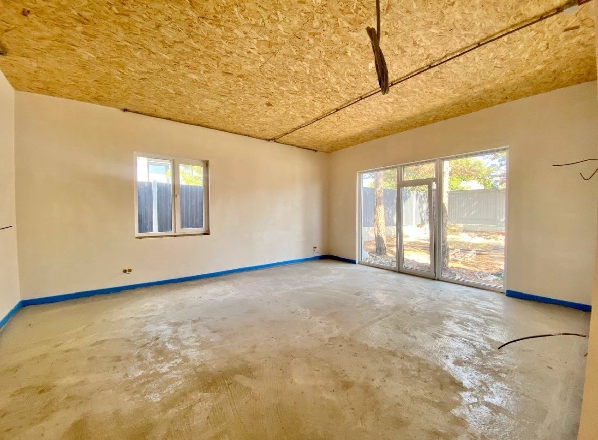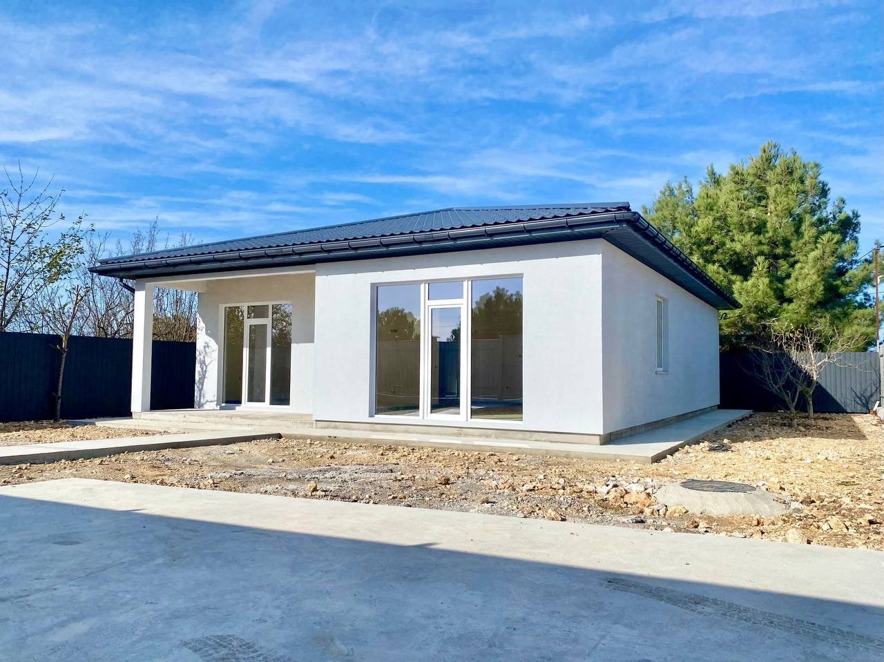 Дом  оптимальной площади-120м2, одноэтажный, из газобетона, с отделкой фасада, предчистовой отделкой стен, разводкой света, воды, теплым полом, септиком, площадкой под авто, забором и откатными воротами- максимальная предчистовая комплектация.
