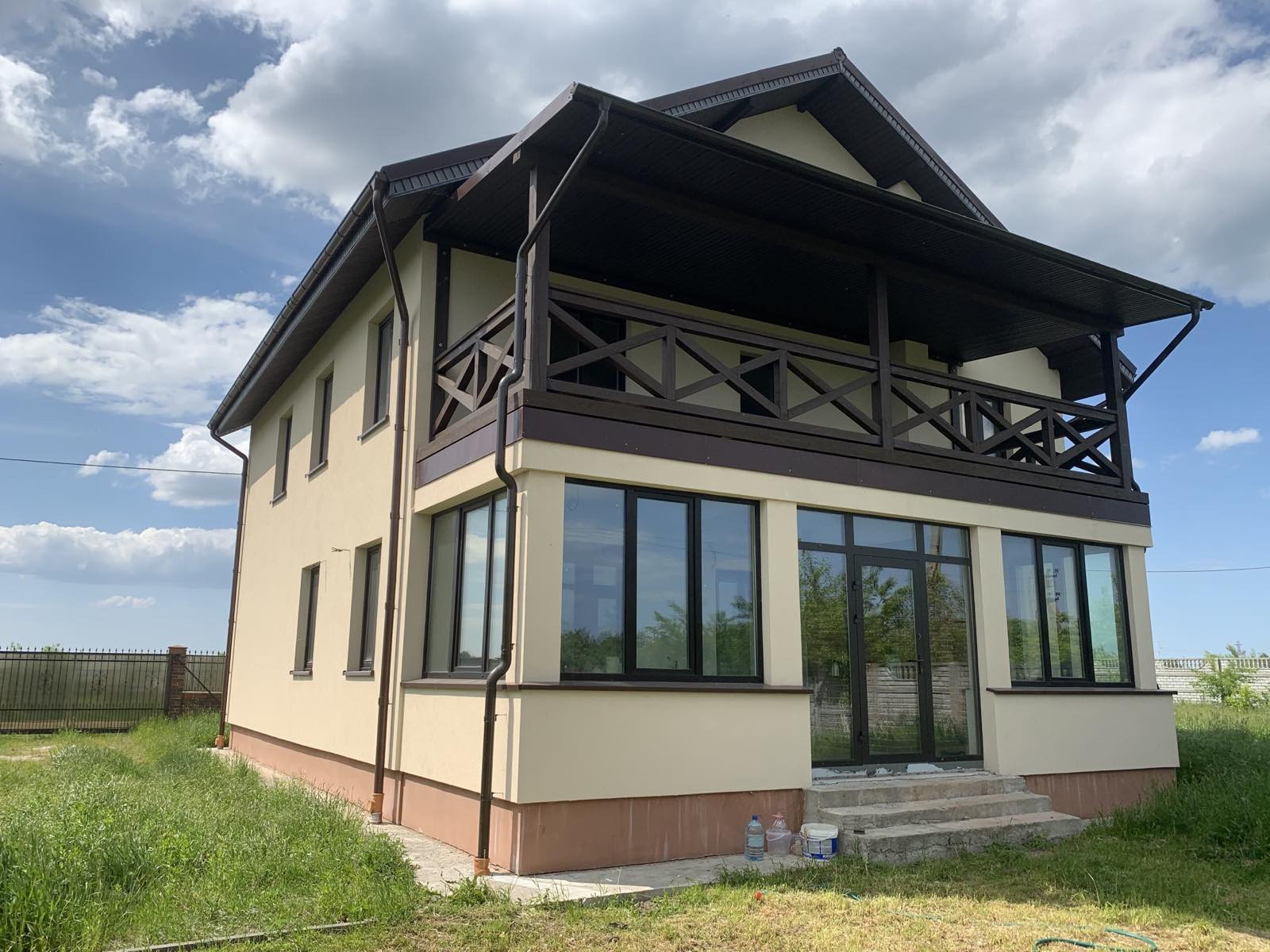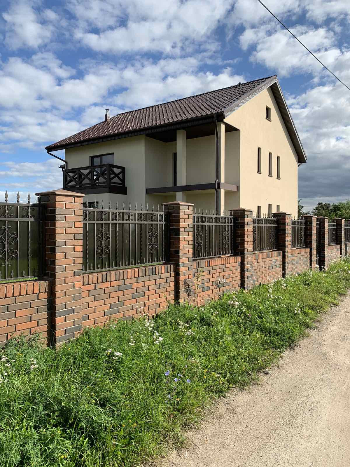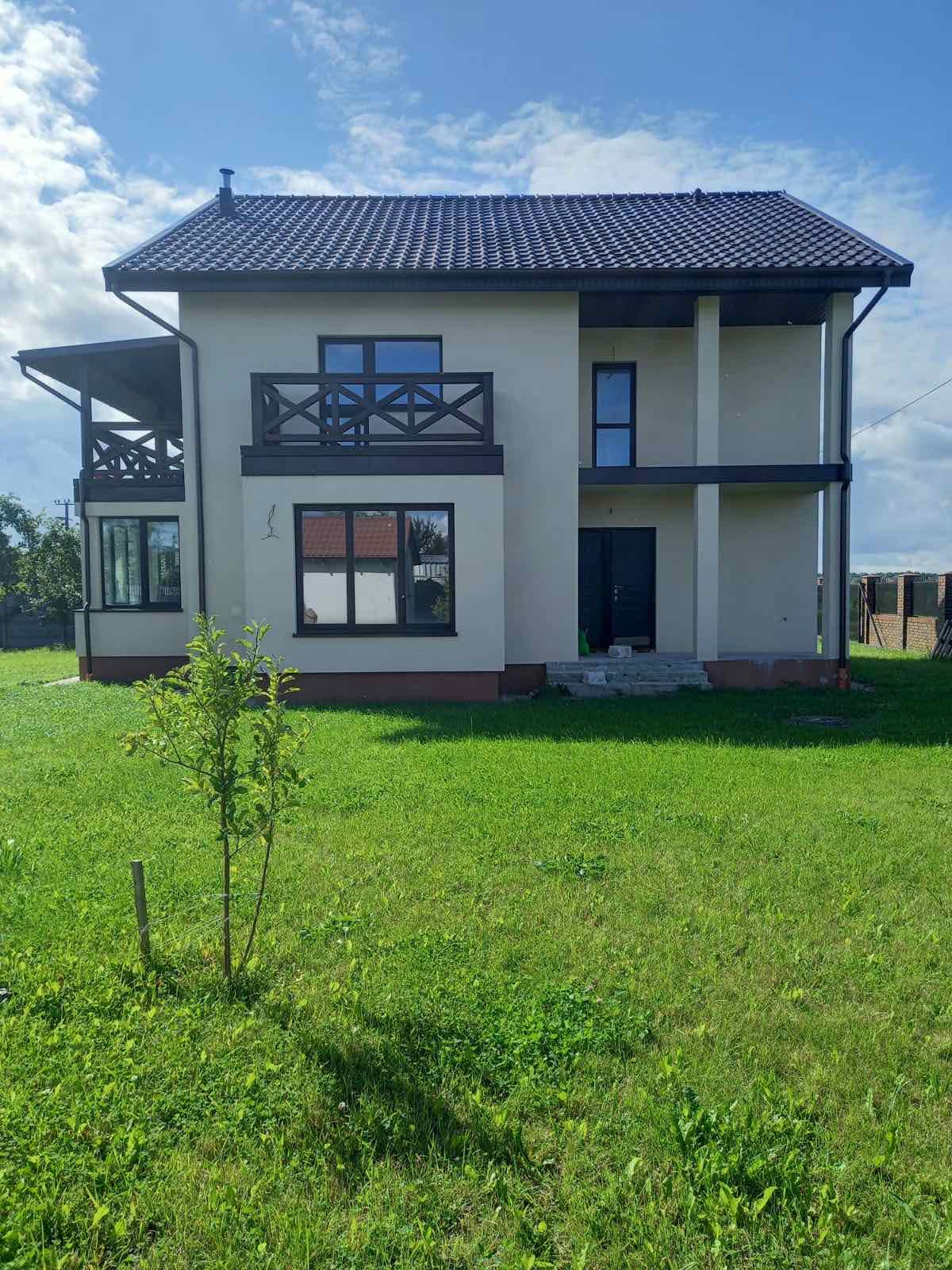 Дом современный, с зимней и летней террасами, выполнен из газосиликатных блоков 300 мм с утеплением 80 мм базальной ватой, оштукатуренный цветным короедом 2,5 мм. Крыша - немецкая черепица с водосточной системой, мансарда утеплена и обшита деревом. Внутренняя отделка – под "серый ключ", чистовая стяжка пола (утепление, гидроизоляция).