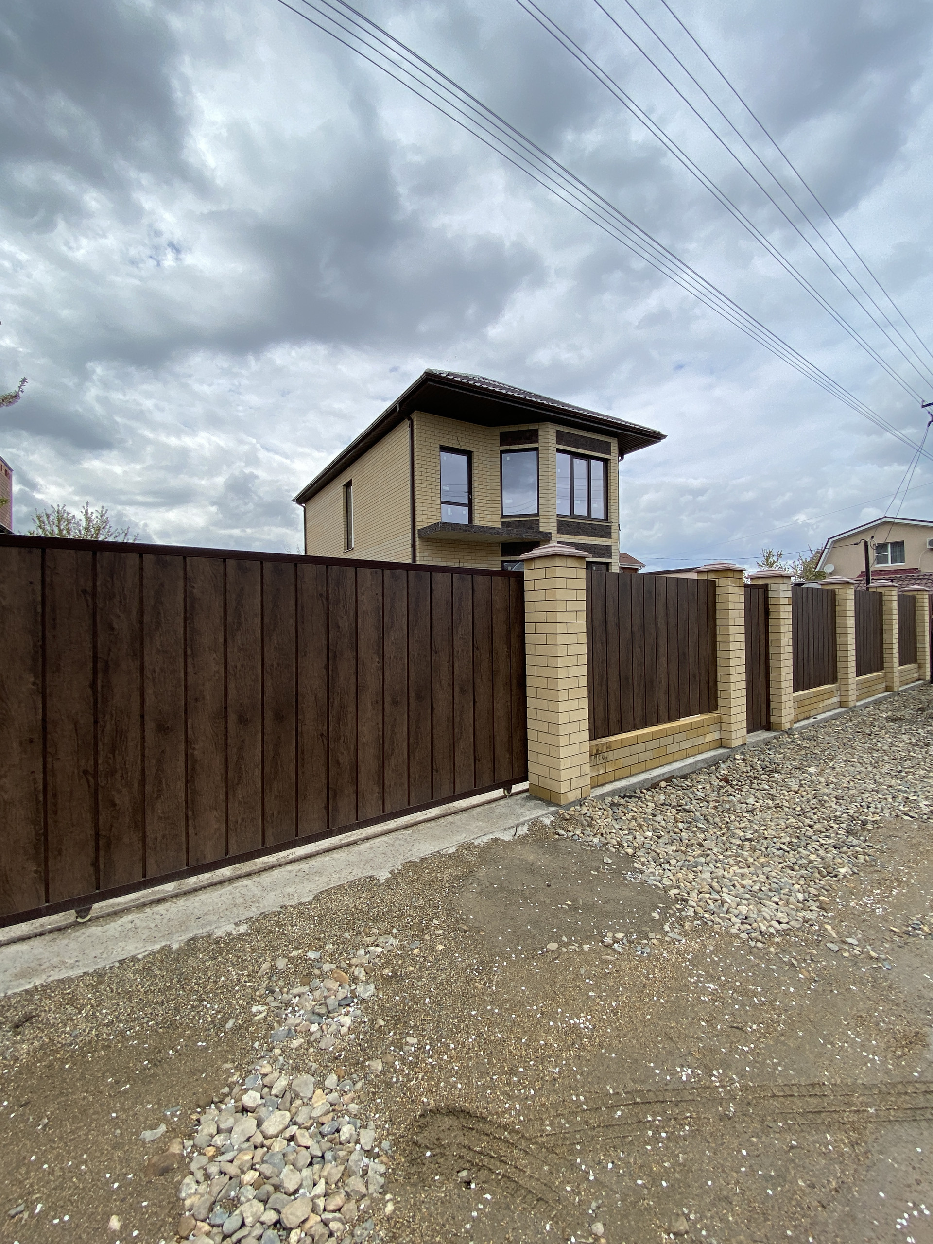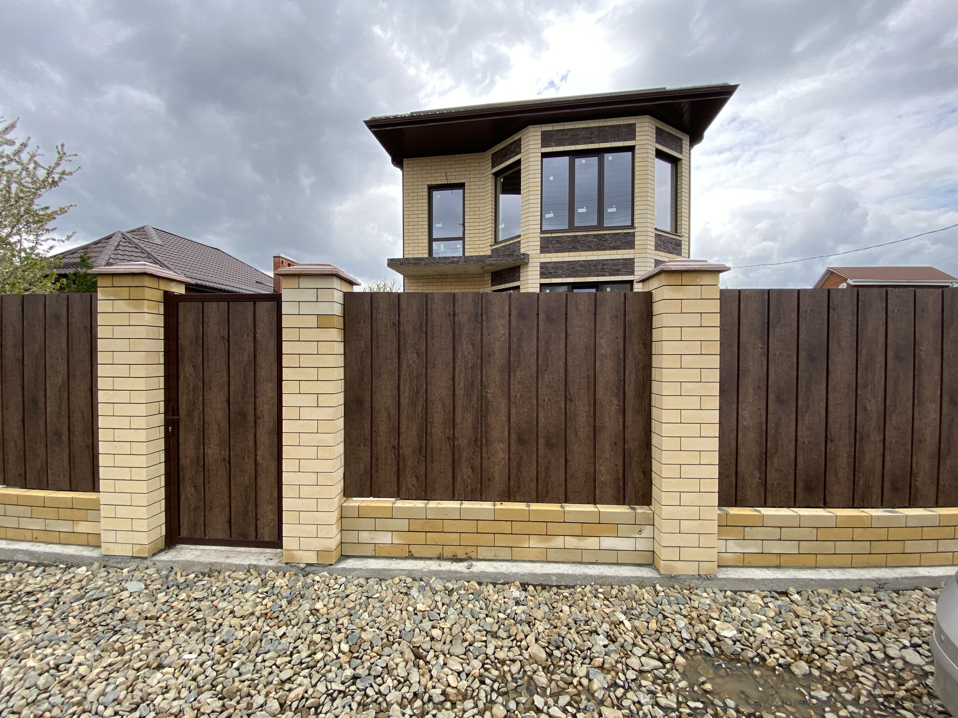 Участок 4 сотки, огорожен по периметру забором, фасад — с кирпичными колоннами, ворота, калитка.