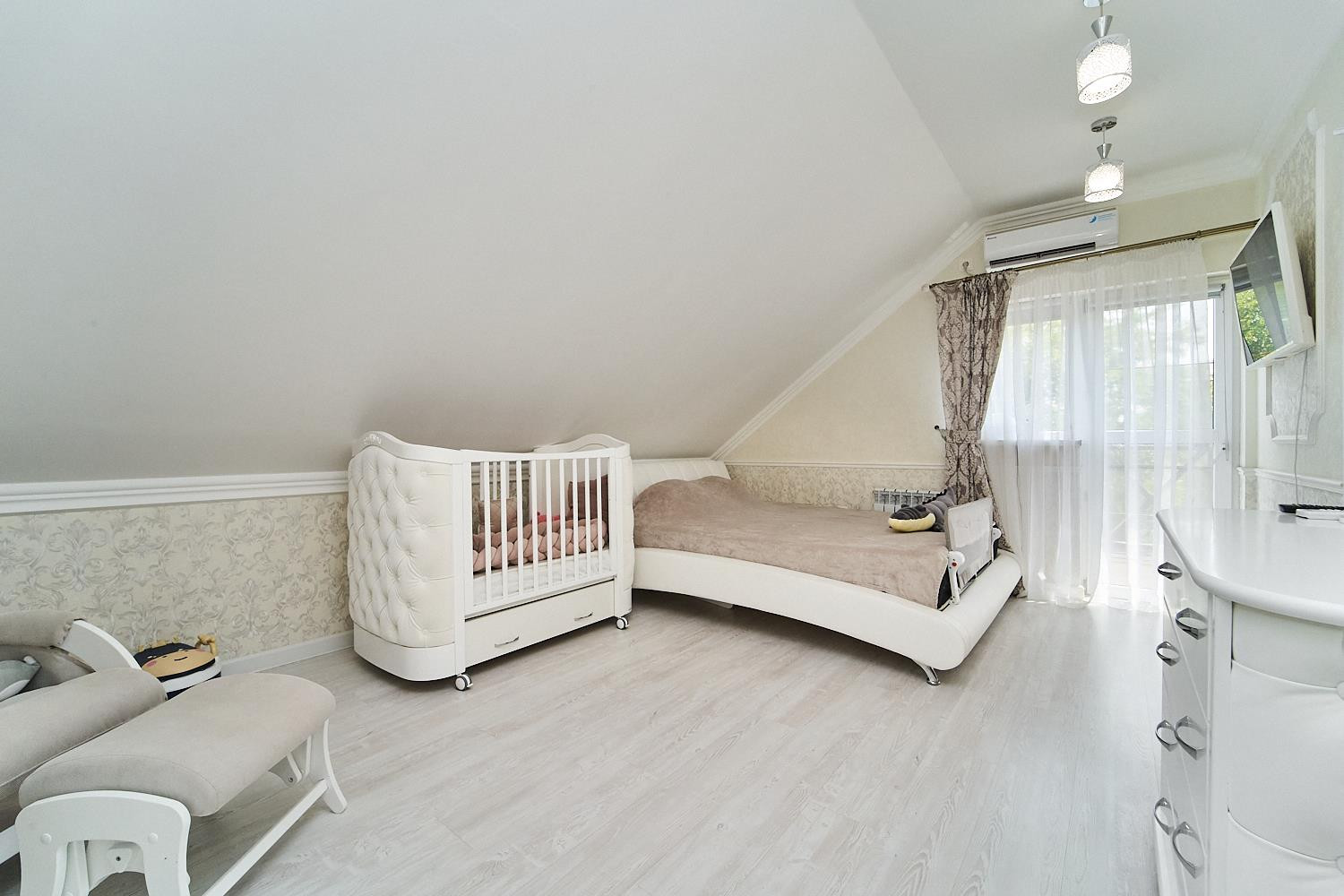 В доме на первом этаже большой зал-холл, гостевая комната, детская комната, кухня и просторная ванная комната.