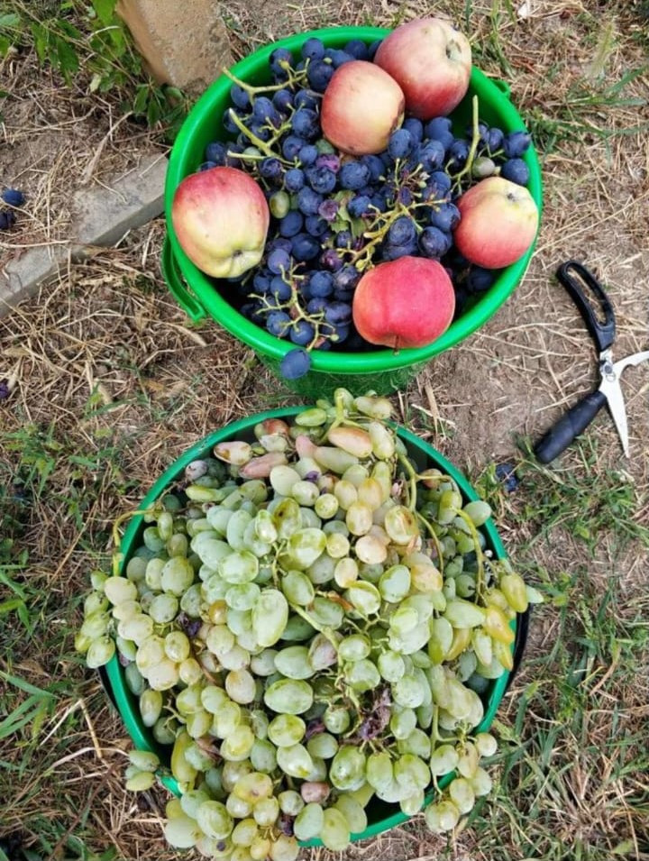В саду имеются взрослые деревья: 2 сорта яблок, абрикос, киви, калина, кизил. 5 сортов лозы винограда.